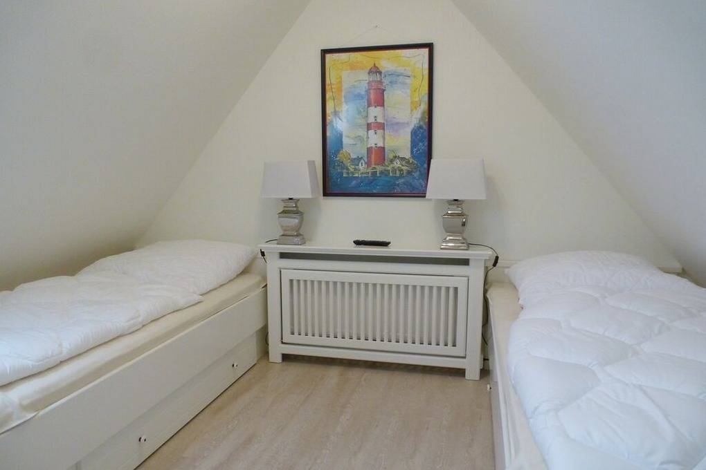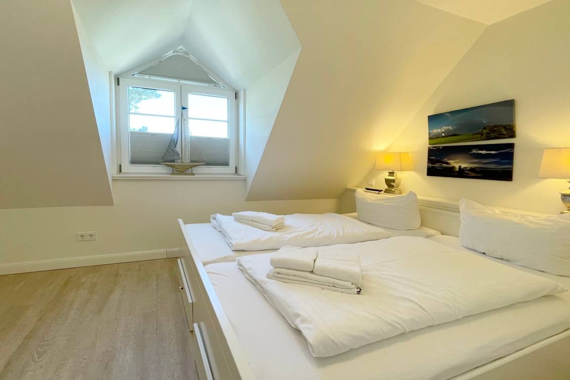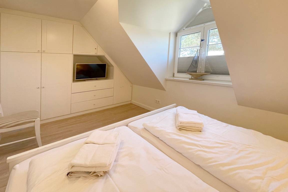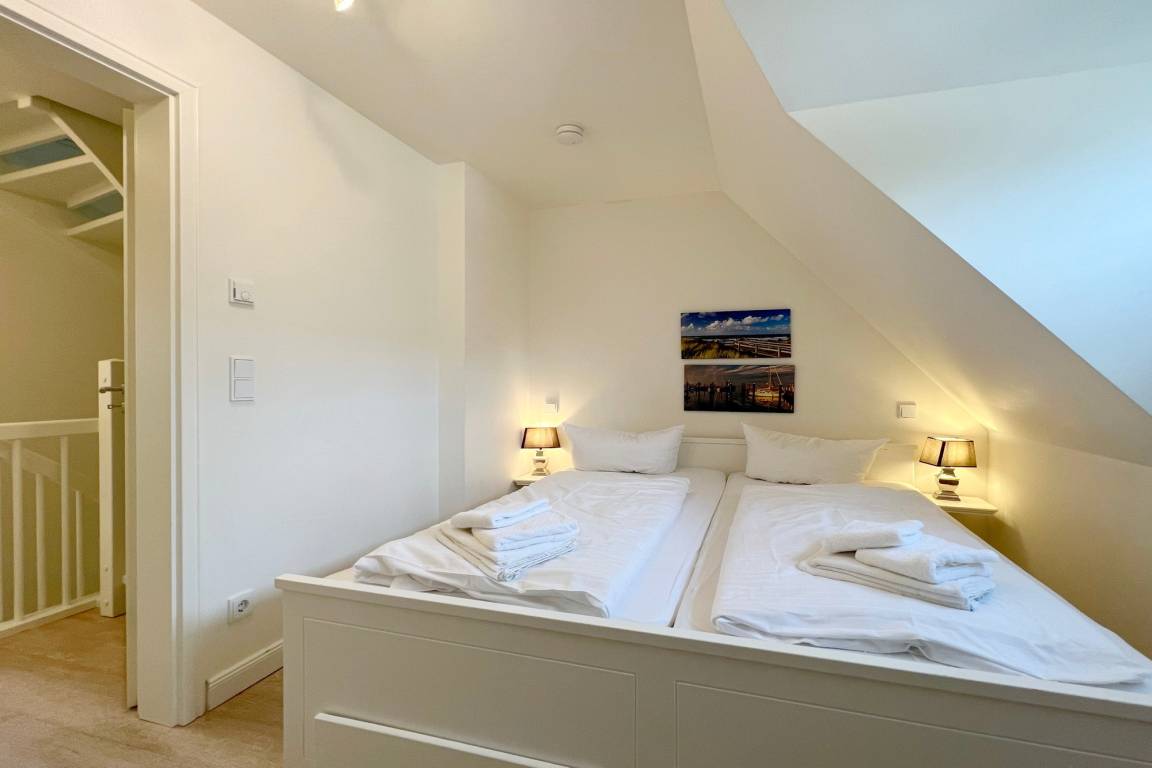 Im OG finden Sie 2 Schlafzimmer mit Doppelbetten und ein zweites Duschbad. Im Spitzboden befindet sich ein weiterer Raum mit einer zusätzlichen Schlafmöglichkeit.