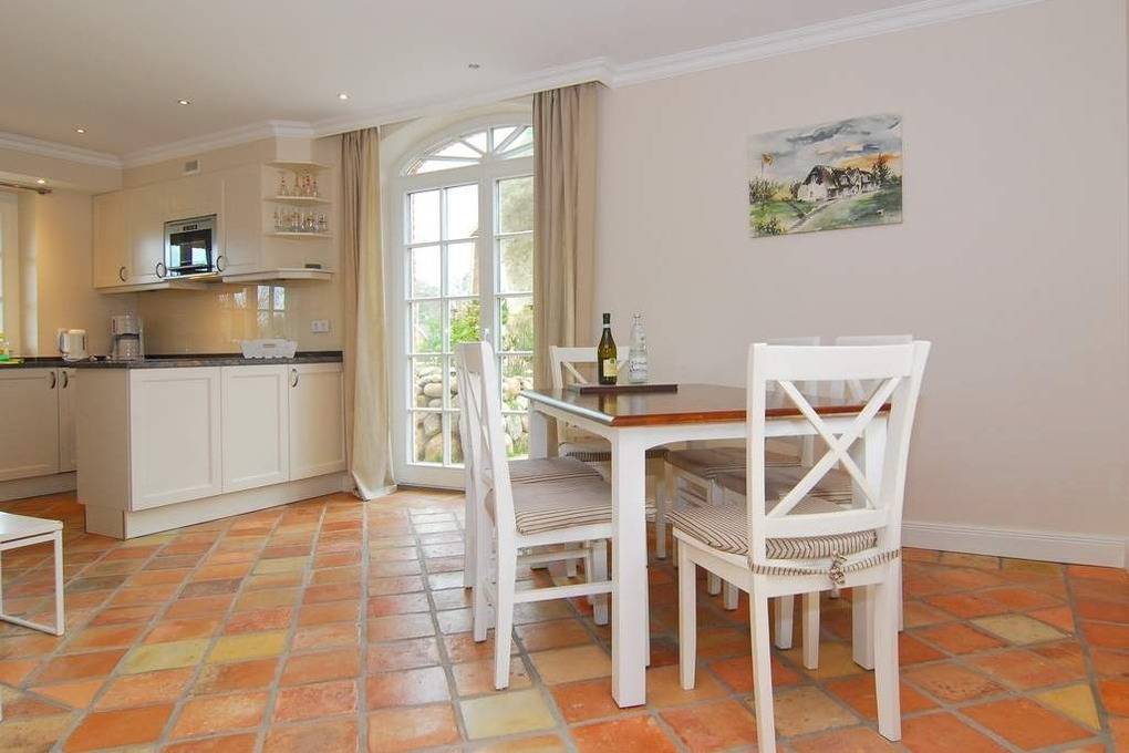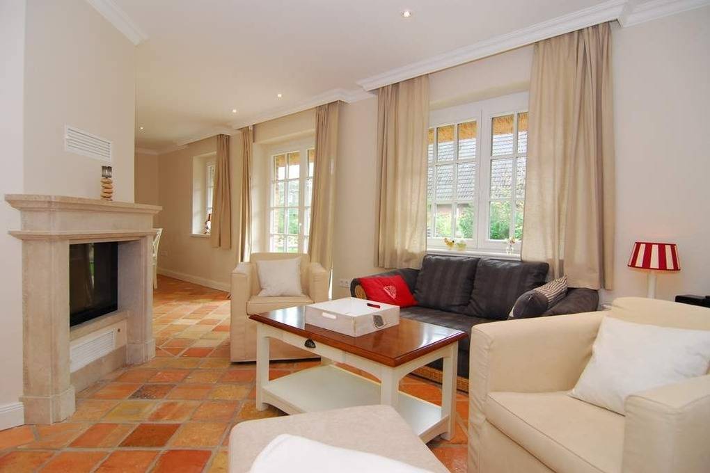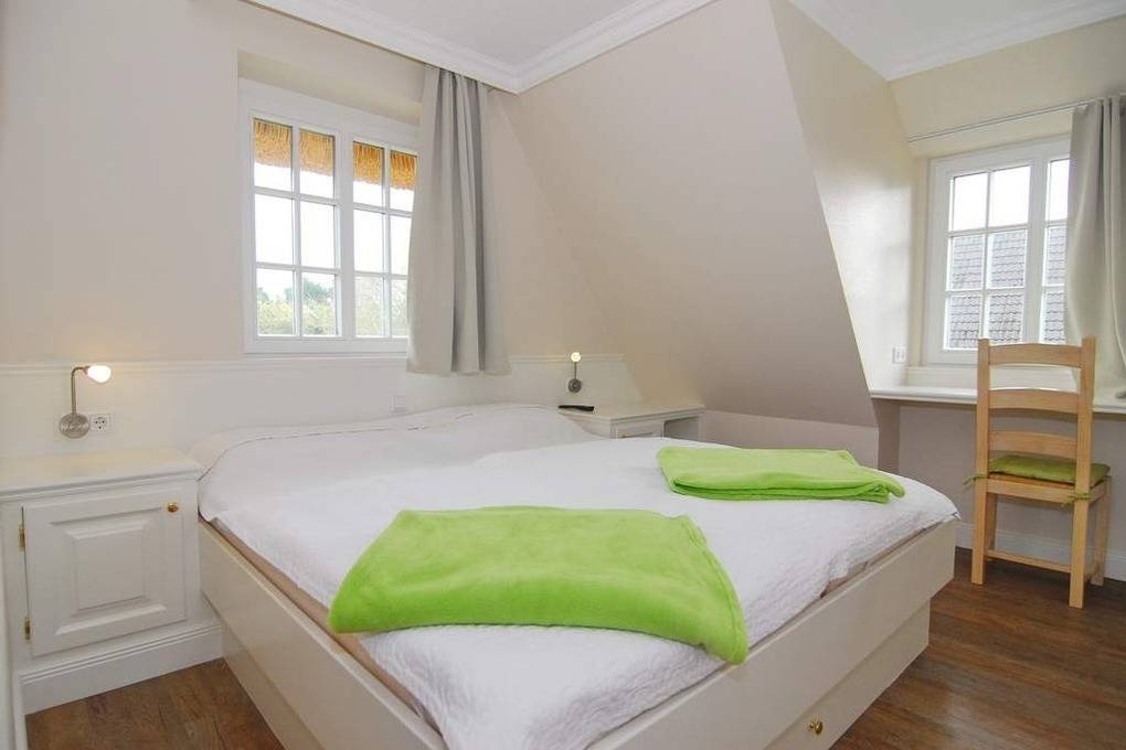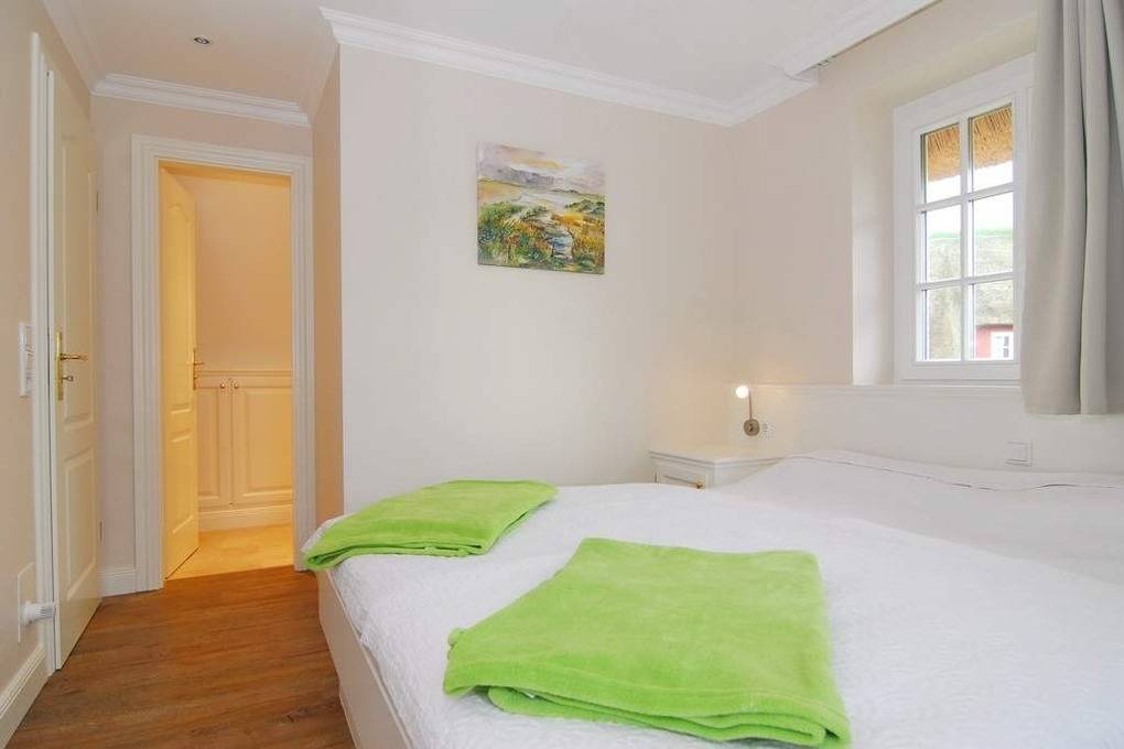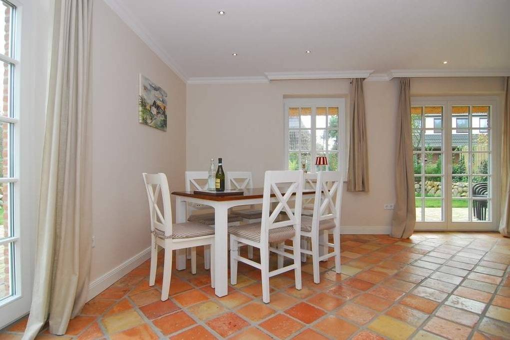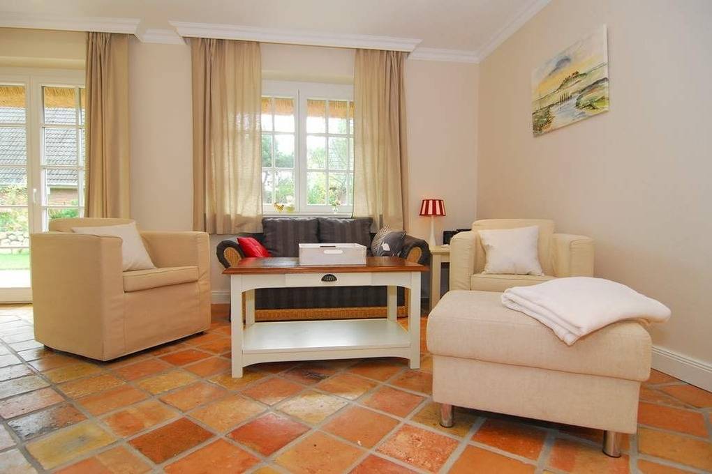 Schönes Ferienhaus / Doppelhaushälfte unter Reet auf sonnigem Südgrundstück. Ca. 113m². EG: gefliestes Wohn- und Esszimmer mit moderner Marken-Einbauküche (GS, Mikrowelle, etc.), schöner Essplatz am Fenster, Couchecke mit Doppelcouch, 2 Sesseln und Hocker, Kamin, WLan, Flat-Screen, Stereoanlage mit CD, Gäste-WC, HW-Raum mit WA/TR, Garderobe. OG: 1 Schlafzimmer mit Doppelbett, Flat-Screen und eigenem Duschbad/WC, 1 weiteres Schlafzimmer mit Doppelbett und Flatscreen sowie 1 Schlafzimmer mit 1,20x2m und Flat-Screen, 1 Vollbad/WC. Zusätzlicher Schrank-/Abstellraum im DG. Große Süd- und Ostterrasse mit Gartenmöbeln. Nichtraucher-Haus! Grillen verboten! Bettwäsche und Handtücher sind zur Anreise aufgezogen. Tierhaltung ist erlaubt, muss bitte angemeldet werden!