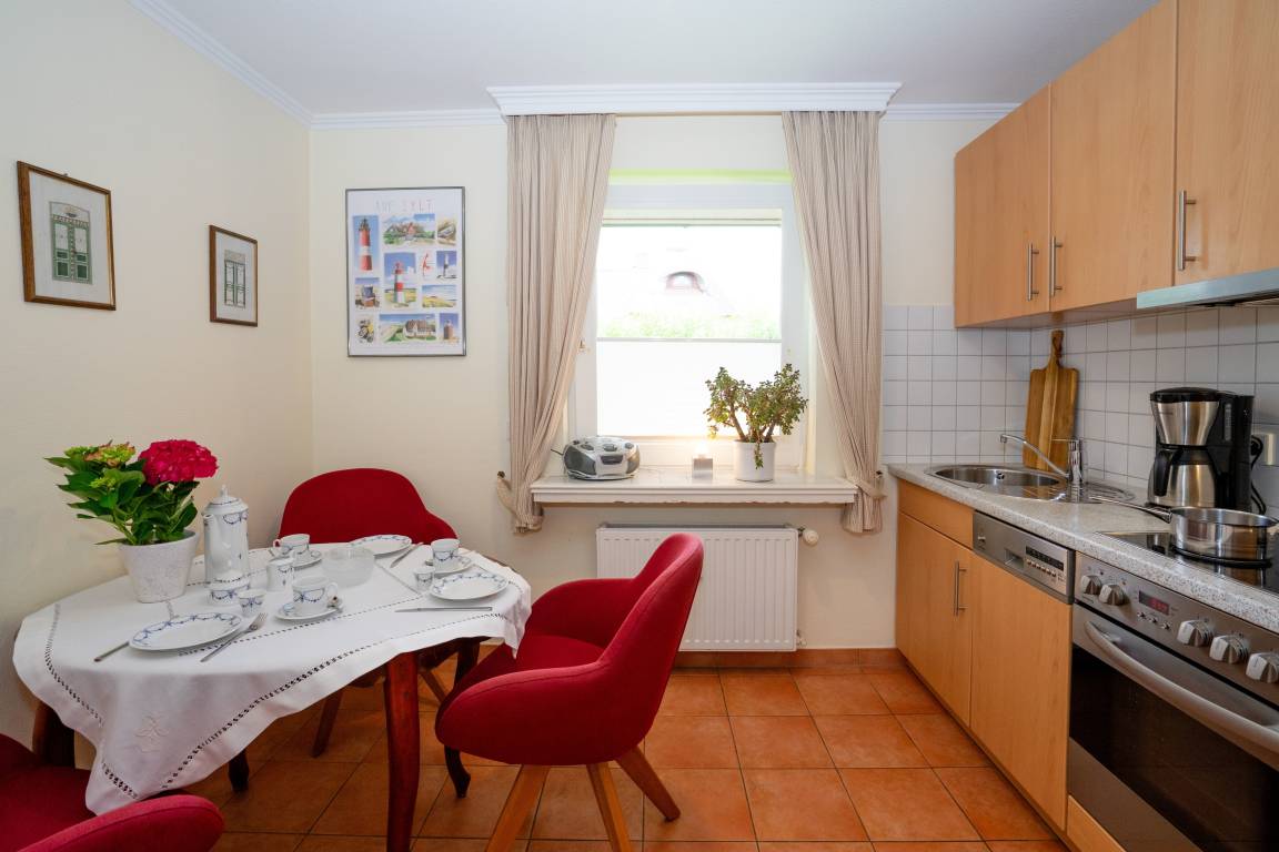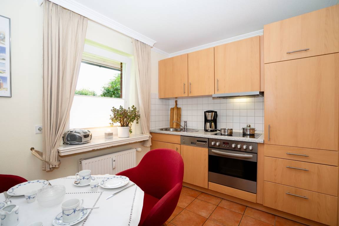 Der helle Wohnbereich lädt zu entspannten Stunden, gemeinsamen Abenden und erholsamen Momenten nach einem Inseltag ein. Die separate Küche mit Essecke ist funktional und gut ausgestattet, sodass Sie Ihre Urlaubstage ganz unkompliziert gestalten können. Ihnen stehen zwei Schlafzimmer zur Verfügung – eines mit Doppelbett und ein weiteres als gemütlicher Schlafraum für eine dritte Person. Das Badezimmer mit Dusche ergänzt den Wohnkomfort auf angenehme Weise.