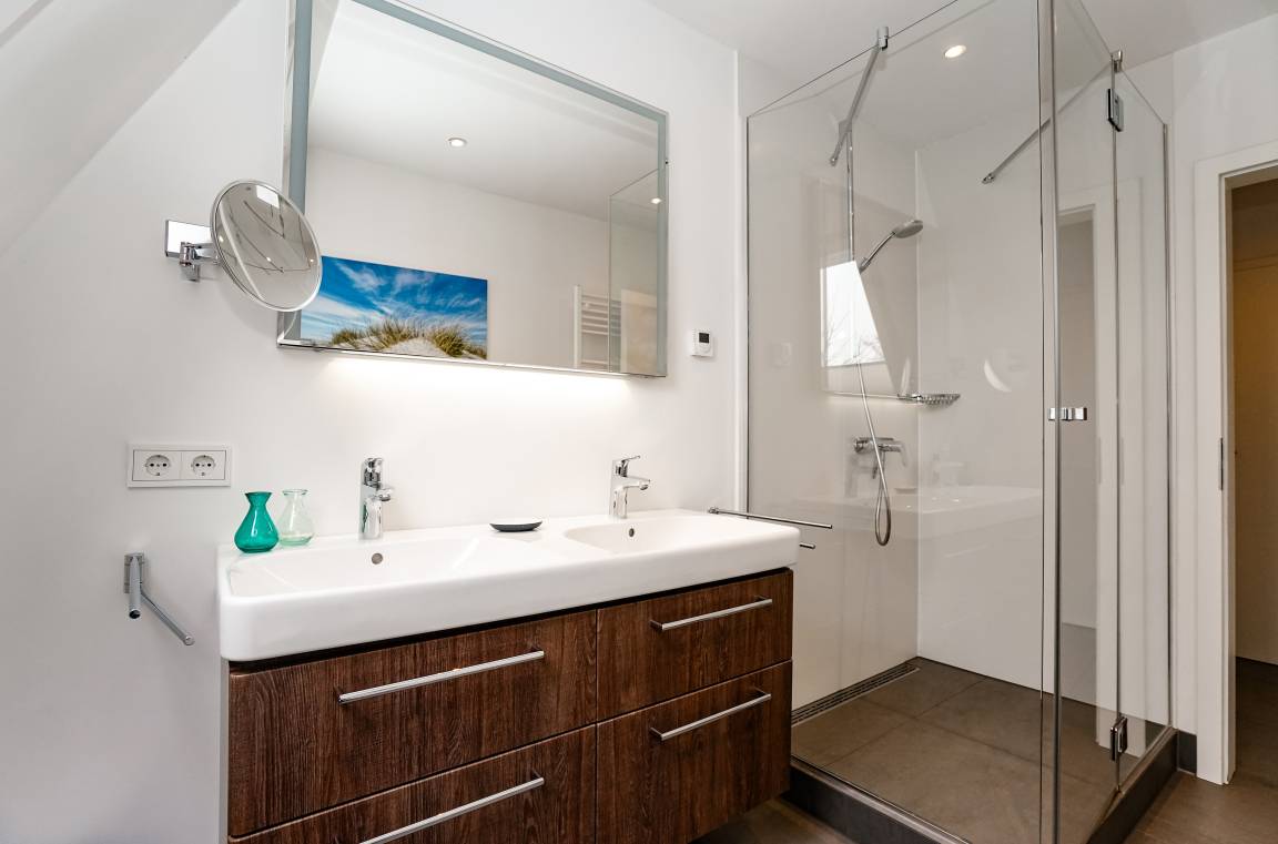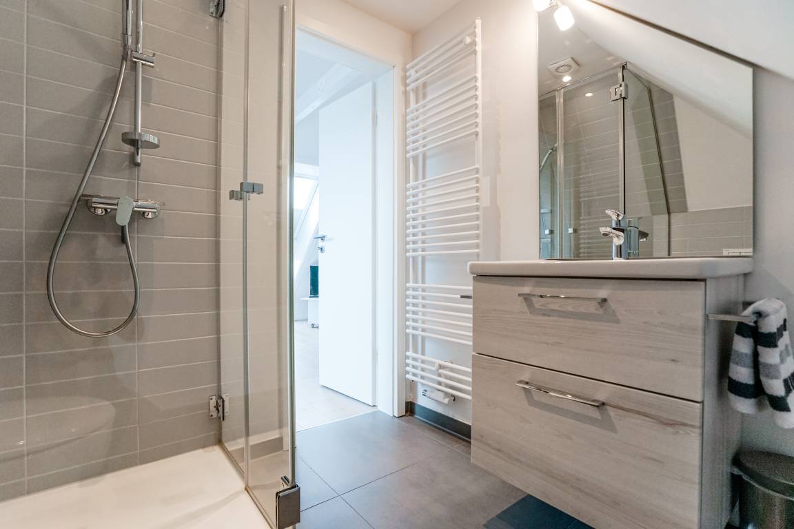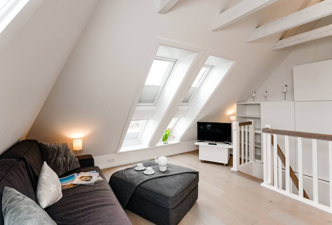Das lichtdurchflutete Wohnzimmer mit offener Küche und gemütlicher Essecke bildet das Herzstück der Wohnung und lädt zu entspannten Stunden, gemeinsamen Mahlzeiten und geselligen Abenden ein. Das Hauptschlafzimmer mit extra langem Doppelbett sorgt für erholsame Nächte, während das charmante Galerie-Schlafzimmer mit zwei Einzelbetten und Schlafcouch viel Flexibilität für Familien oder kleine Gruppen bietet. Zwei moderne Bäder mit Dusche schaffen zusätzlichen Komfort und machen das Appartement auch für mehrere Gäste besonders angenehm.