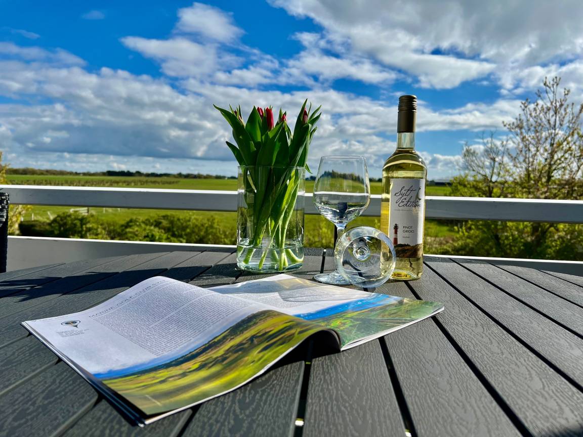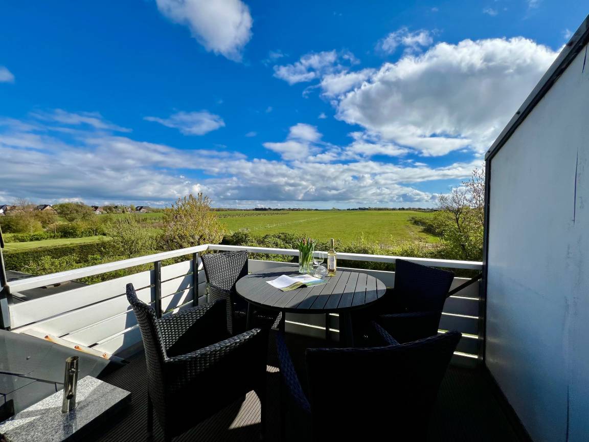 Ein besonderes Highlight ist der große Balkon mit herrlichem Weitblick über die Felder von Morsum. Hier genießen Sie die Ruhe des Sylter Ostens, frische Nordseeluft und entspannte Urlaubsmomente unter freiem Himmel. Für zusätzliche Erholung steht Ihnen außerdem die hauseigene Gemeinschaftssauna im Untergeschoss kostenfrei zur Verfügung. Auch eine Waschmaschine sowie ein PKW-Stellplatz machen Ihren Aufenthalt angenehm und unkompliziert.