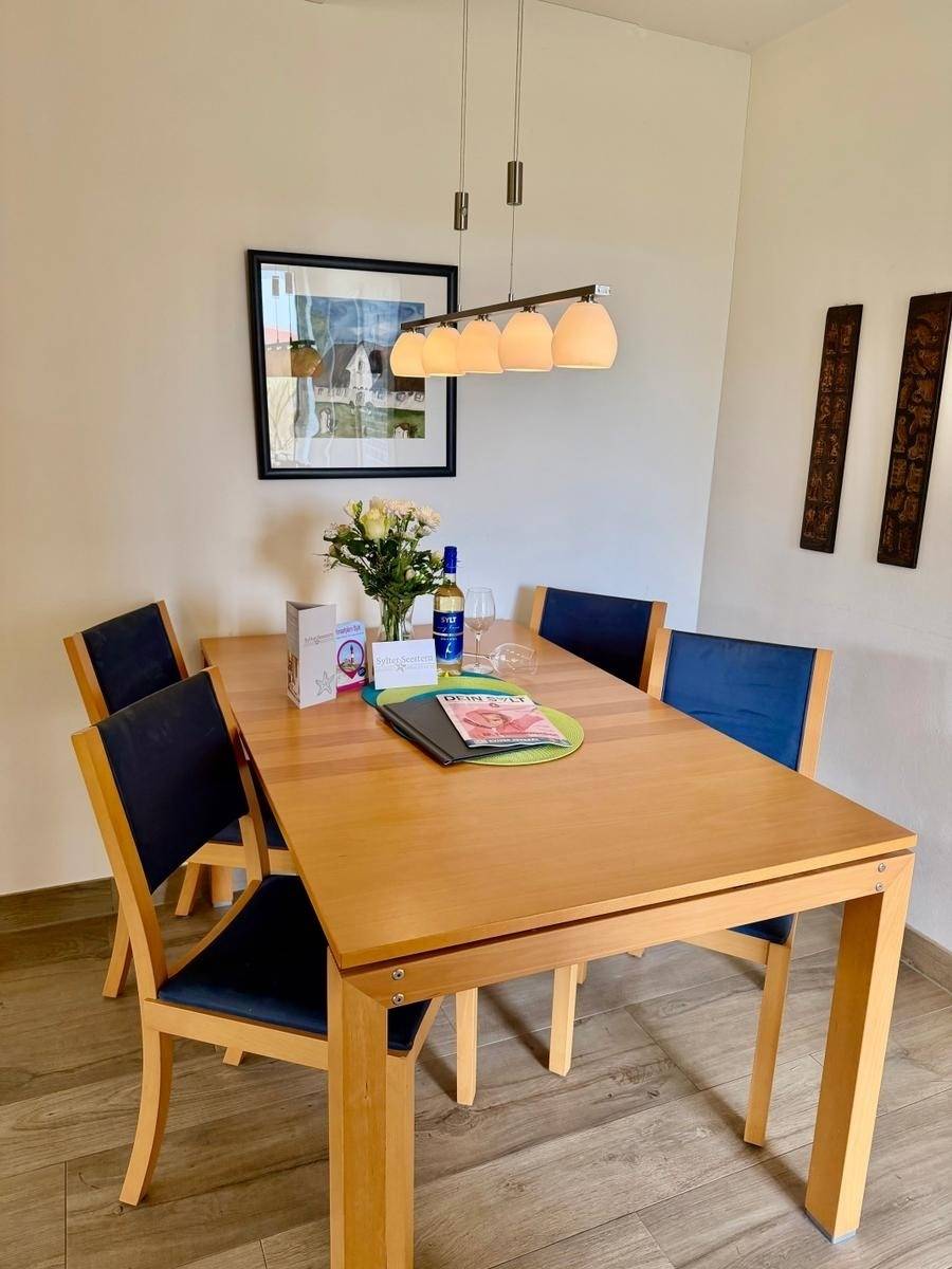 Der großzügige Wohn- und Essbereich lädt zu gemeinsamen Mahlzeiten und entspannten Stunden nach einem erlebnisreichen Inseltag ein. Ein Sofa und ein bequemer Sessel sorgen für zusätzlichen Komfort. Die Küche mit Spülmaschine macht den Aufenthalt angenehm unkompliziert. Über eine Wendeltreppe gelangen Sie ins Obergeschoss mit drei gemütlichen Schlafzimmern – perfekt für Familien oder Gäste, die gerne etwas mehr Platz genießen. Das moderne Bad im Erdgeschoss ist mit einer ebenerdigen Dusche ausgestattet.