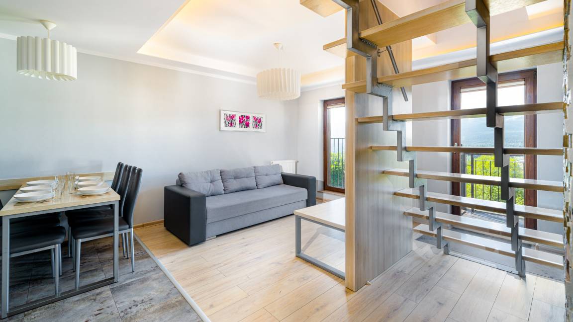 Der Vorteil des Objekts ist seine einzigartige, einnehmende Lage. Es befindet sich in der Nähe des Waldes und an einem durchfließenden Bach. Von hier aus erstreckt sich eine wunderschöne Aussicht aufs Gebirge. Der Komplex wurde so gestaltet, um sich dem Stil der wunderbaren Bergortschaften anzupassen. Es besteht aus zwei (langfristig drei) separaten Gebäuden, die sich voneinander nicht unterscheiden, wenn es um die Architektur geht.