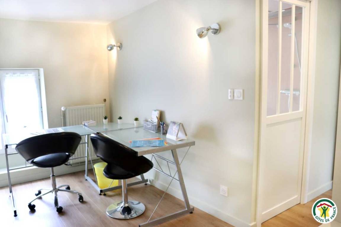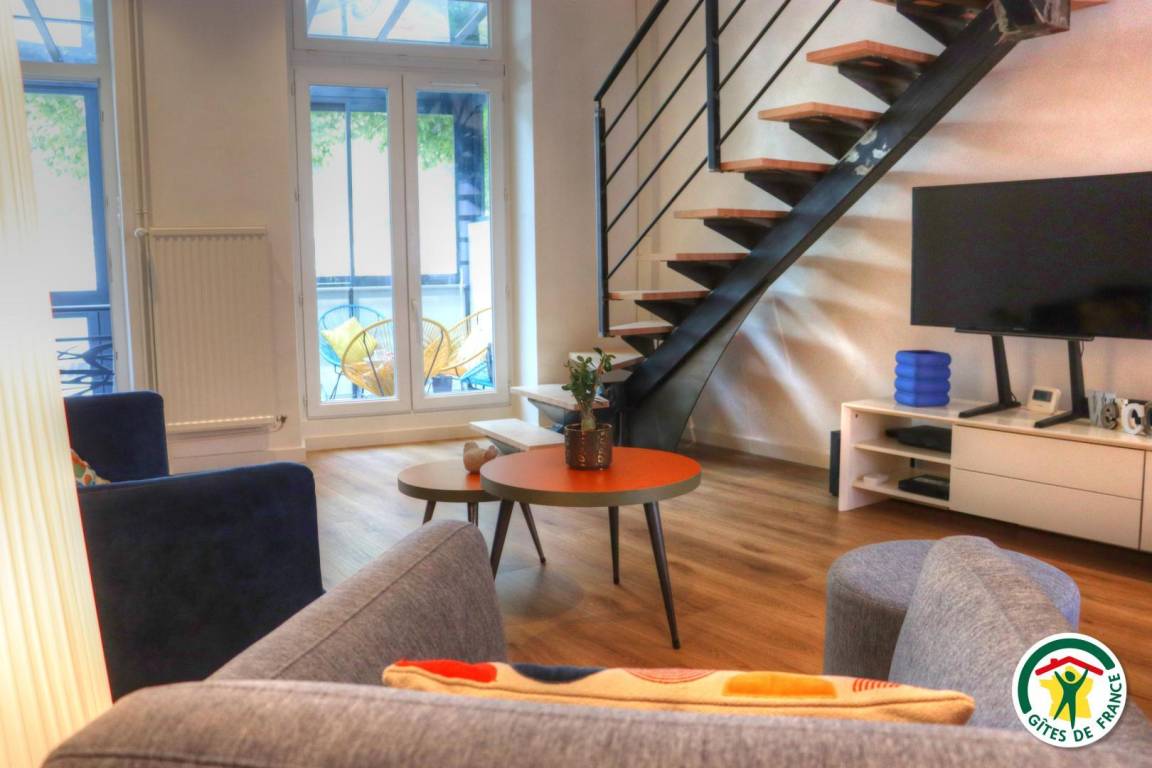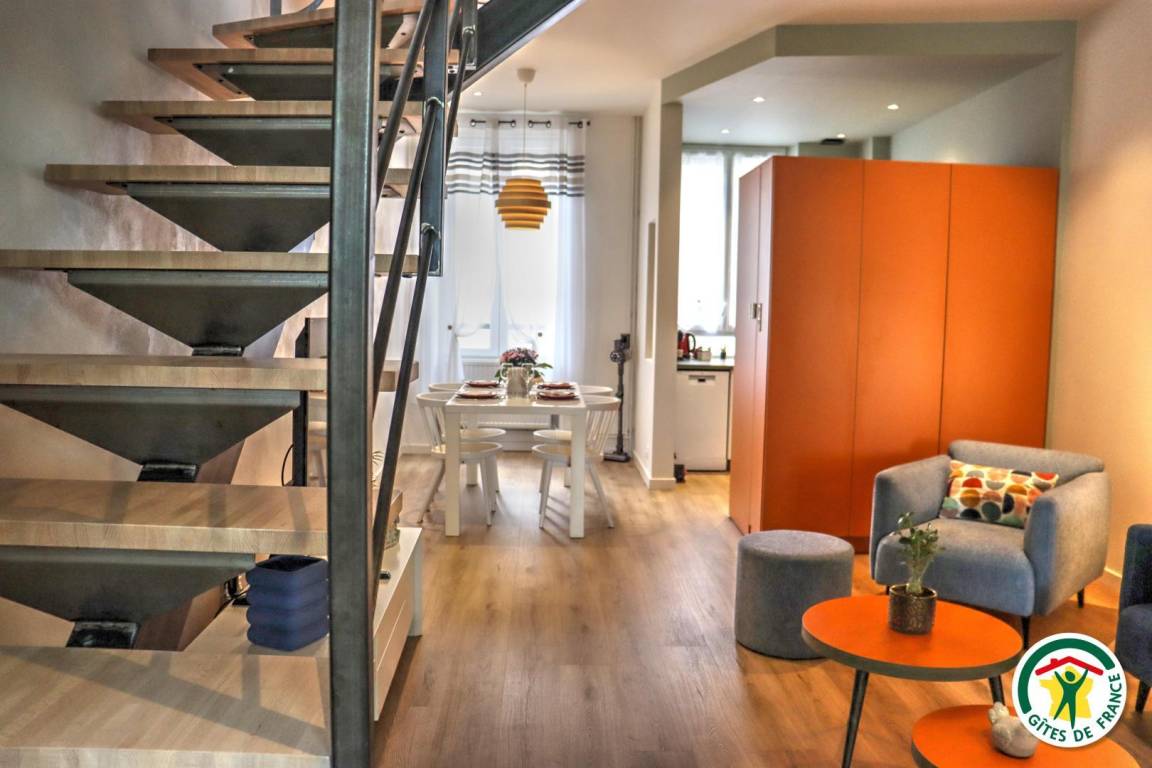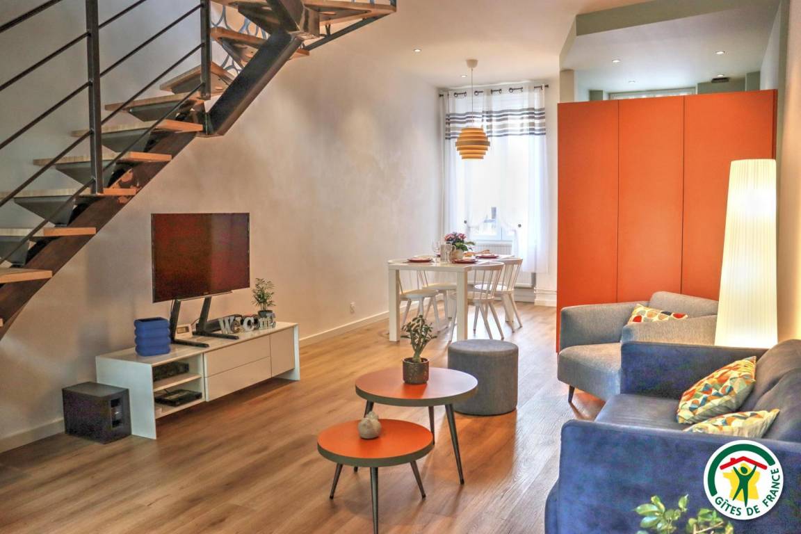 Ferienunterkunft im Stadtzentrum auf 3 Etagen mit Zugang über eine kleine Außentreppe. Großes Wohnzimmer mit Küchenzeile im Erdgeschoss. 1. Stock: TV- und Home-Cinema-Raum mit Schlafzimmer (1 Bett 140 x 190 cm), eigenes Badezimmer und WC. 2. Stock: 1 Arbeitszimmer mit Gesellschaftsspielen und 2. Schlafzimmer (1 Bett 140 x 190 cm), eigenes Bad (Dusche) mit WC.