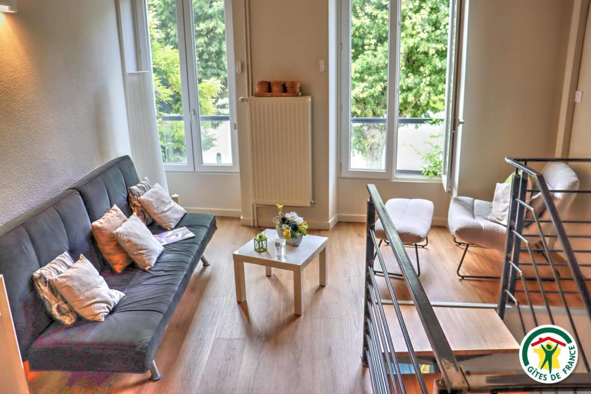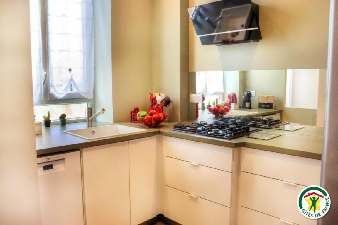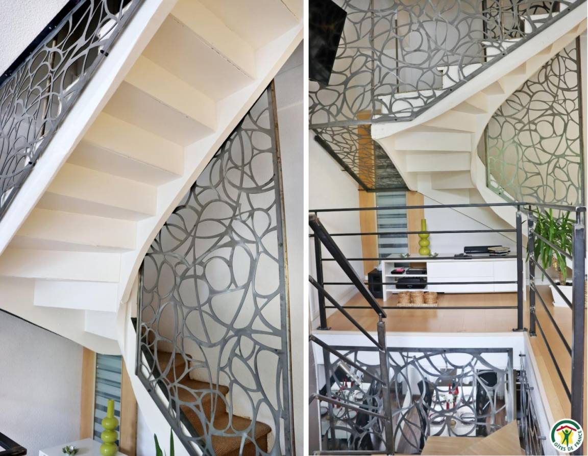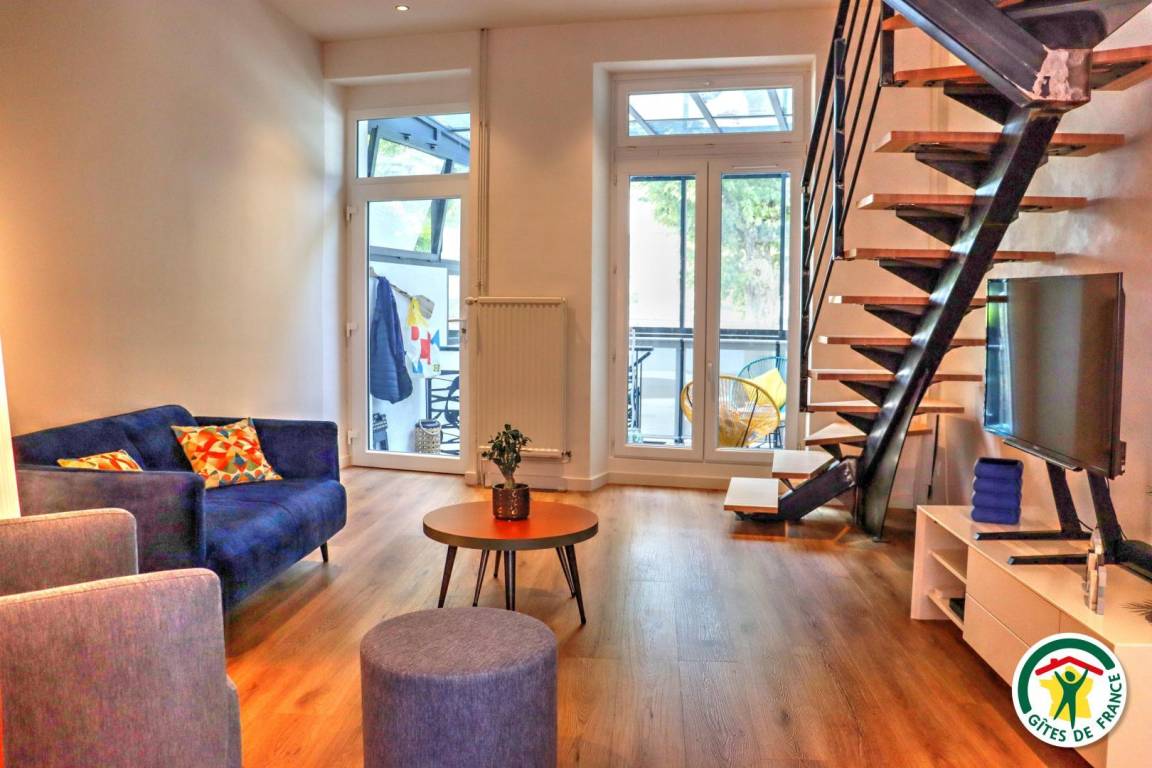 Ferienunterkunft im Stadtzentrum auf 3 Etagen mit Zugang über eine kleine Außentreppe. Großes Wohnzimmer mit Küchenzeile im Erdgeschoss. 1. Stock: TV- und Home-Cinema-Raum mit Schlafzimmer (1 Bett 140 x 190 cm), eigenes Badezimmer und WC. 2. Stock: 1 Arbeitszimmer mit Gesellschaftsspielen und 2. Schlafzimmer (1 Bett 140 x 190 cm), eigenes Bad (Dusche) mit WC.