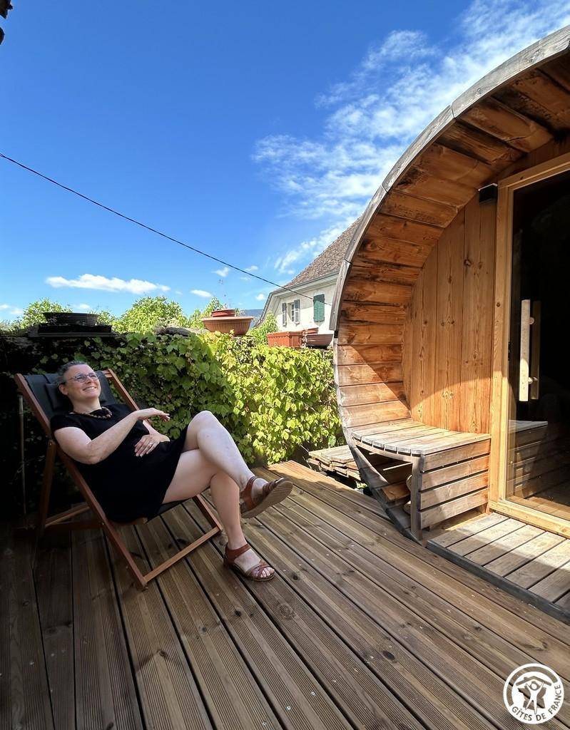 „Hôte très accueillant et disponible. Le jardin est super avec sa superbe terrasse, sauna et spa pour se détendre. Le gite est spacieux, décoré avec goût, la literie confortable.“