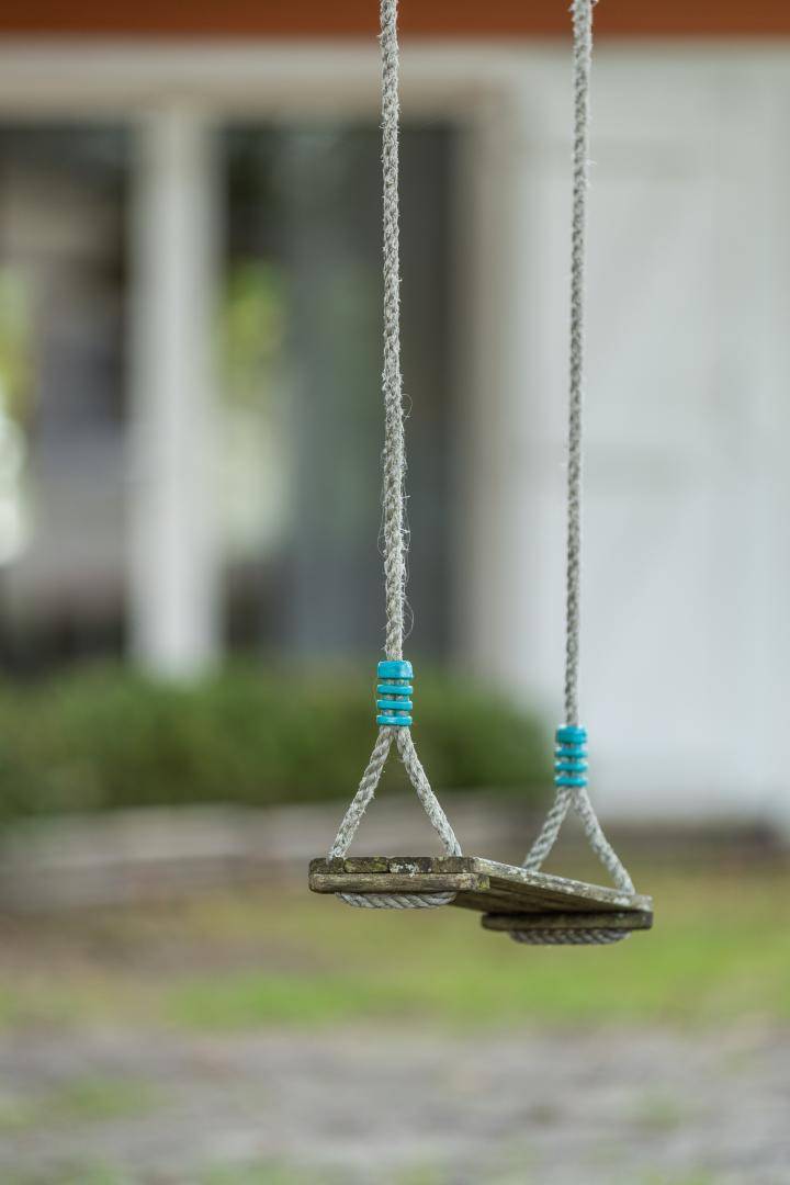 Gartenmöbel, fest installierter Grill und Schaukel.