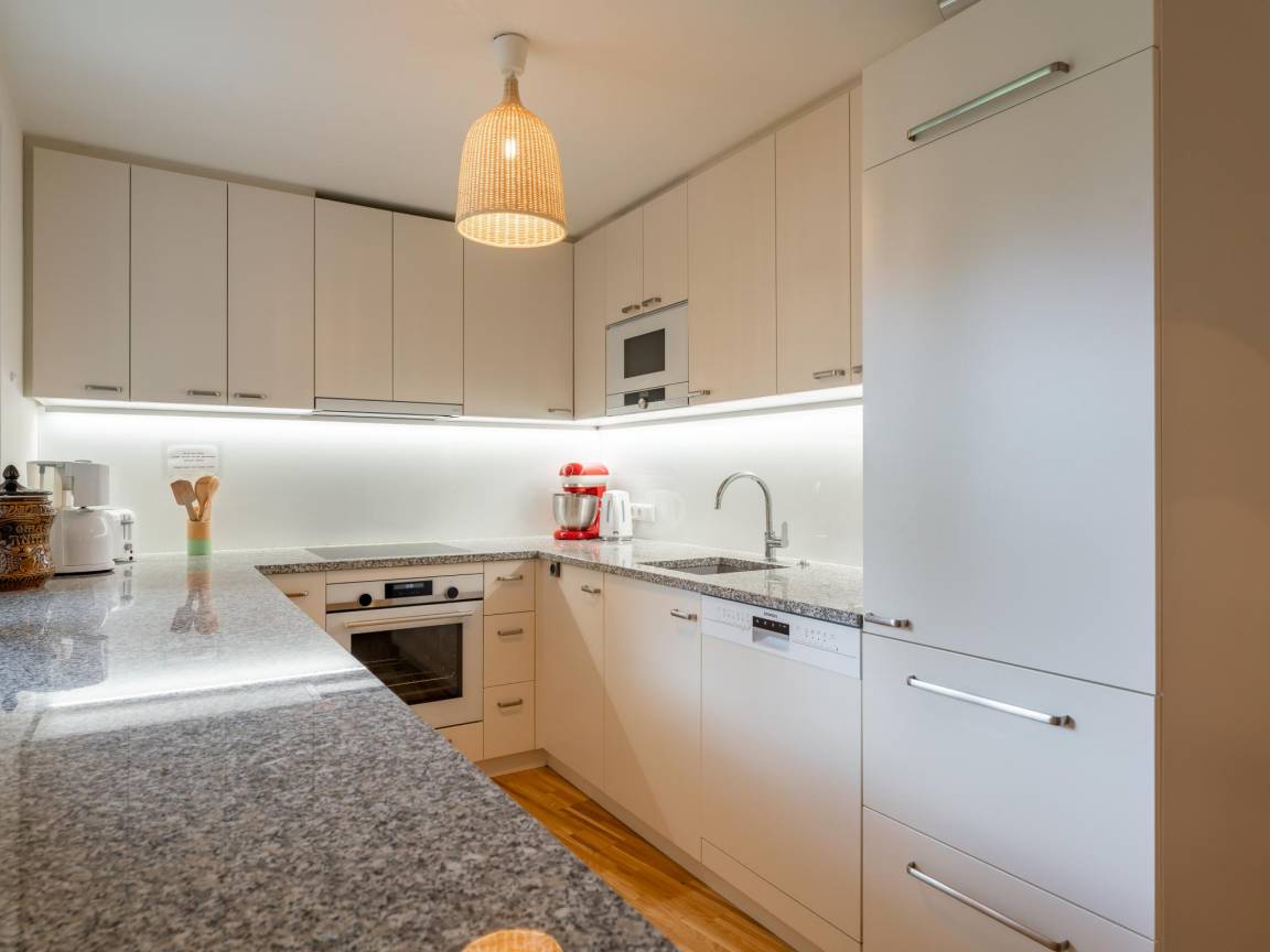 „Ein sehr schöne und geräumige Wohnung mit vielen Extras. Zwei Parkplätze und jede Menge Stauraum in der Wohnung. Die Küche ist sehr groß und großartig ausgestattet. Die Schlaffzimmer sind sehr groß und schön eingerichtet.“