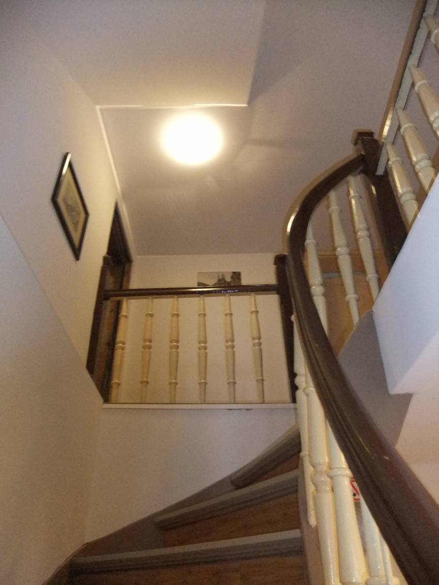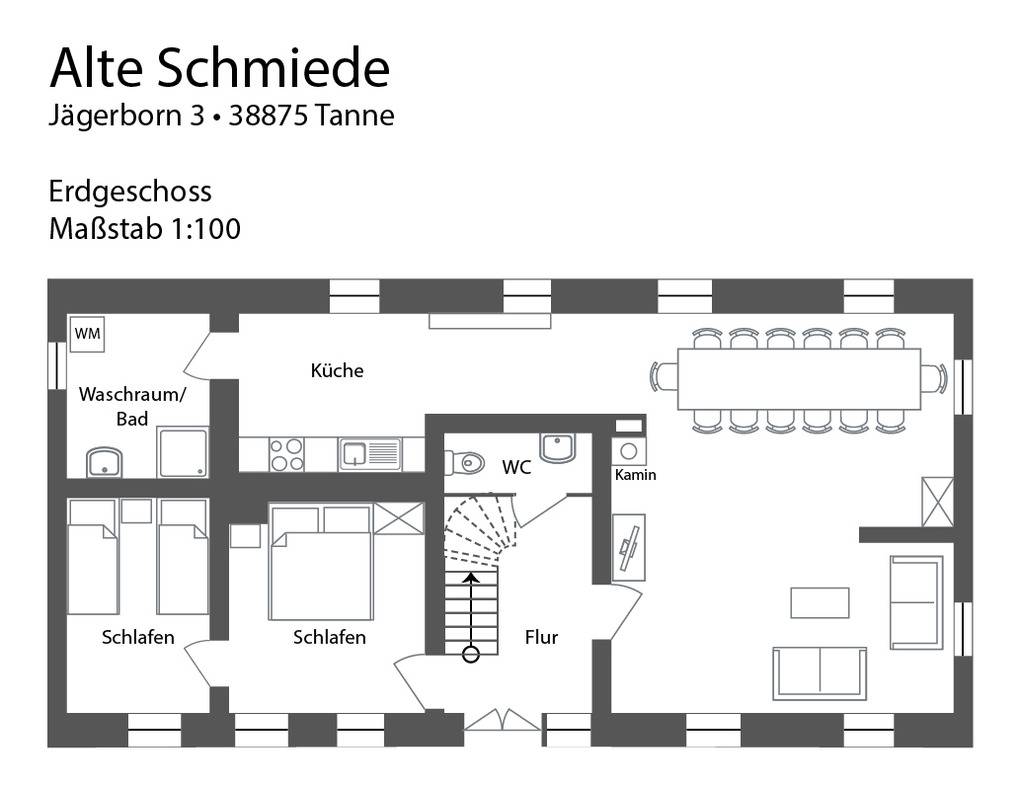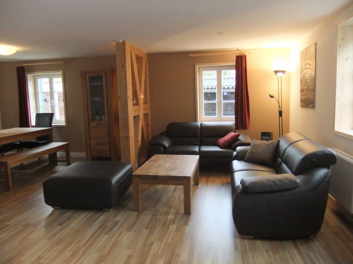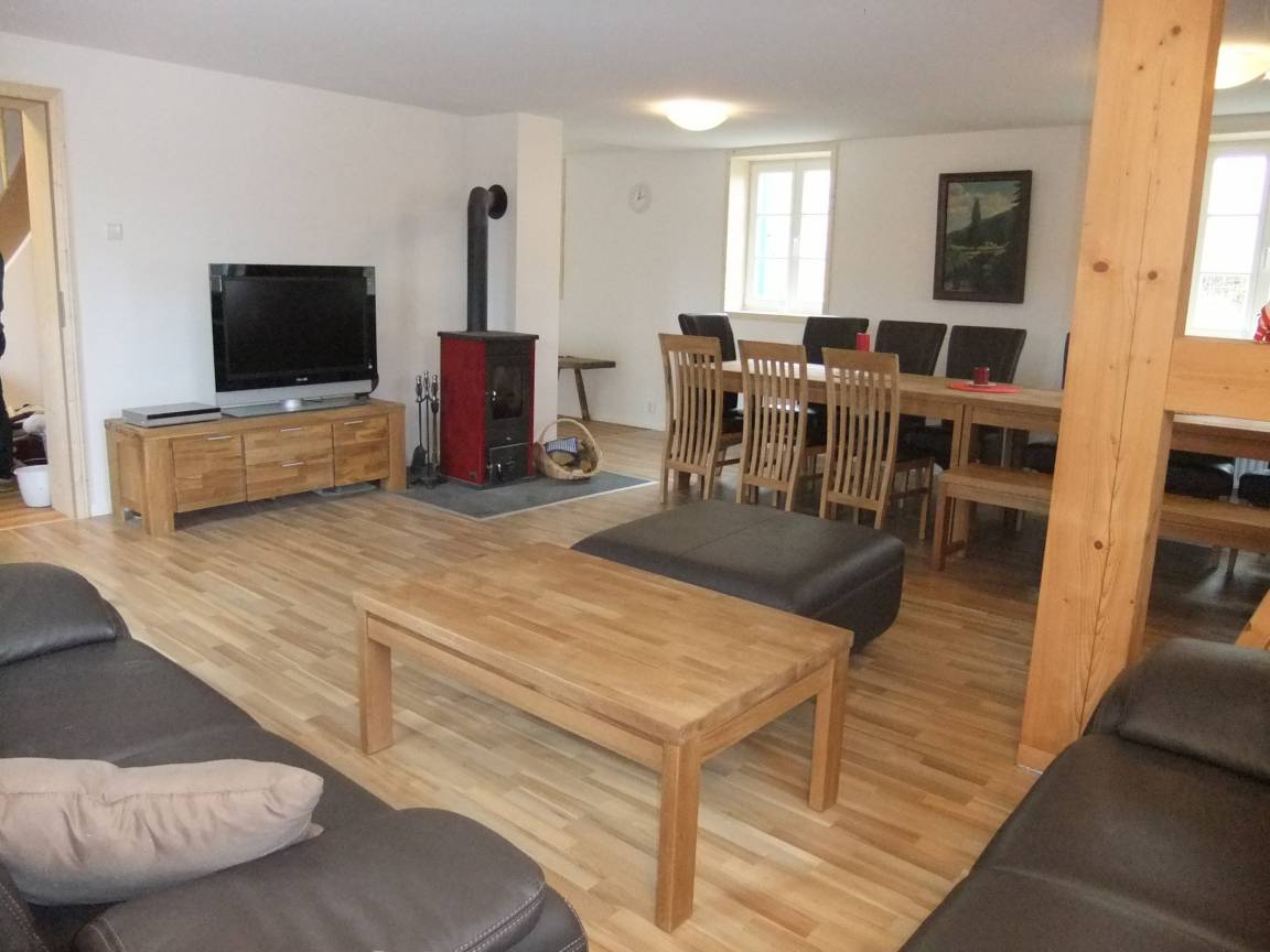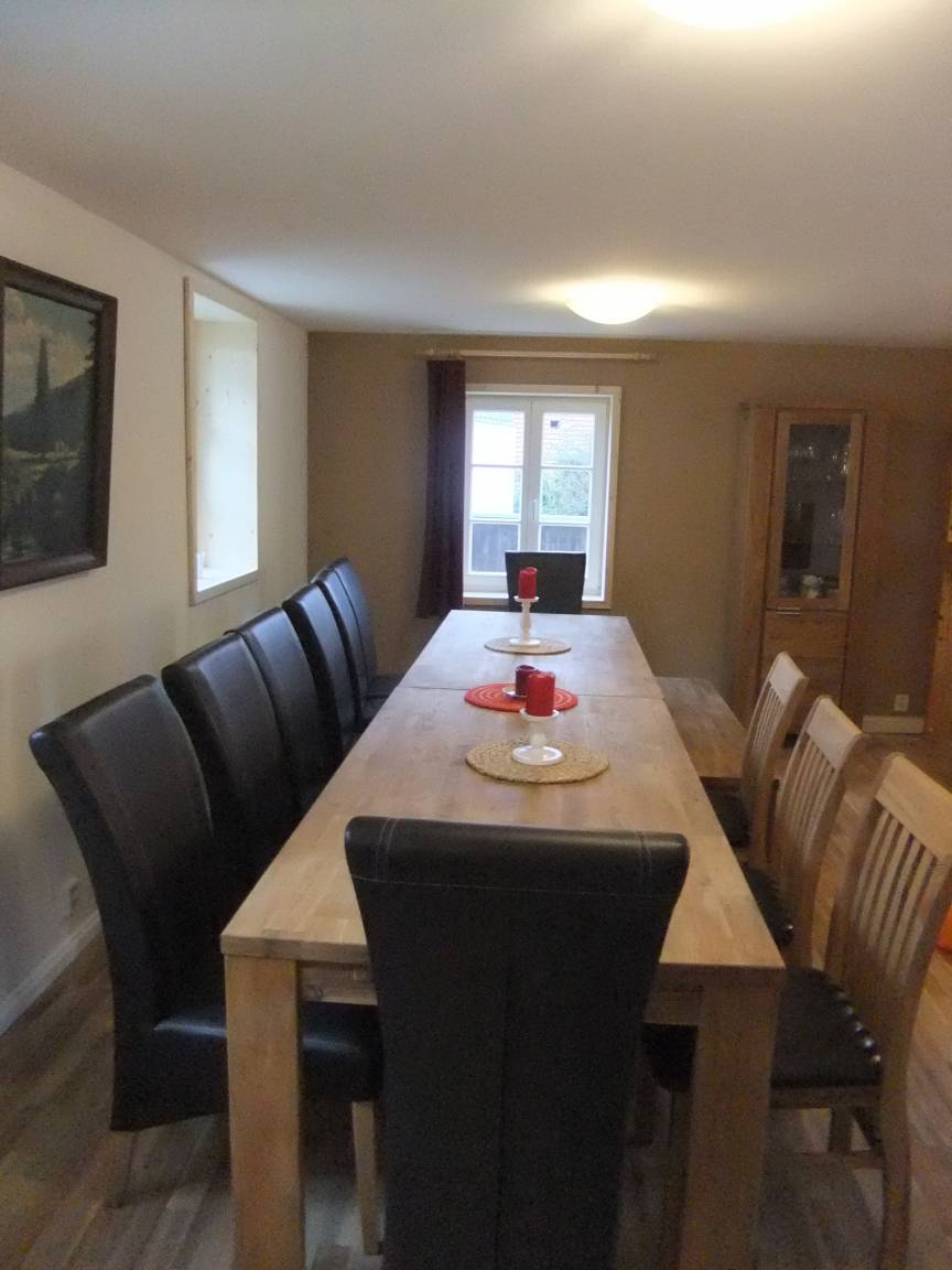 Im Erdgeschoss befindet sich das große helle Wohnzimmer mit Kamin , Fernseher, Sitzecke und Esstisch (14 Personen). Hier schließt sich die neue Küche mit Gschirrspüler, Backofen, 4 Heizplatten, Toaster Kaffeemaschine, Wasserkocher, Geschirr u.a an.