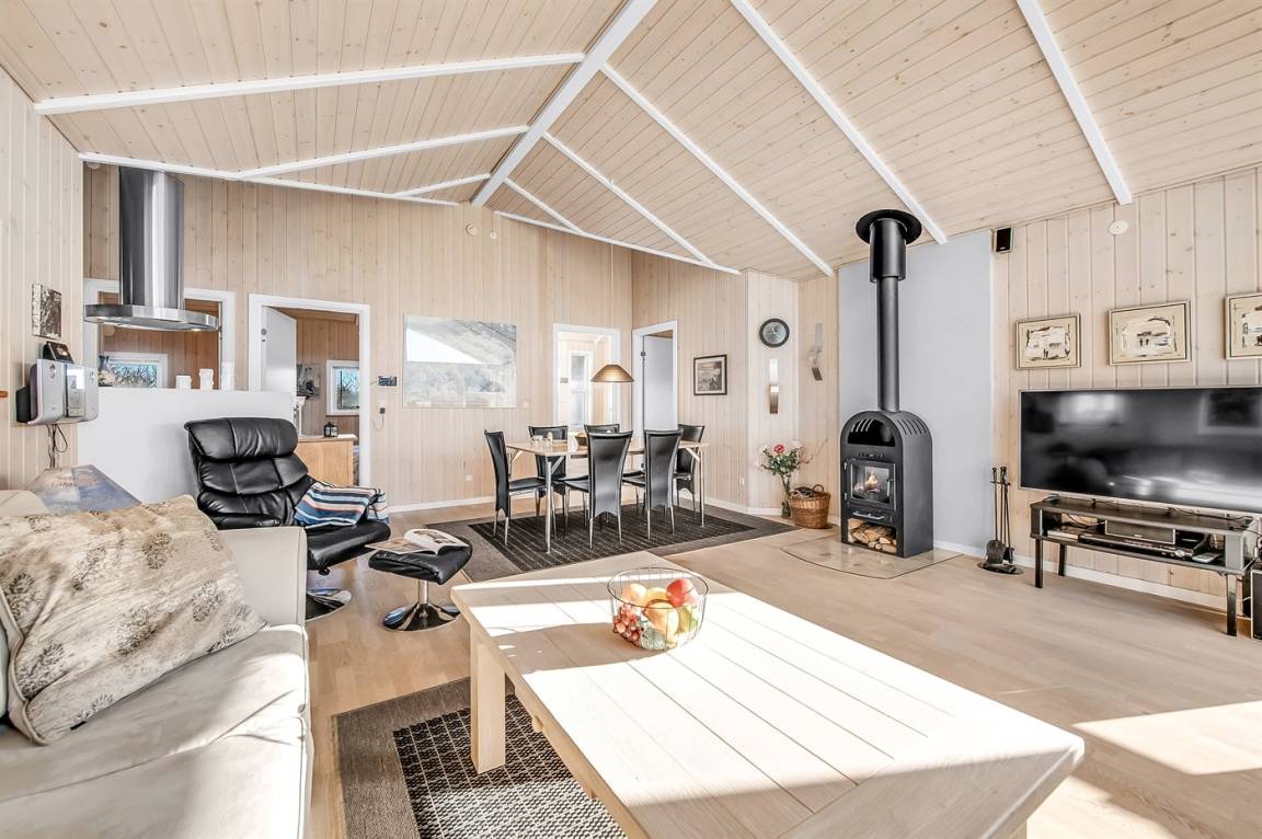 DraußenDie Ferienunterkunft liegt auf einem 1282 m² großen Naturgrundstück. Die Entfernung zum Fjord beträgt 800 m. Die nächste Einkaufsmöglichkeit liegt 700 m entfernt. Es steht ein offenes Terrassenareal zur Verfügung. Außerdem gibt es überdachte Terrasse. Parkplatz auf dem Grundstück.