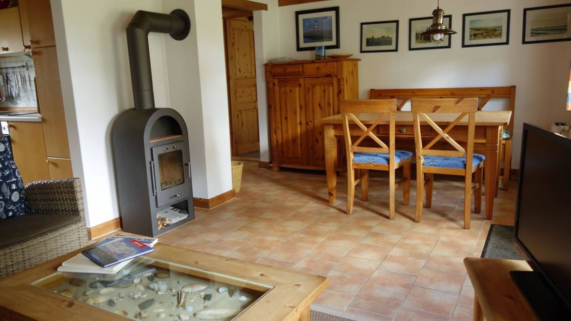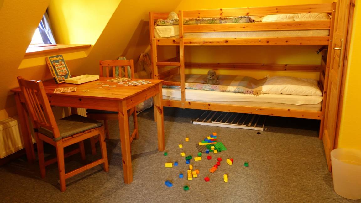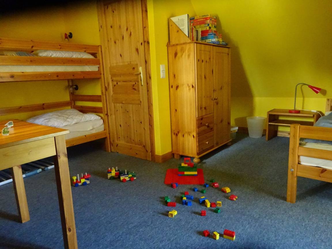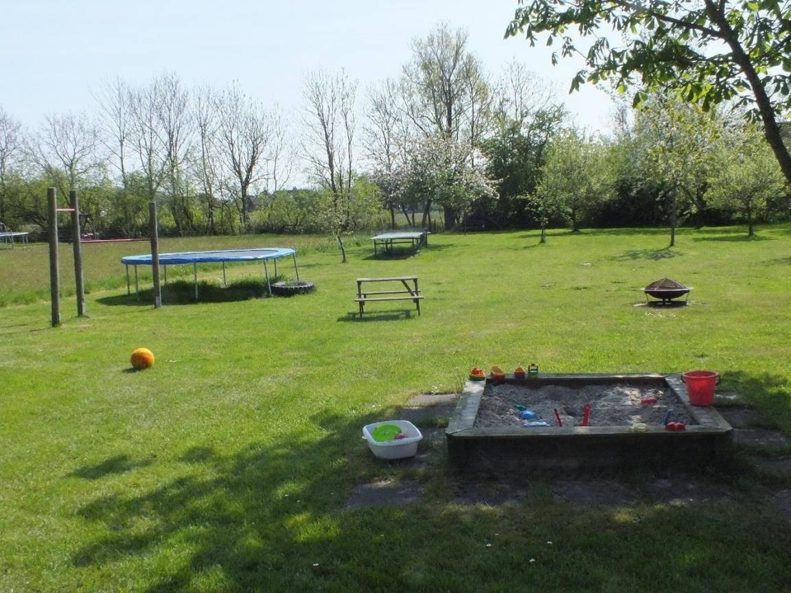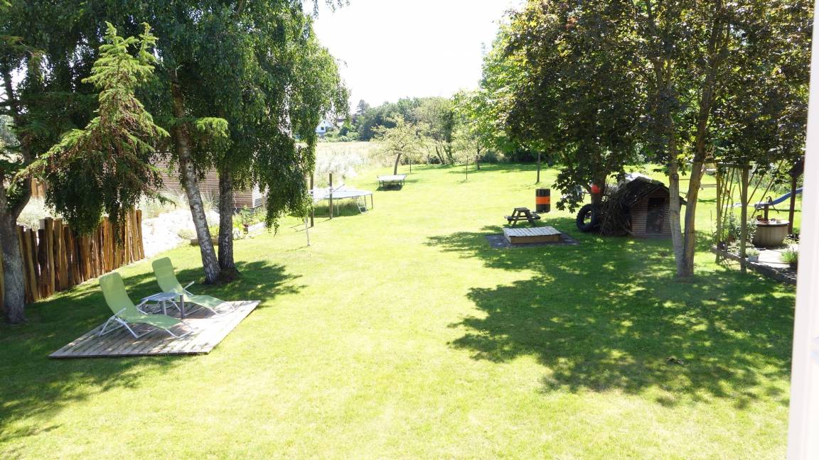 Essplatz. Das Küchenzubehör und Besteck ist für 5 Personen vorhanden. Im Anschluss daran liegt der Wohnbereich mit Sofa, Couchtisch, zwei Rattanstühlen und dem großen Essbereich. Ein besonderes Plus ist der Kaminofen. Sie haben von hier einen direkten Zugang zur möblierten Terrasse (rechte Hälfte - siehe Foto) , sowie dem 1800 qm großen Garten mit Schaukel, Sandkiste und Trampolin. Weiter befindet sich im EG das Elternschlafzimmer mit einem Doppelbett (Platz für ein Kinderreisebett ist vorhanden). Auch das Duschbad befindet sich im Erdgeschoss. Im Dachgeschoss liegt das Kinderzimmer mit einem Etagenbett und einem Einzelbett. Es befindet sich zusätzlich ein Tisch mit Stühlen im Zimmer zum Spielen, Malen u.a..