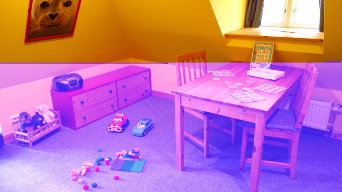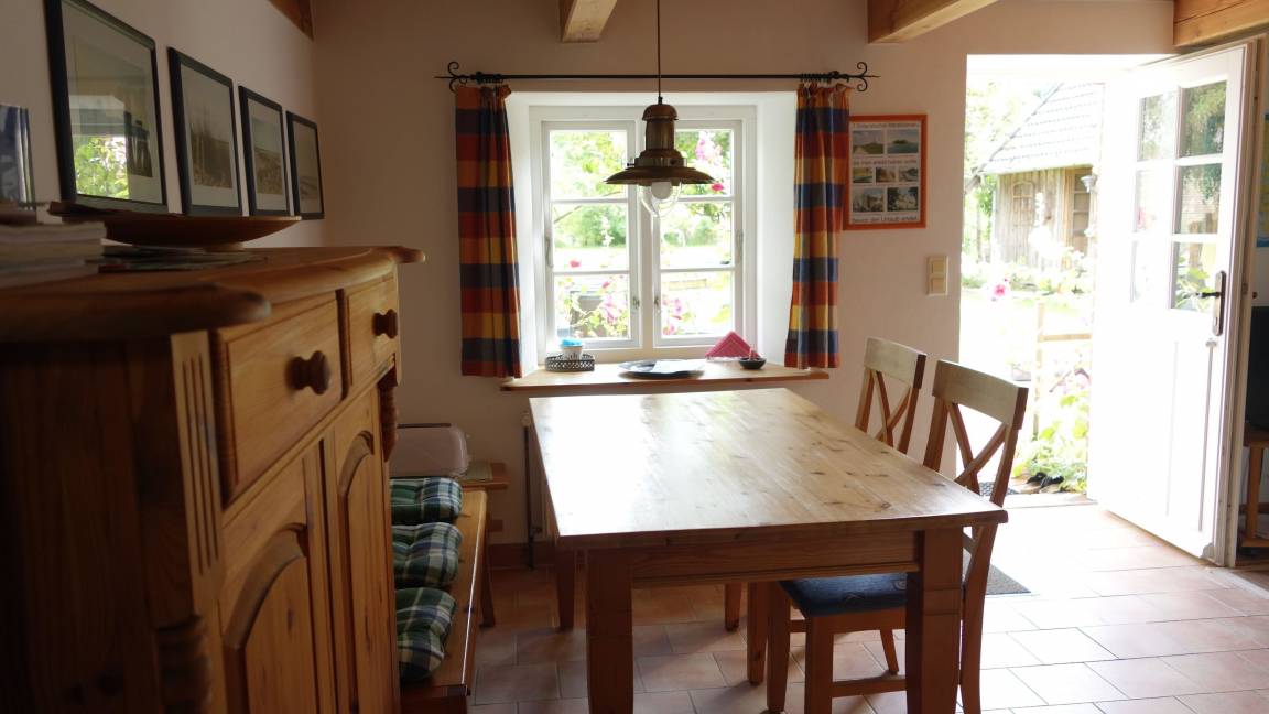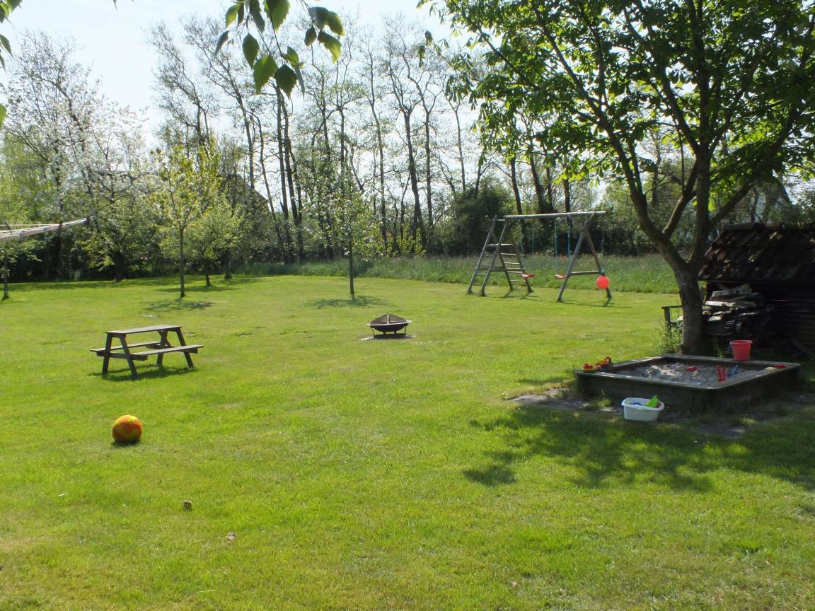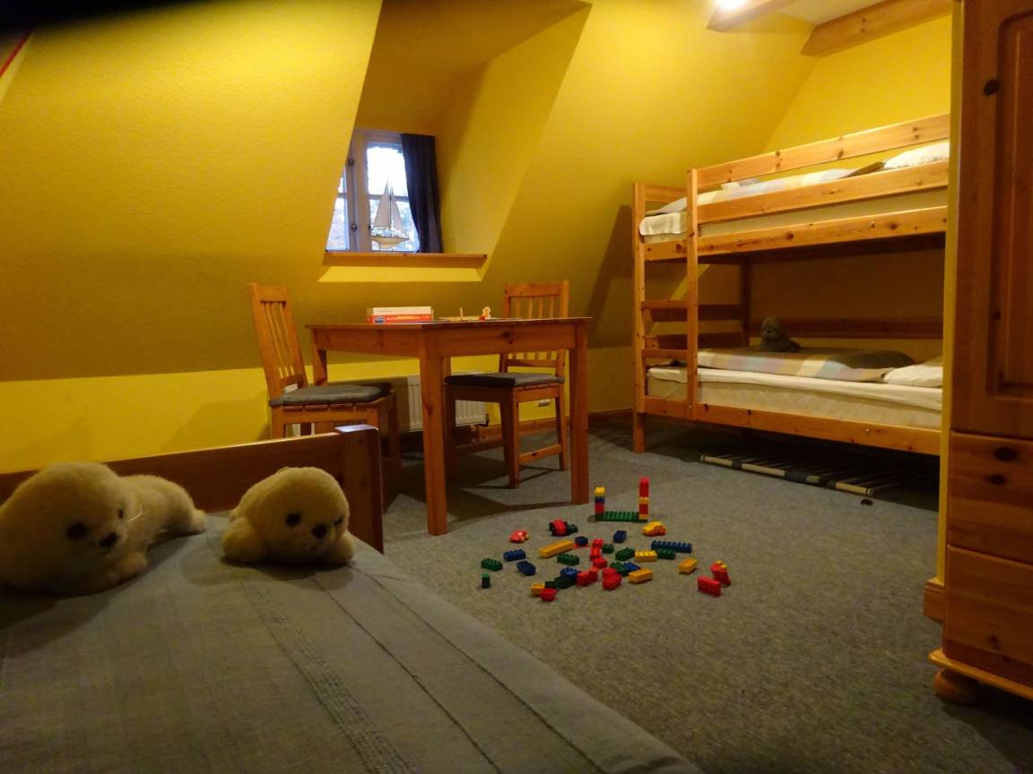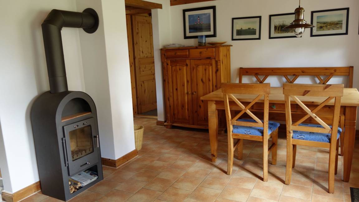 Essplatz. Das Küchenzubehör und Besteck ist für 5 Personen vorhanden. Im Anschluss daran liegt der Wohnbereich mit Sofa, Couchtisch, zwei Rattanstühlen und dem großen Essbereich. Ein besonderes Plus ist der Kaminofen. Sie haben von hier einen direkten Zugang zur möblierten Terrasse (rechte Hälfte - siehe Foto) , sowie dem 1800 qm großen Garten mit Schaukel, Sandkiste und Trampolin. Weiter befindet sich im EG das Elternschlafzimmer mit einem Doppelbett (Platz für ein Kinderreisebett ist vorhanden). Auch das Duschbad befindet sich im Erdgeschoss. Im Dachgeschoss liegt das Kinderzimmer mit einem Etagenbett und einem Einzelbett. Es befindet sich zusätzlich ein Tisch mit Stühlen im Zimmer zum Spielen, Malen u.a..