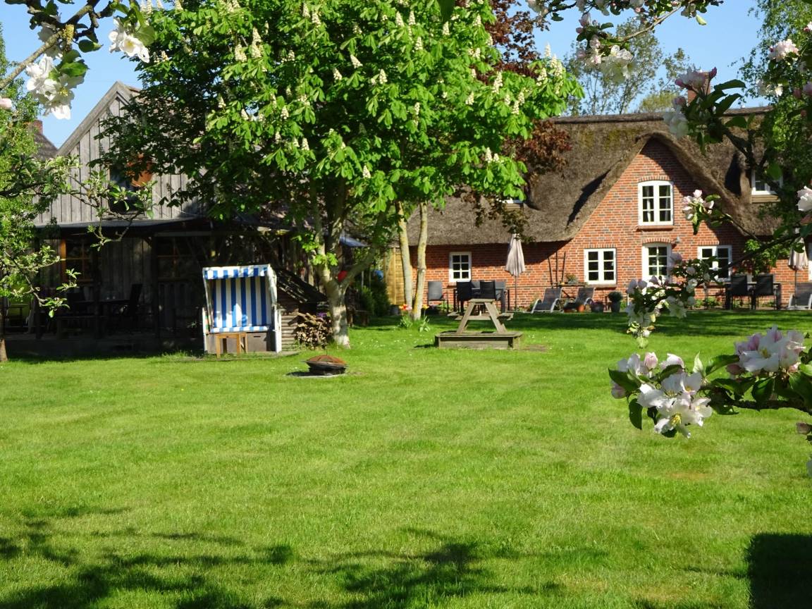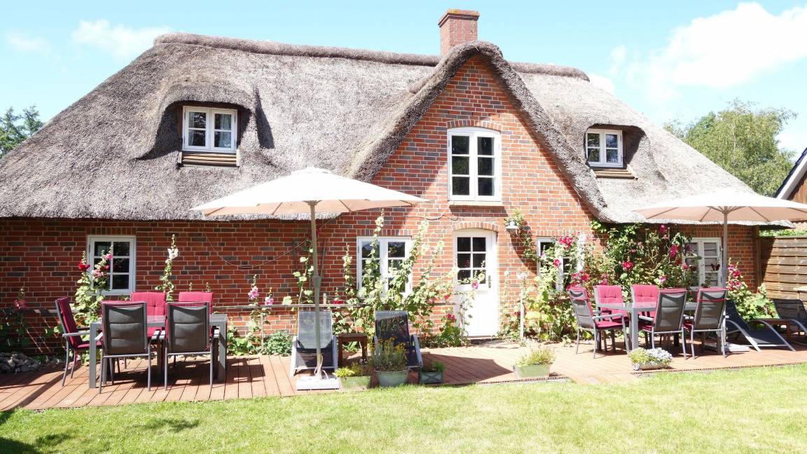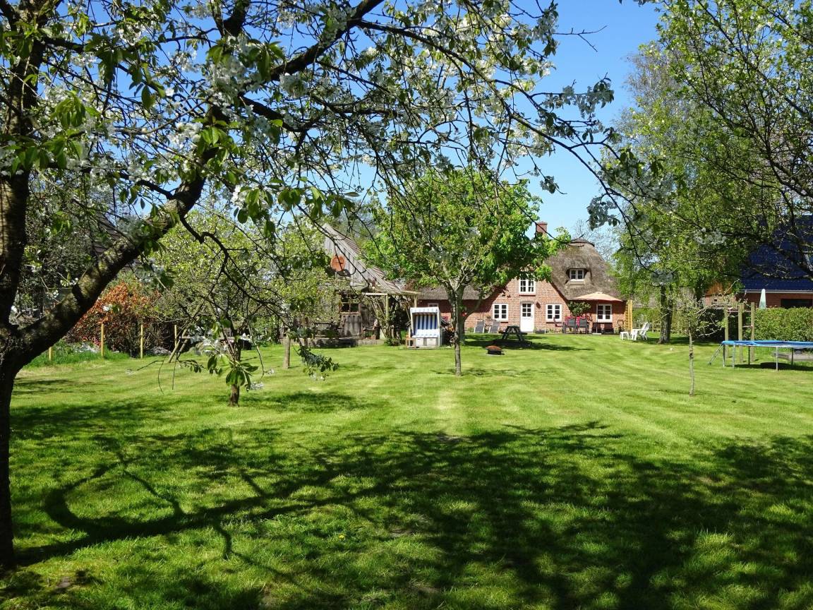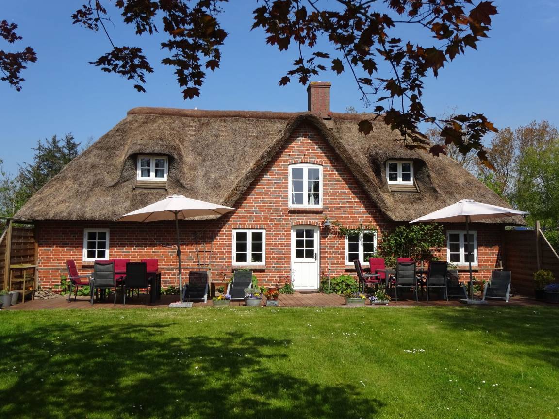 In unserer Reetdach-Doppelhauskate in Tating bei St. Peter Ording befinden sich zwei sehr gemütliche, geräumige 3 Zimmer- Wohnungen. Der 1800 qm große Garten mit Südterasse ist vor allem als Spielwiese gedacht und ideal für Familien mit Kindern.
