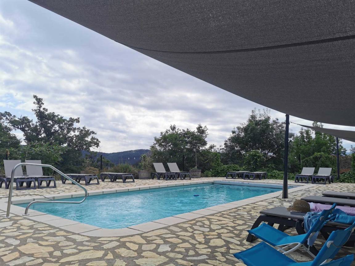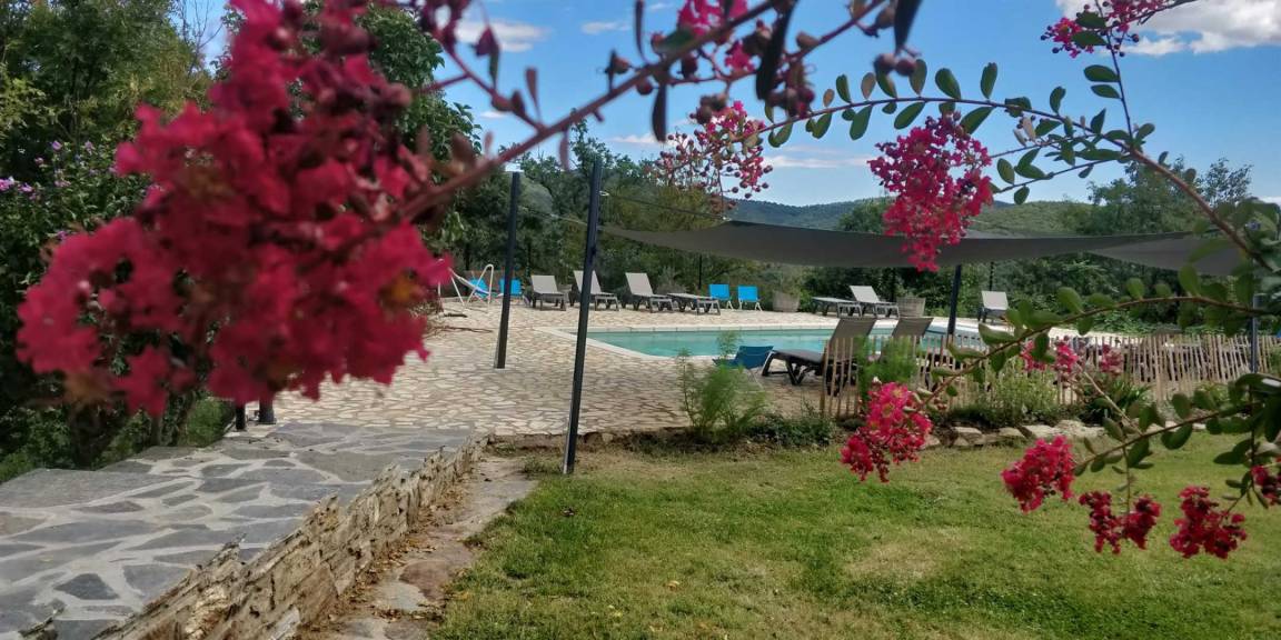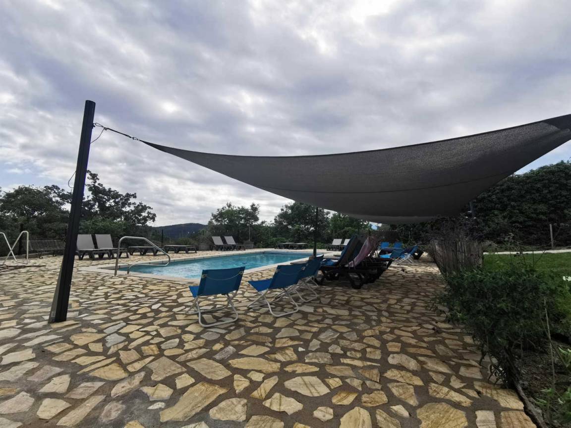 Nur wenige Meter entfernt bietet der Gemeinschaftspool (für vier Unterkünfte) einen atemberaubenden Blick ins Tal. Angrenzend befindet sich eine 150 m² große Terrasse mit Liegestühlen. Der Pool (10 x 4 m, 1,40 m tief), der mit zwei weiteren Ferienhäusern geteilt wird, ist beheizt und von Juni bis September geöffnet.