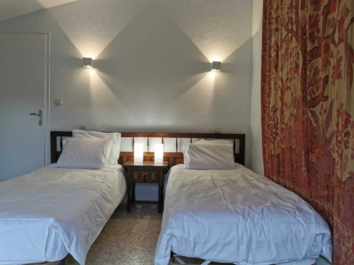 Eine Galerie mit einem Einzelbett (90 x 190 cm) führt zu den weiteren Schlafzimmern: ein Schlafzimmer mit drei Einzelbetten (90 x 190 cm), ein Schlafzimmer mit einem Doppelbett (140 x 190 cm) und eig