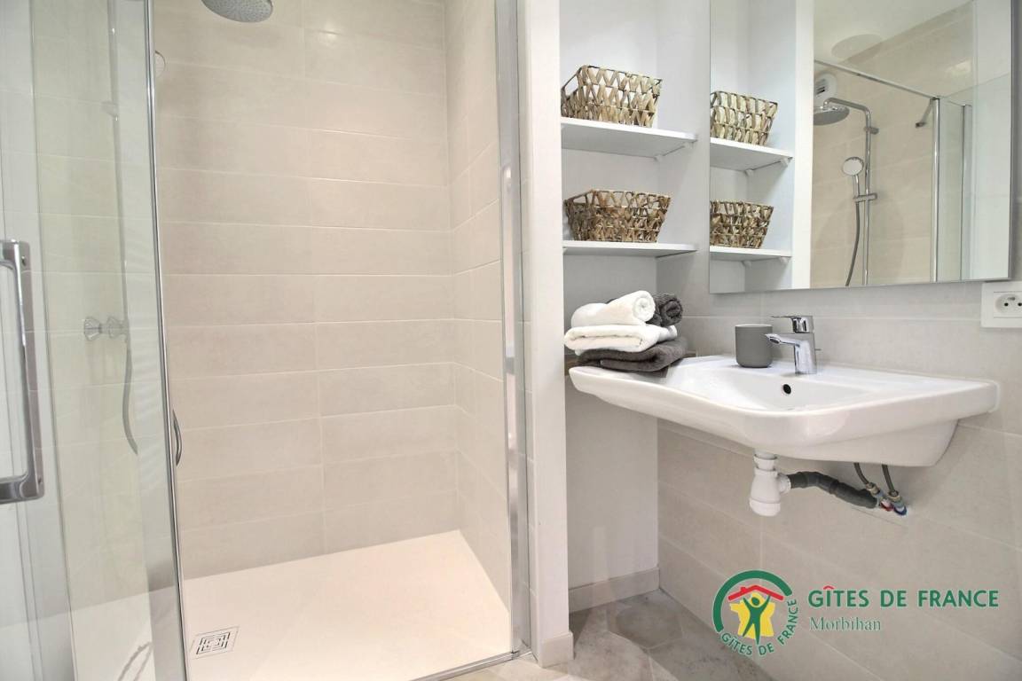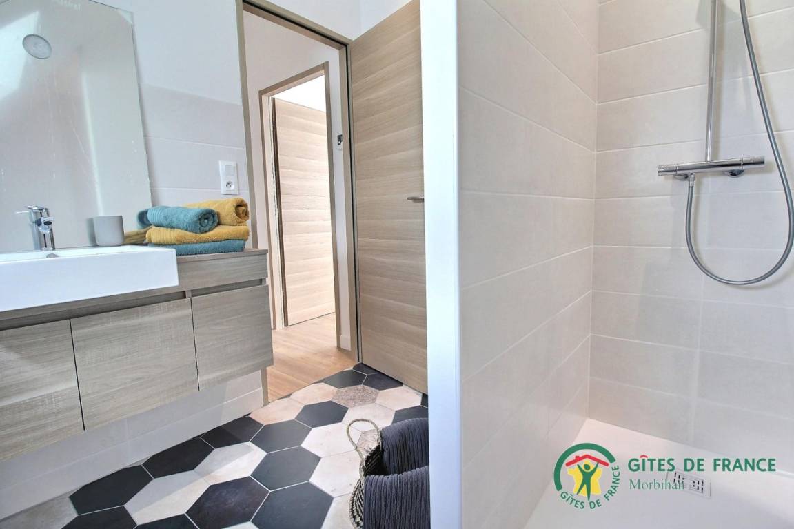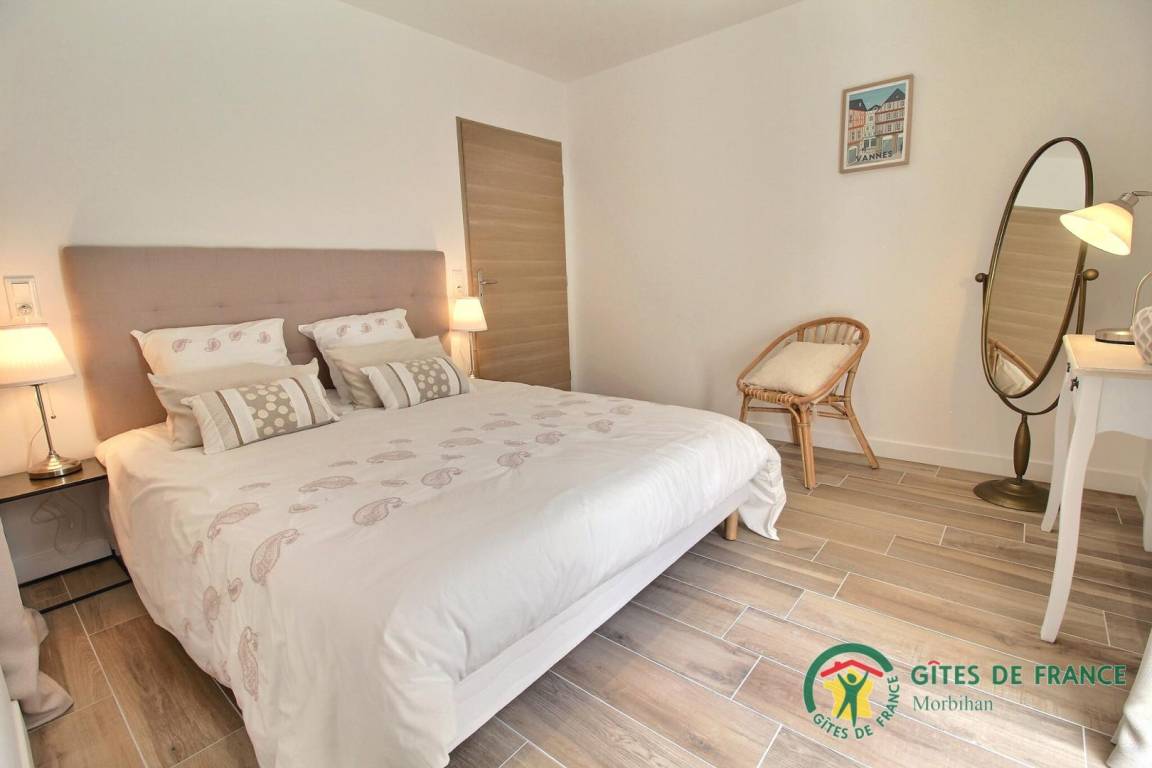 Diese sehr komfortable Ferienwohnung für 8 Personen wurde mit Geschmack komplett renoviert. Im Erdgeschoss ein geräumiges und helles Wohnzimmer mit Lounge, Wohnzimmer und einer voll ausgestatteten offenen Küche. Ein charmantes Zimmer für zwei Personen (Bett 160x200) mit angrenzendem und eigenem Bad und WC, dieses Zimmer ermöglicht den Zugang für Personen mit eingeschränkter Mobilität. Waschküche und WC.