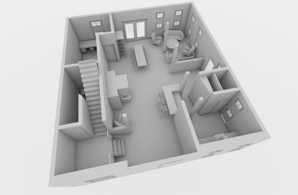 Das Erdgeschoss besteht aus einem großzügigen Wohn/Essraum mit Kamin und direktem Zugang zum Garten sowie einem separatem Zimmer mit Doppelbett und Schreibtisch.