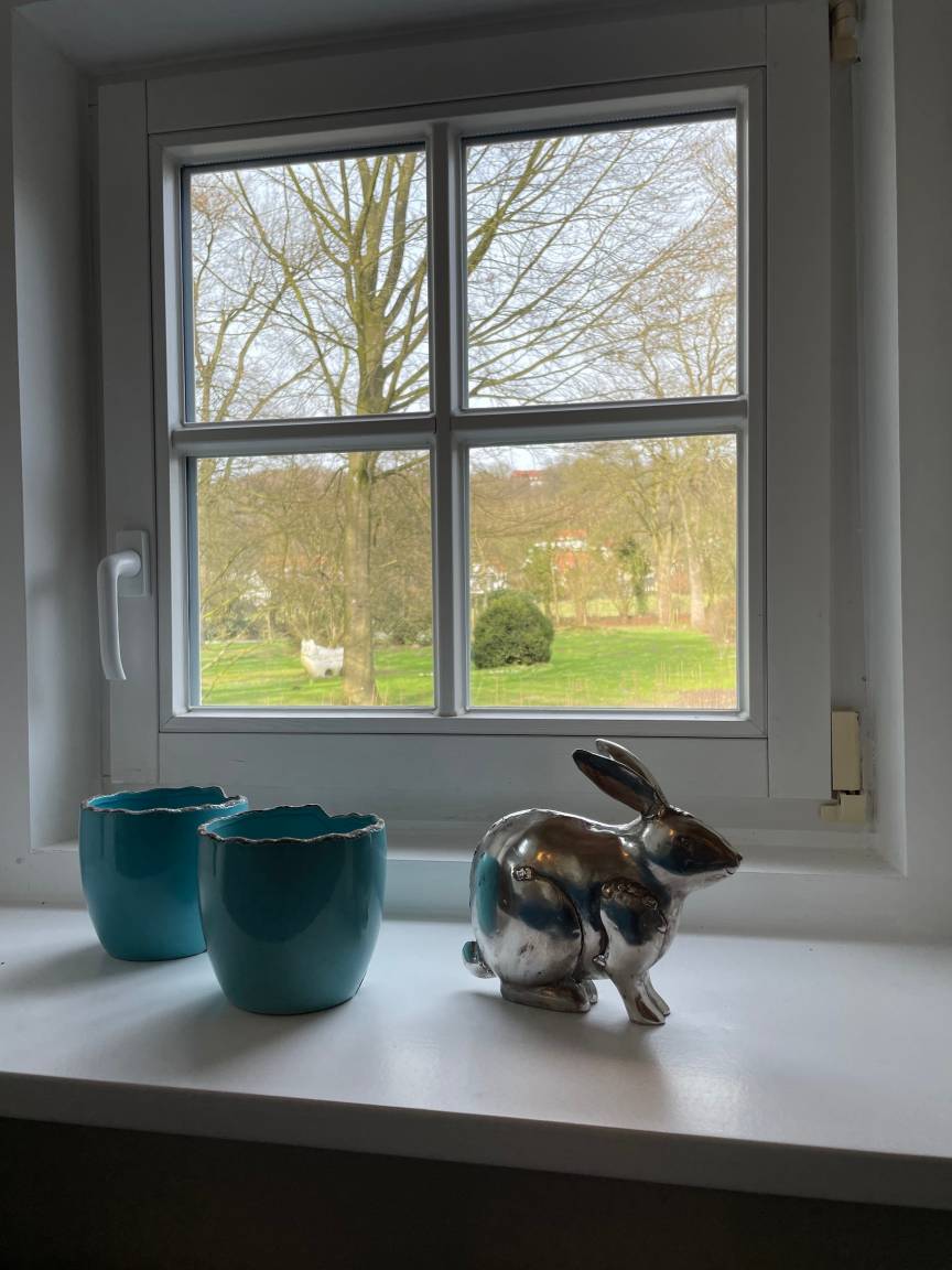Nach vorne blicken Sie auf Haus Marck, nach hinten liegt der Garten mit Blick in den Schlosspark. Dort wohnen auch unsere Hühner.