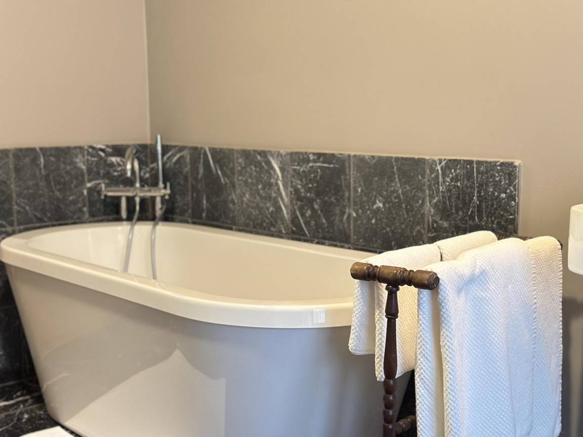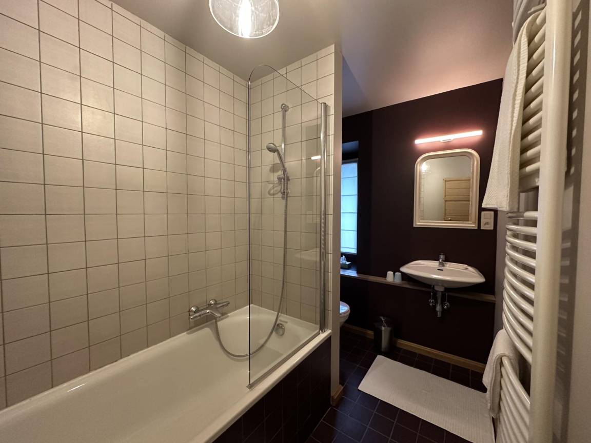 Gästeunterkunft in der 1. Etage: Schlafzimmer mit Badezimmer mit 3x Einzelbett, Badewanne, Waschbecken, Toilette