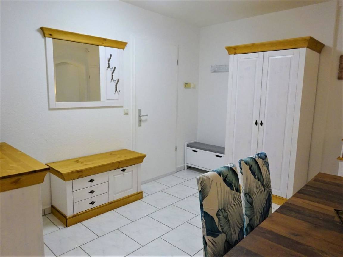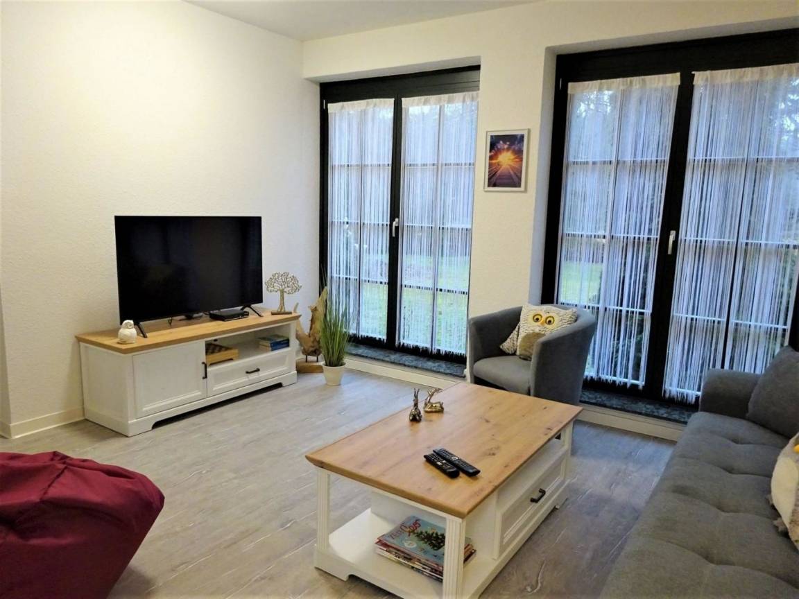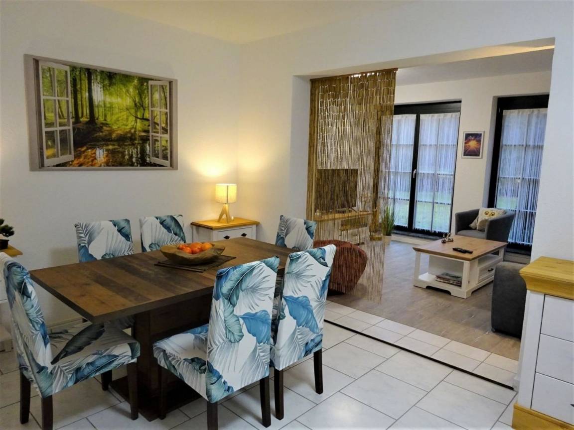 Ferienwohnung "Eule" bietet Platz für bis zu 8 Personen mit einer Wohnfläche von 89 m² plus einer 25 m² großen Terrasse.Sie verfügt über ein Wohnzimmer, ein Esszimmer, 2 Schlafzimmer, ein Badezimmer und eine große voll ausgestattete Küche (Microwelle, Kaffeemaschine, Teekocher, Toaster, Kühlschrank mit Gefrierfach, Backofen, Herd mit Ceranfeld, Geschirrspüler). Im ersten Schlafzimmer befindet sich ein Boxspringbett. Im zweiten Schlafzimmer ist ein Doppelstockbett (Liegefläche oben 90cm Breite und unten 120cm Breite) und eine ausziehbare Schlafcouch. Eine weitere Schlafmöglichkeit ist im Wohnzimmer. Hier ist eine große ausziehbare Schlafcouch. Im Bad, zweitem Schlafzimmer und im Esszimmer ist Fußbodenheizung.Außerdem gibt es Smart-TV mit HD Sendern, DAB Radio mit CD-Player sowie kostenloses W-LAN.Folgende Dinge sind im Preis inbegriffen:Kaffee und Tee, Handtücher und Bettwäsche, Seife, Küchenrolle, Spülmittel und WC-Papier.Eine Waschmaschine steht separat nach Absprache zur Verfügung.Die Wohnung verfügt auch über eine separate Terrasse mit großem Tisch, Stühlen und Sonnenschirm sowie mit eigenem Grill.