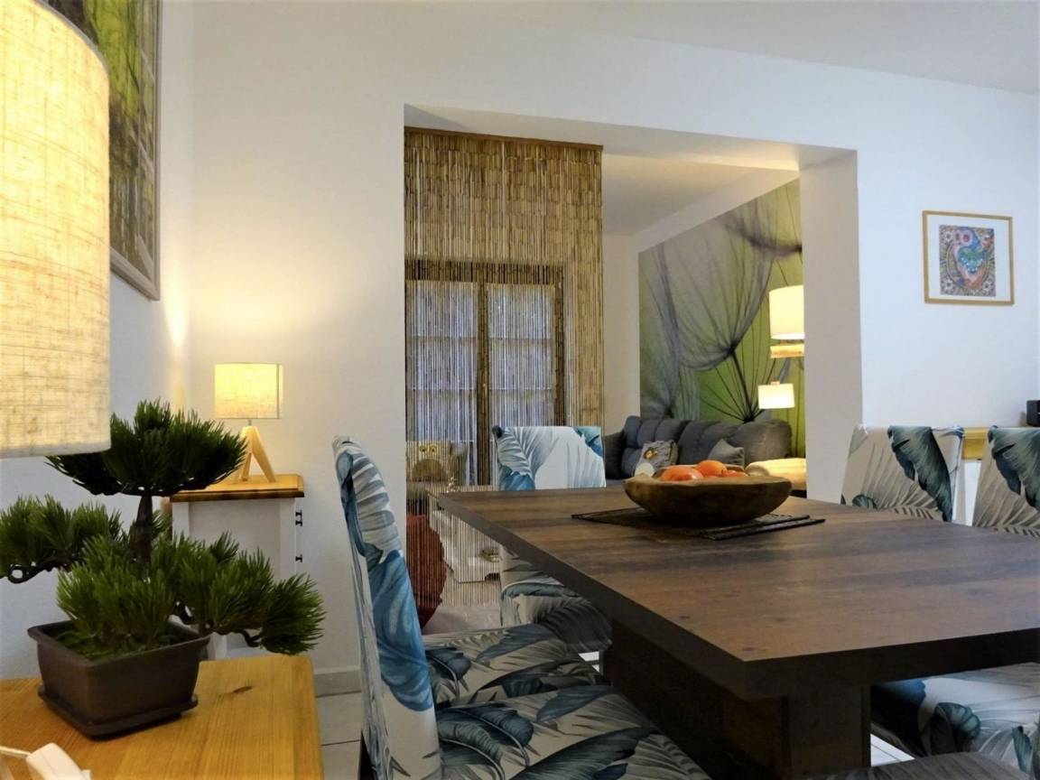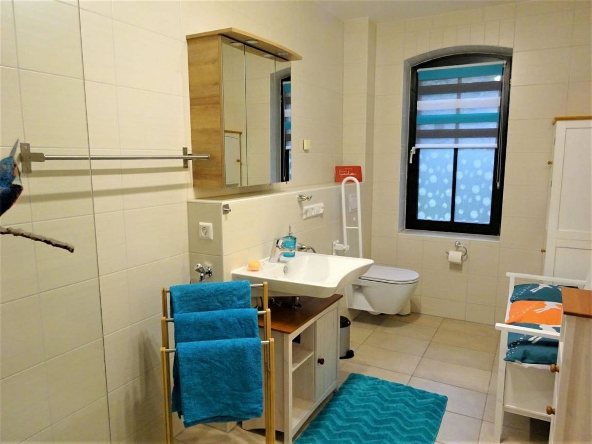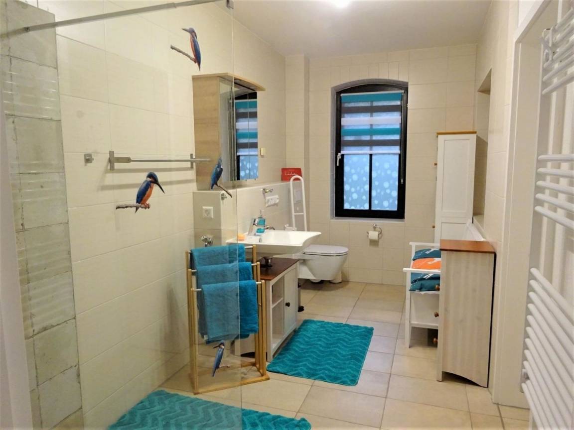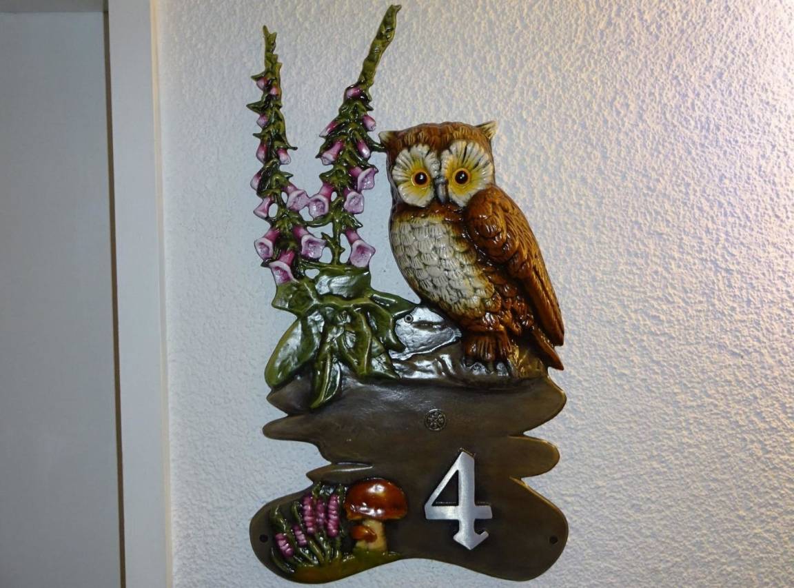 Ferienwohnung "Eule" bietet Platz für bis zu 8 Personen mit einer Wohnfläche von 89 m² plus einer 25 m² großen Terrasse.Sie verfügt über ein Wohnzimmer, ein Esszimmer, 2 Schlafzimmer, ein Badezimmer und eine große voll ausgestattete Küche (Microwelle, Kaffeemaschine, Teekocher, Toaster, Kühlschrank mit Gefrierfach, Backofen, Herd mit Ceranfeld, Geschirrspüler). Im ersten Schlafzimmer befindet sich ein Boxspringbett. Im zweiten Schlafzimmer ist ein Doppelstockbett (Liegefläche oben 90cm Breite und unten 120cm Breite) und eine ausziehbare Schlafcouch. Eine weitere Schlafmöglichkeit ist im Wohnzimmer. Hier ist eine große ausziehbare Schlafcouch. Im Bad, zweitem Schlafzimmer und im Esszimmer ist Fußbodenheizung.Außerdem gibt es Smart-TV mit HD Sendern, DAB Radio mit CD-Player sowie kostenloses W-LAN.Folgende Dinge sind im Preis inbegriffen:Kaffee und Tee, Handtücher und Bettwäsche, Seife, Küchenrolle, Spülmittel und WC-Papier.Eine Waschmaschine steht separat nach Absprache zur Verfügung.Die Wohnung verfügt auch über eine separate Terrasse mit großem Tisch, Stühlen und Sonnenschirm sowie mit eigenem Grill.