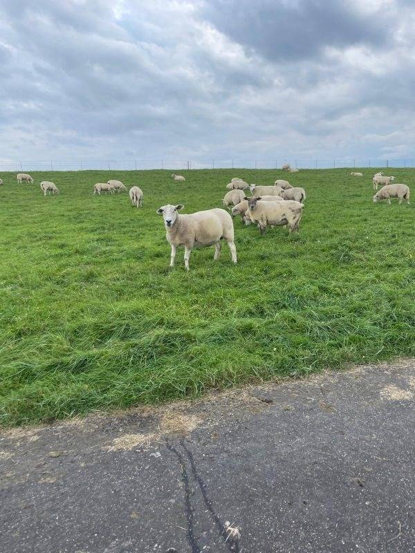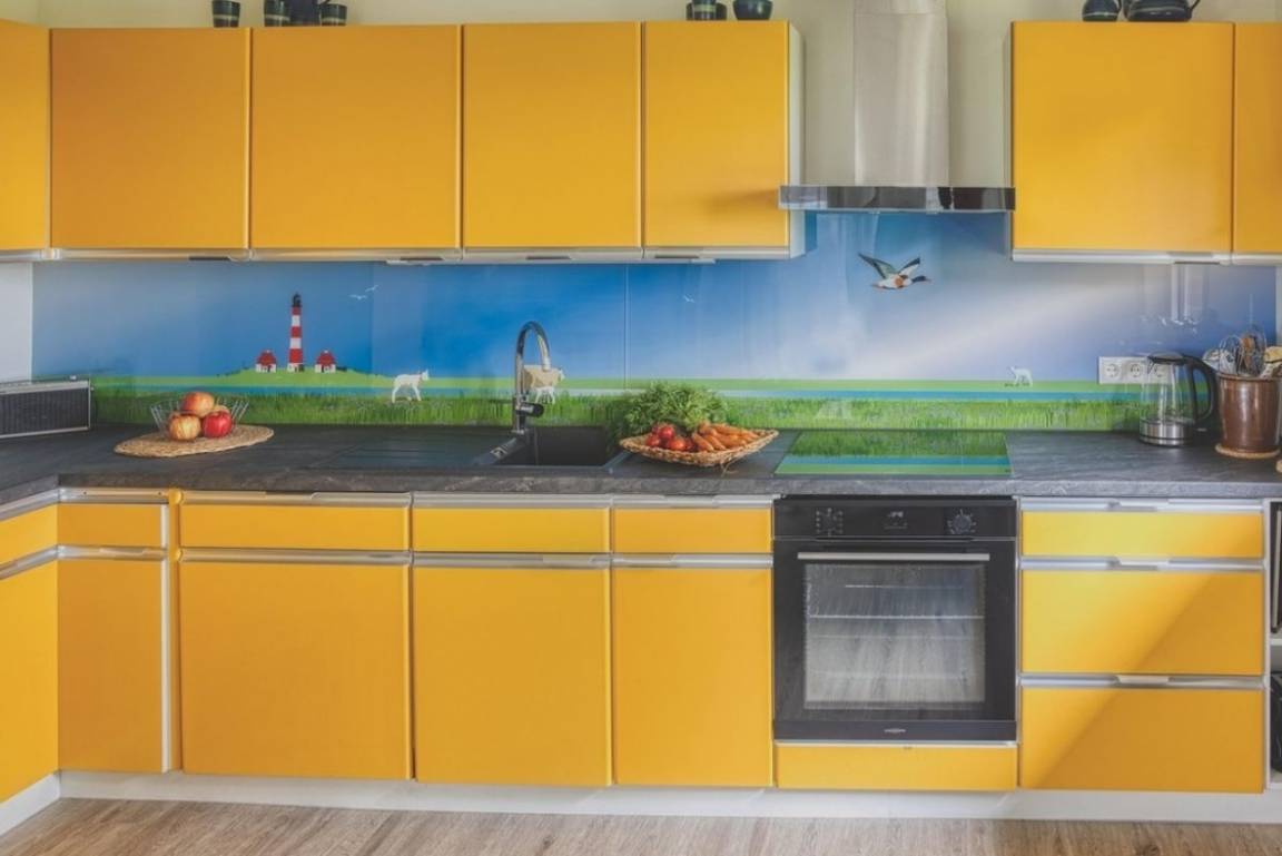 Direk am Esszimmer schließt sich eine geräumige retrofarbene Küche mit Spülmaschine, Herd (Induktion) mit Backofen und Dunstabzughaube, einen Kühlschrank mit Gefriermöglichkeit sowie Kaffeemaschine, Toaster und Wasserkocher, TM 5 an. Ein besonderer Hingucker ist die gestaltete Rückwand mit typischen Motiven unserer Urlaubsregion wie den Westerhever Leuchtturm, Schafen, Lämmer, Deichen und das Meer.