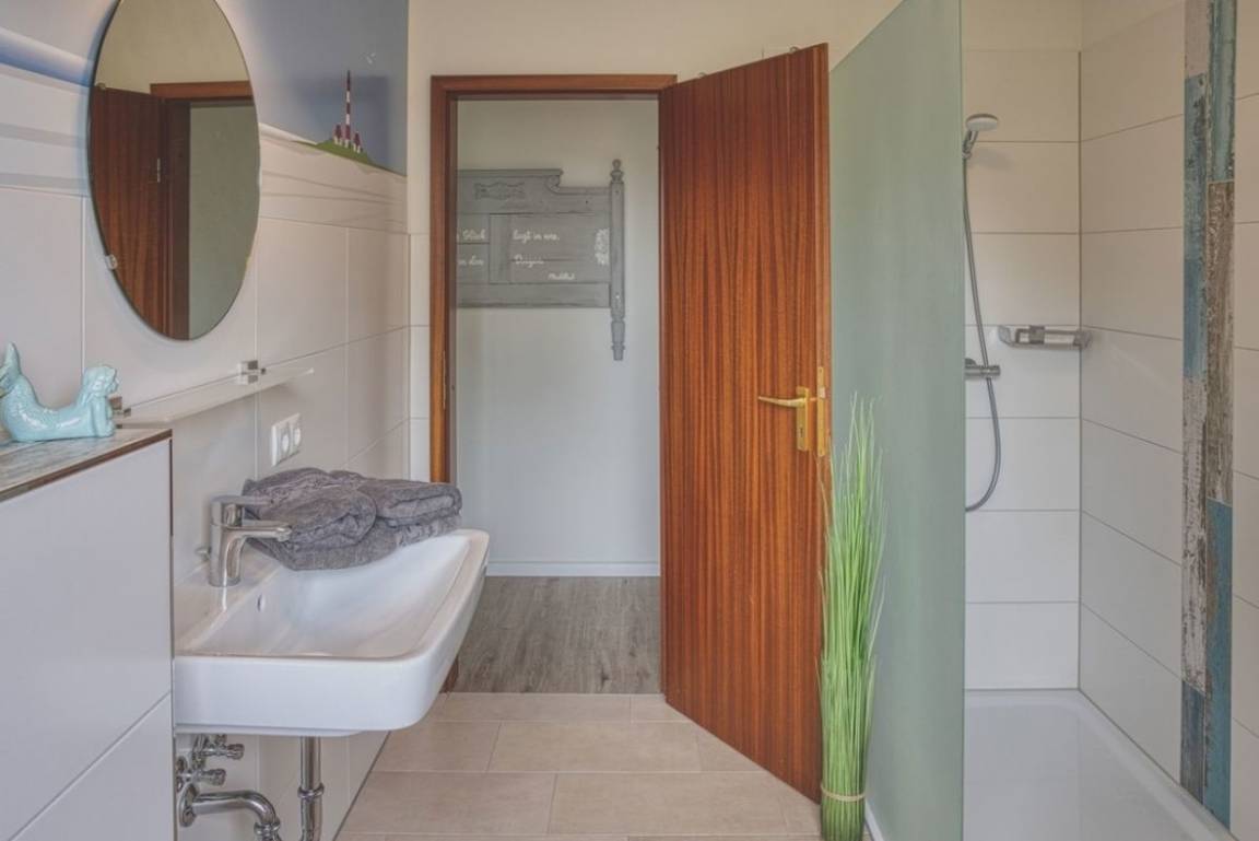Ein helles und modernes Bad mit ebenerdiger Dusche rundet das Wohnerlebnis ab.