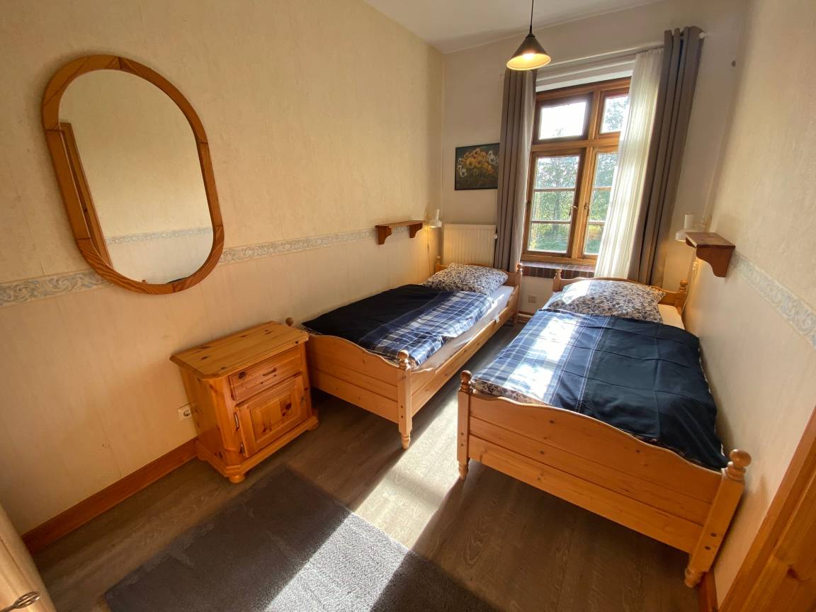 Die Ferienwohnung 1 liegt im Erdgeschoss und hat ca. 55m² und eine eigene Terrasse sowie zwei Schlafzimmern (zwei Einzelbetten und ein Etagenbett) für bis zu vier Personen. Badezimmer und Küche wurden Anfang 2021 komplett saniert. Die Schlafzimmer wurden im Januar 2023 renoviert.