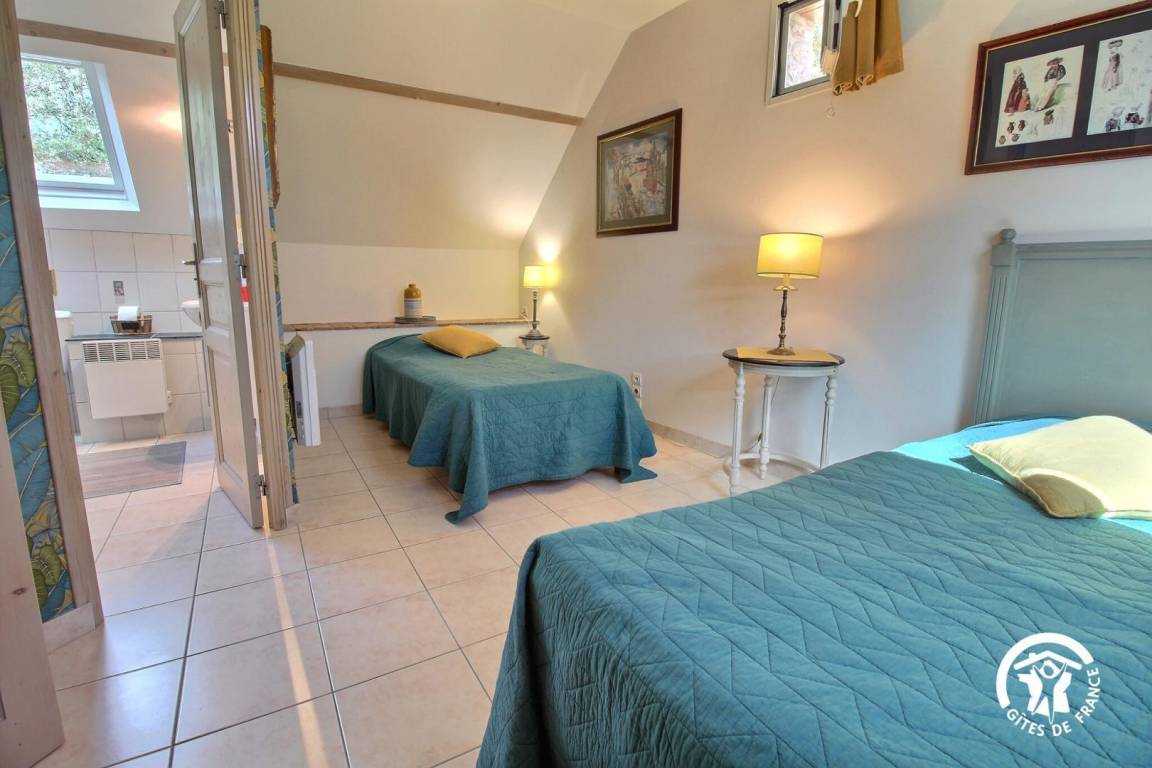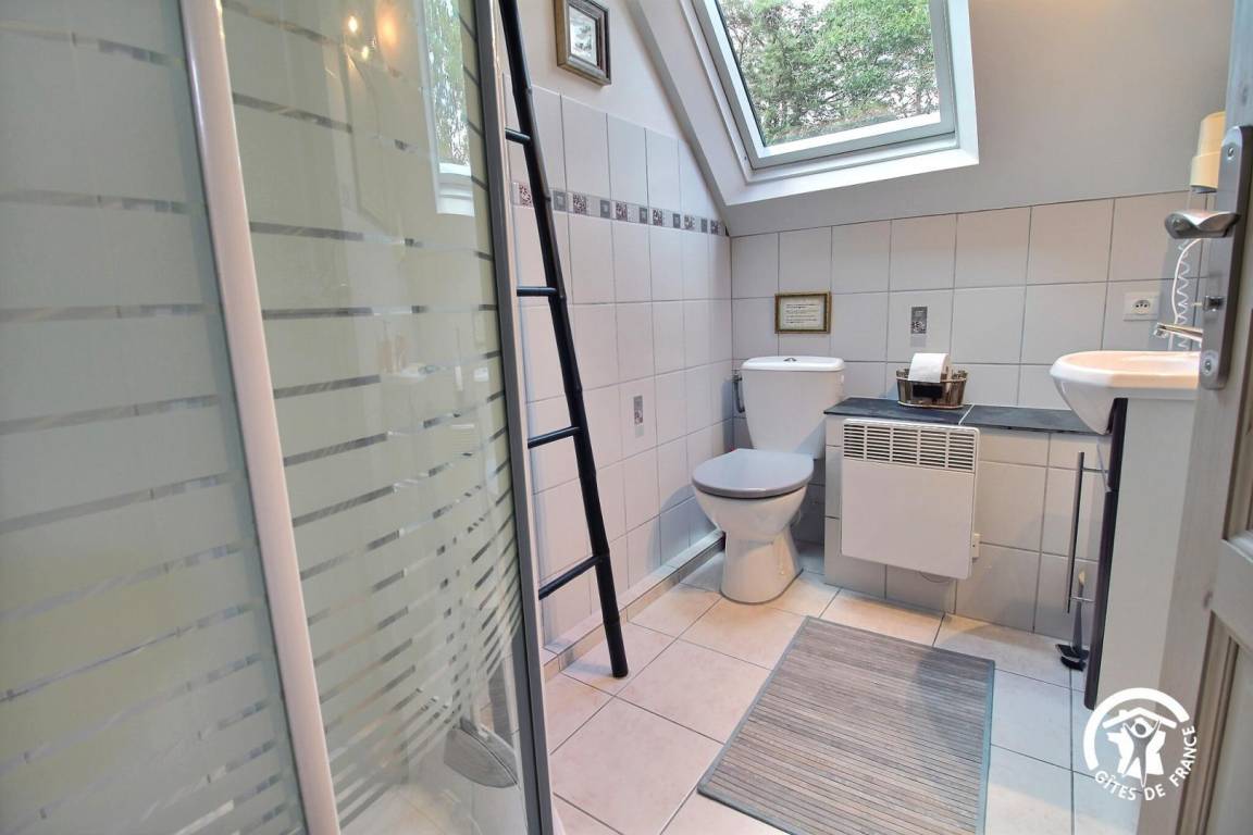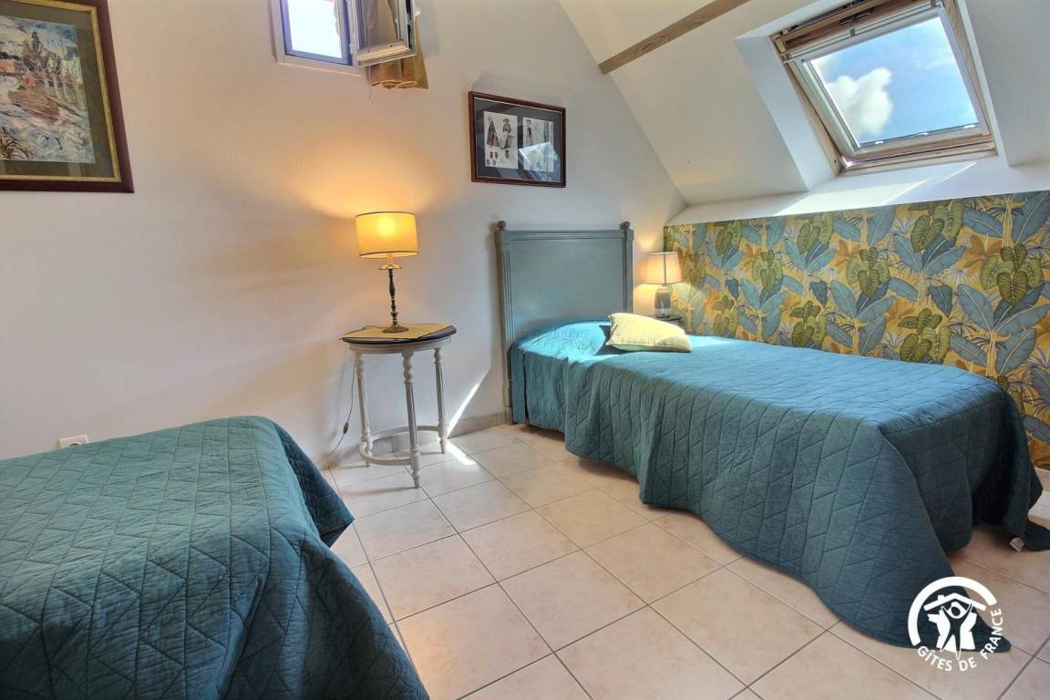 Im Obergeschoss: ein Schlafzimmer mit einem 140x190-Bett und ein Schlafzimmer mit 2 90x190-Betten, jeweils mit eigenem Badezimmer mit Toilette.