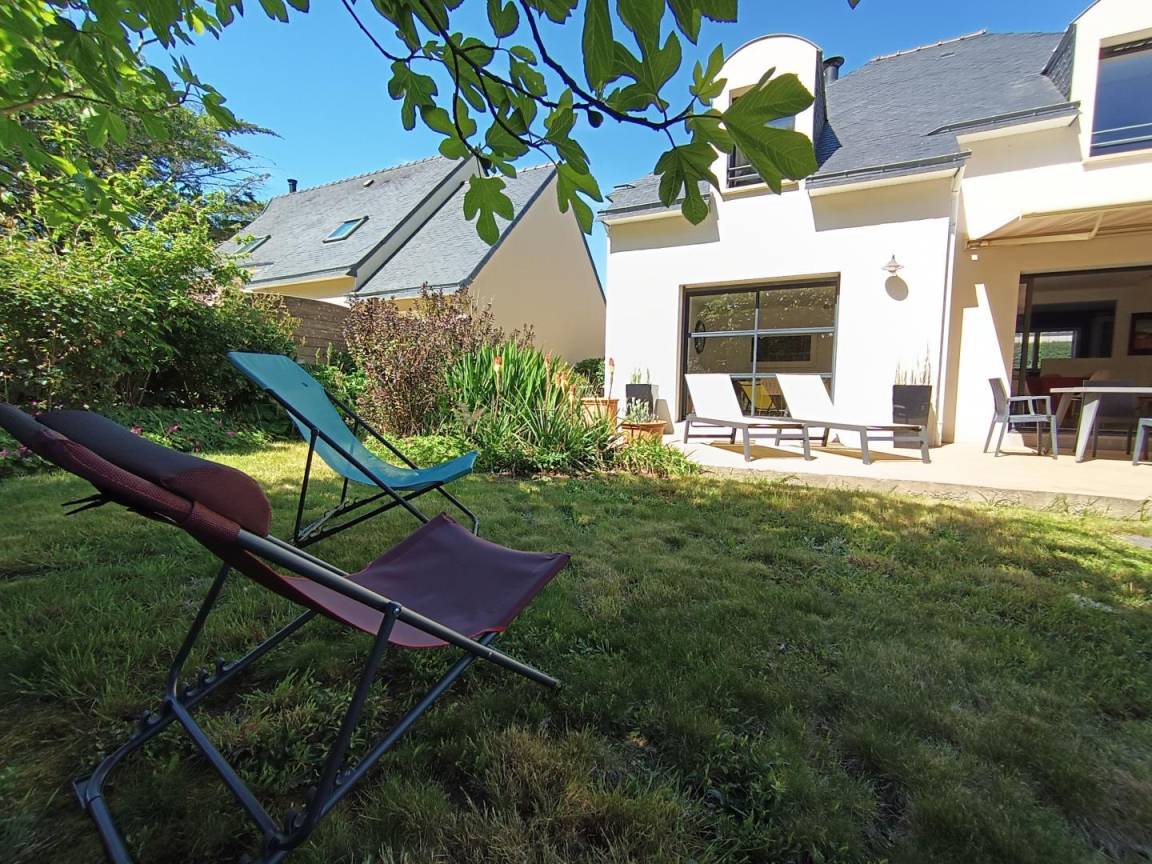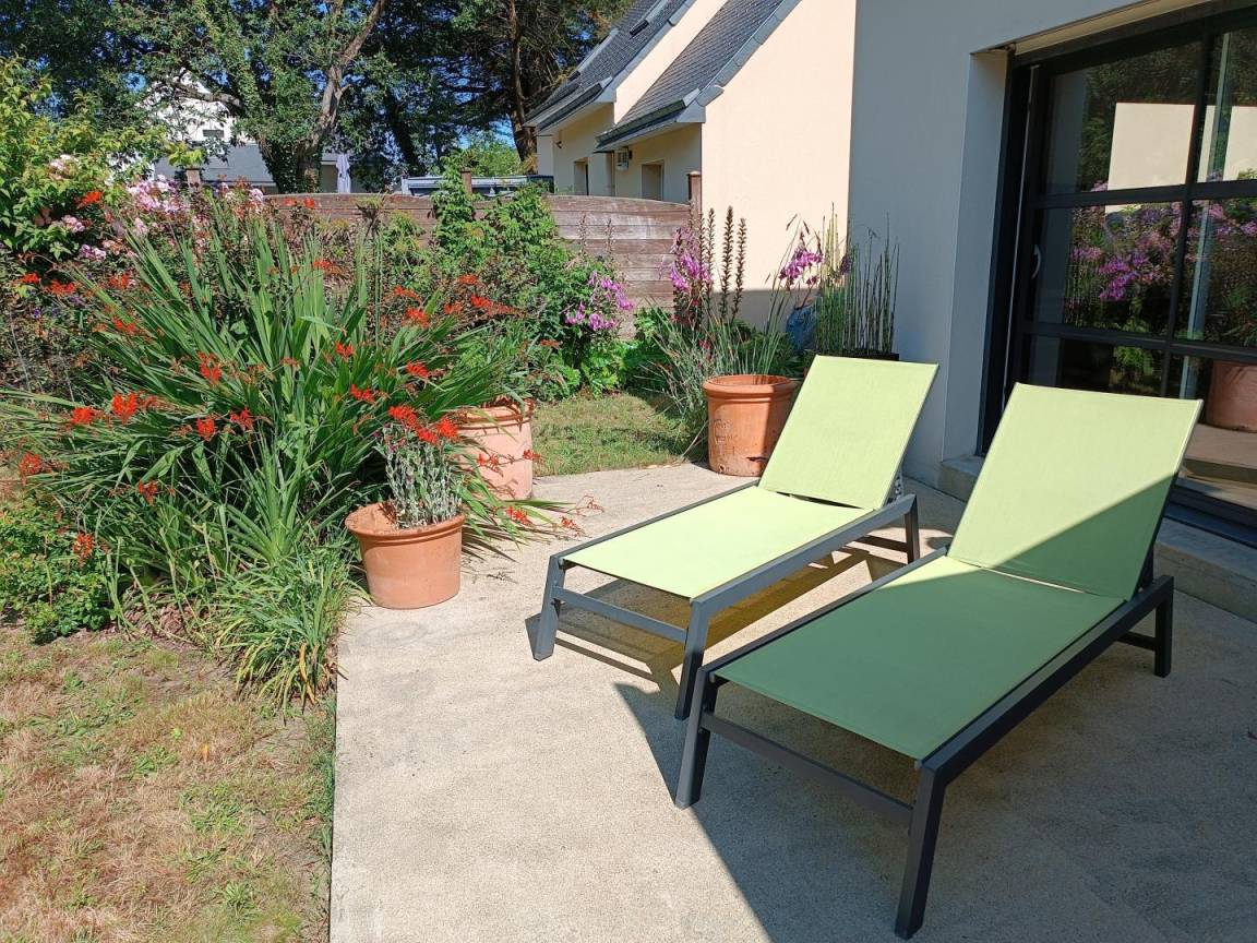 Südterrasse und Garten, möbliert mit Tisch, Stühlen, Markise, Liegestühlen und Grill