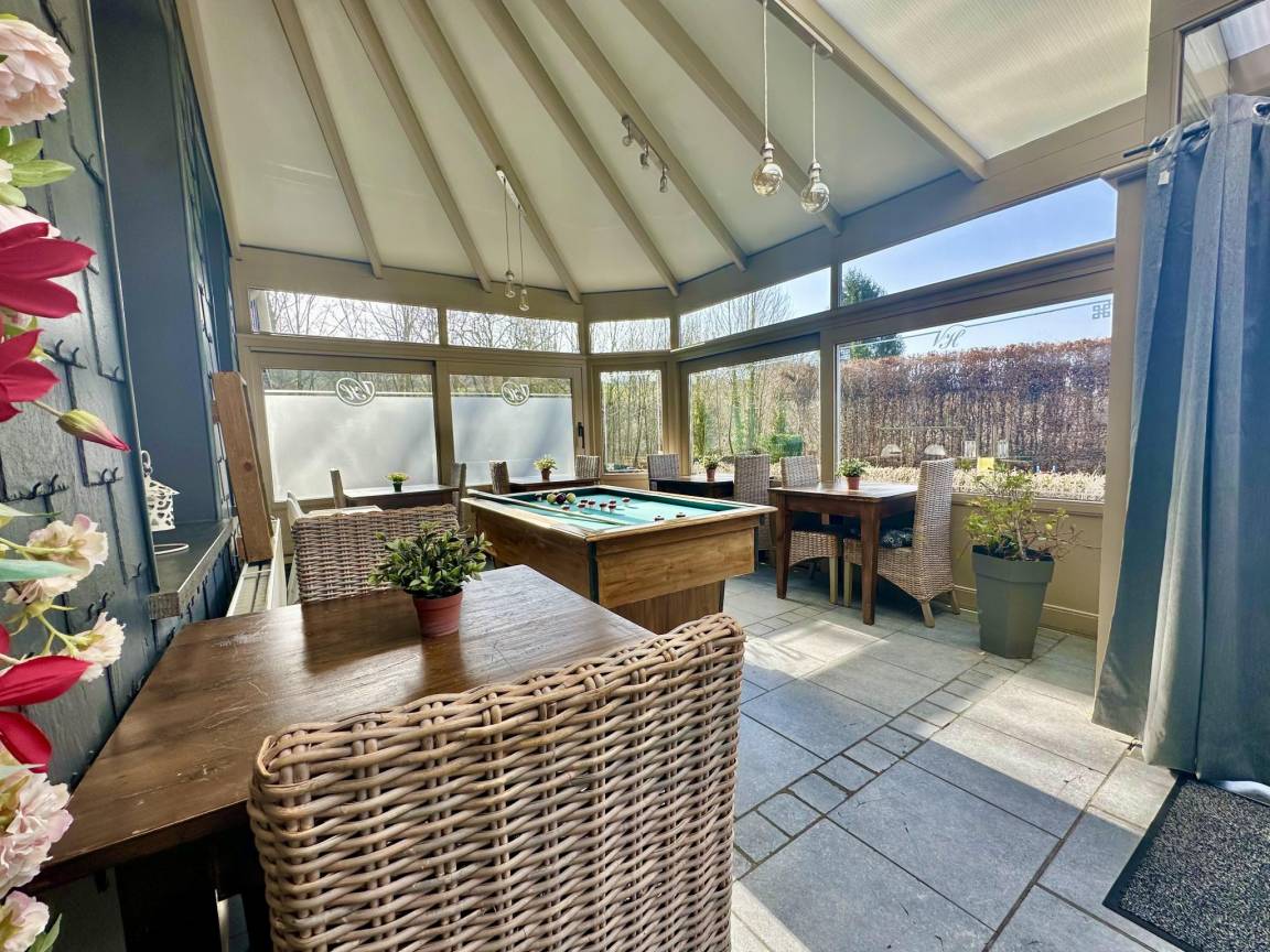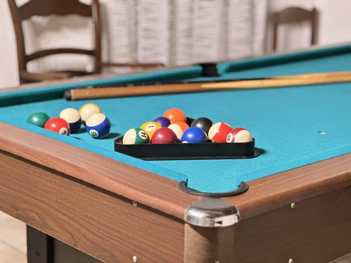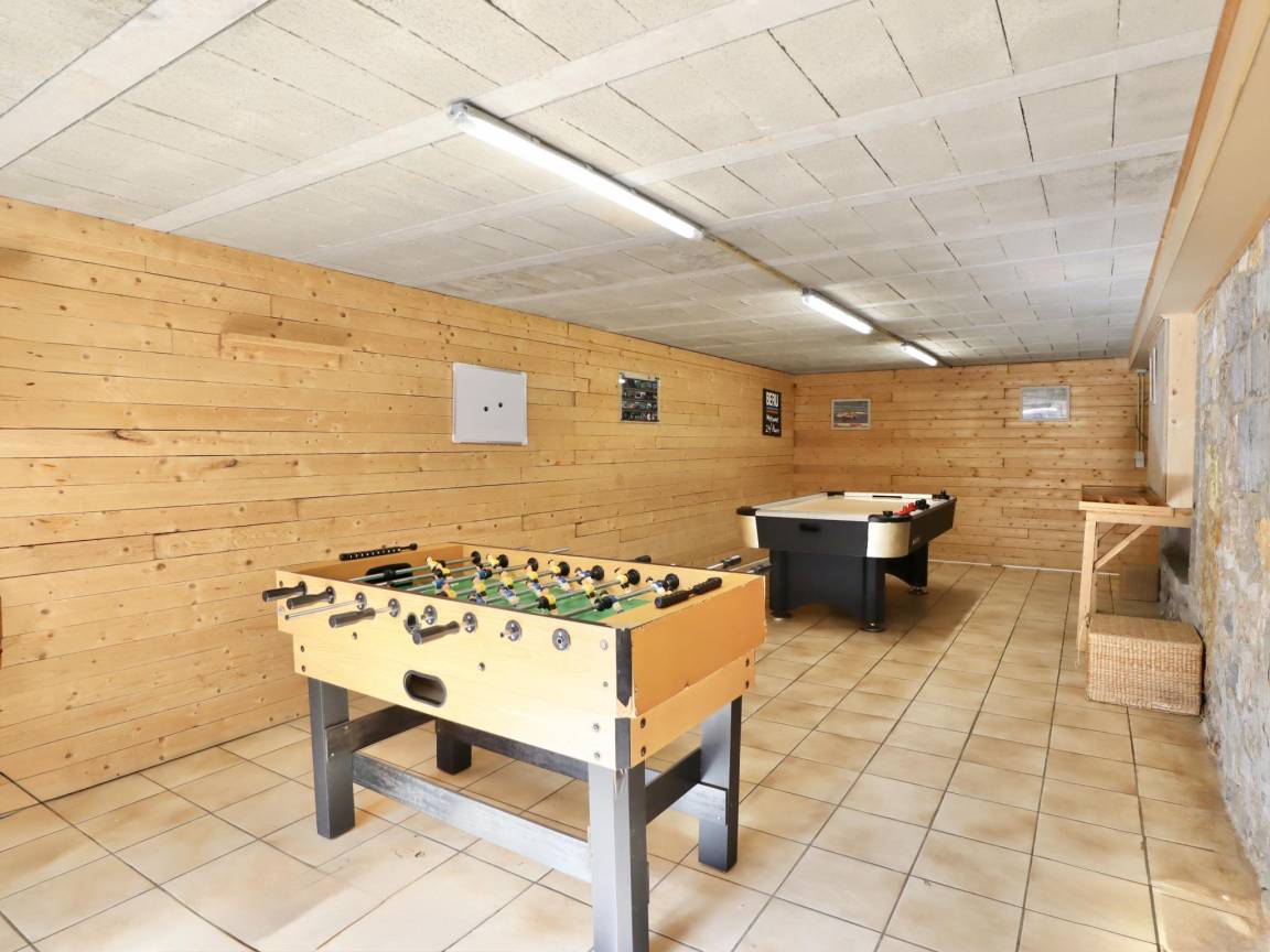 Hausbeschreibung : Dieses großzügige Ferienhaus ist ideal für eine große Familie oder für ein Teambuilding-Event. Sie werden einen großen, einladenden Essbereich, eine professionelle Küche und Wohnzimmer mit Fernseher genießen, darunter eines mit einem offenen Kamin und ein weiteres mit einer Bar. Sie können sich auch in den Spielzimmern mit drei Billardtischen, einem Airhockey, einem Tischfußball und einem Tischtennis vergnügen. Im eingezäunten Garten können die Kinder die Schaukel und die Rutsche nutzen
