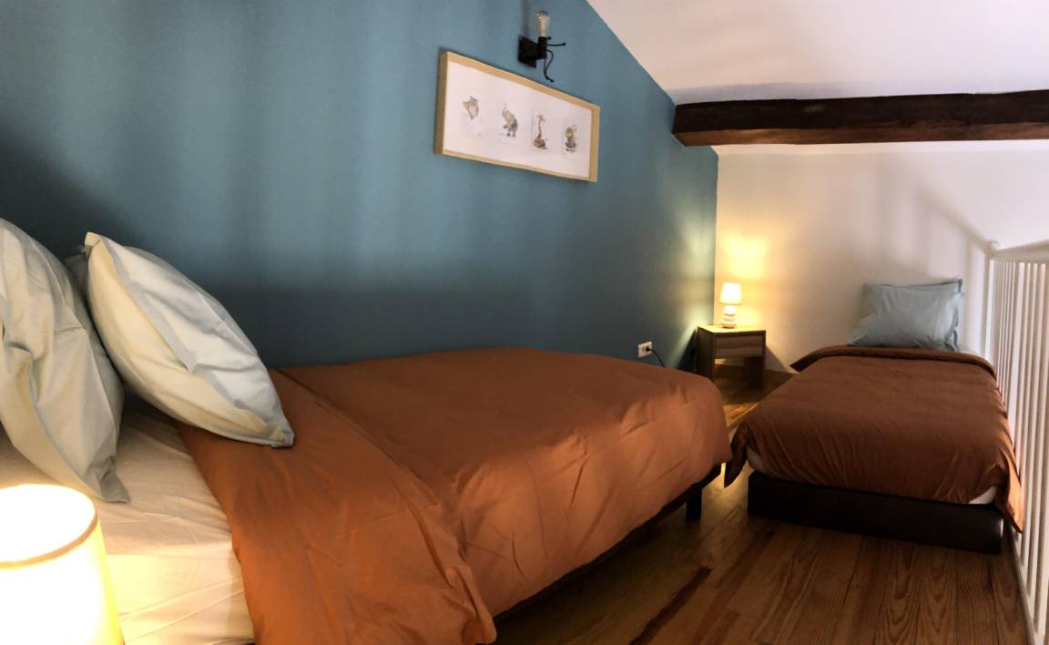 Ein Schlafzimmer: 1 Doppelbett (160 cm) mit Galerie: 2 Einzelbetten (90 cm).