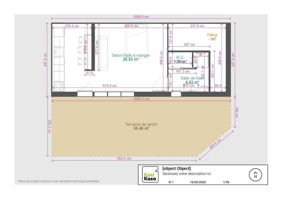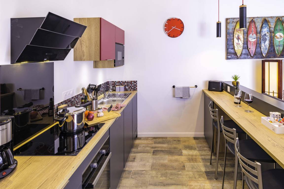 Küche: Frühstücksbar und Wohnbereich (ausgestattet mit einem 140 x 190 cm großen Klappbett und einem Schlafsofa) mit Zugang zu einer 35 m² großen, halboffenen Terrasse.