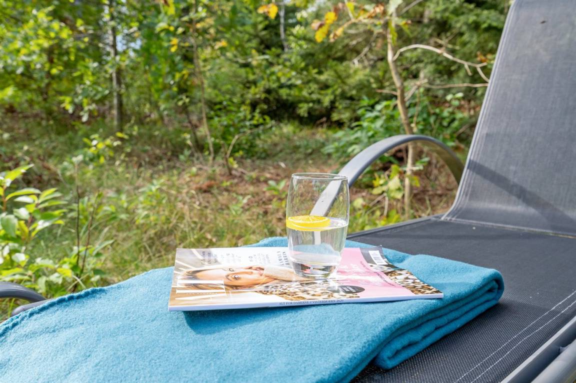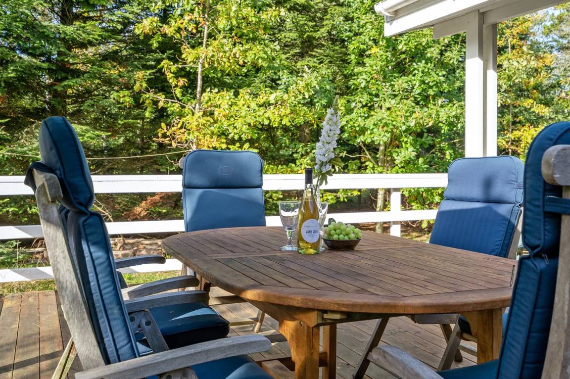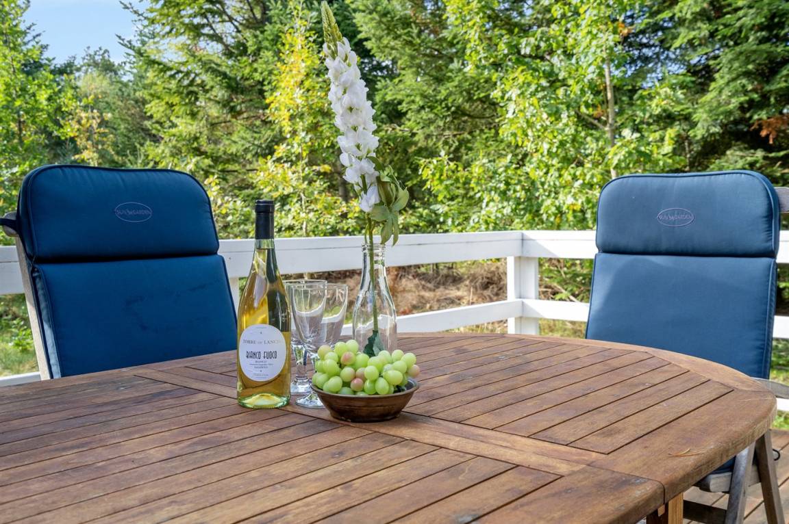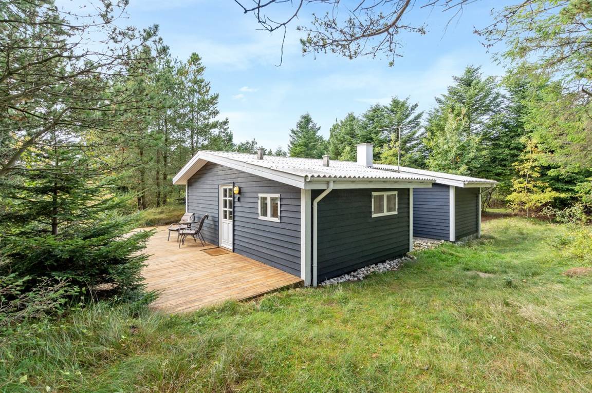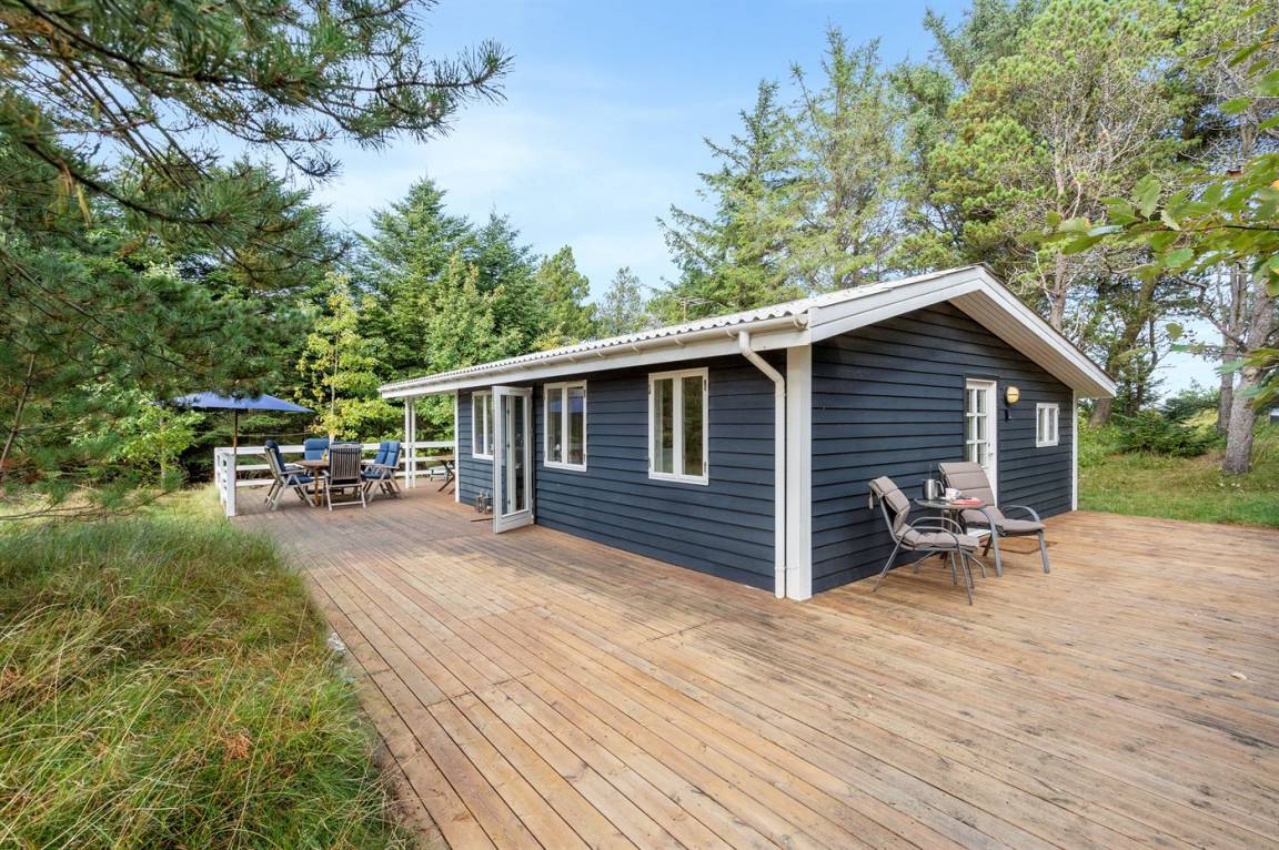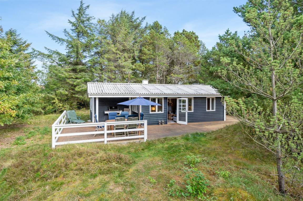 Gemütliches kleines Ferienhaus mit großer Terrasse und einem von Bäumen und anderen Pflanzen umrandeten Grundstück.