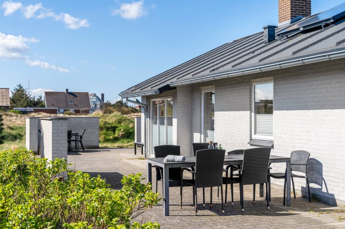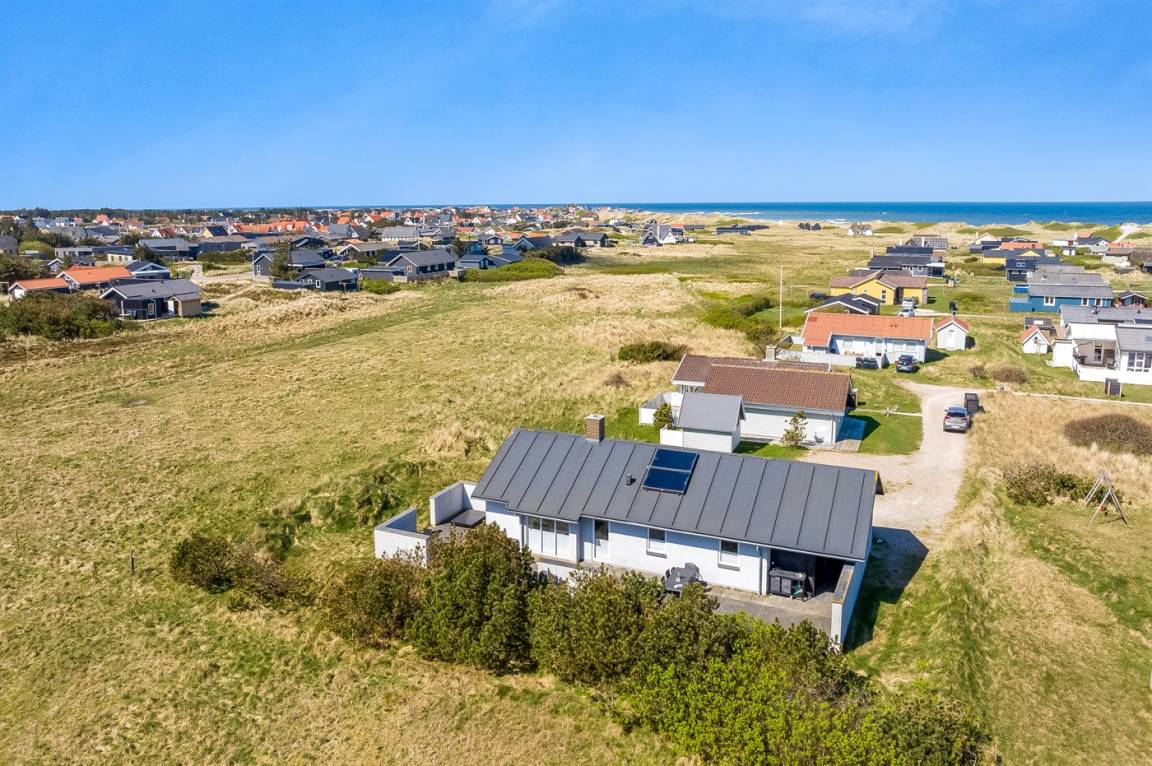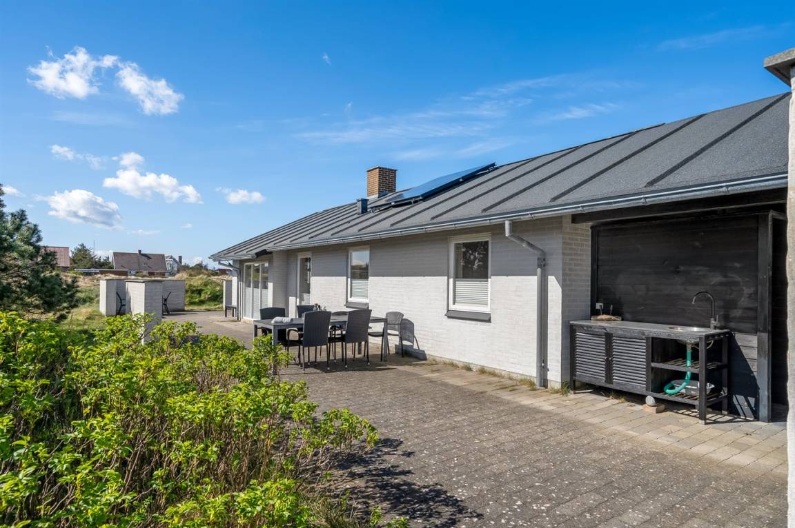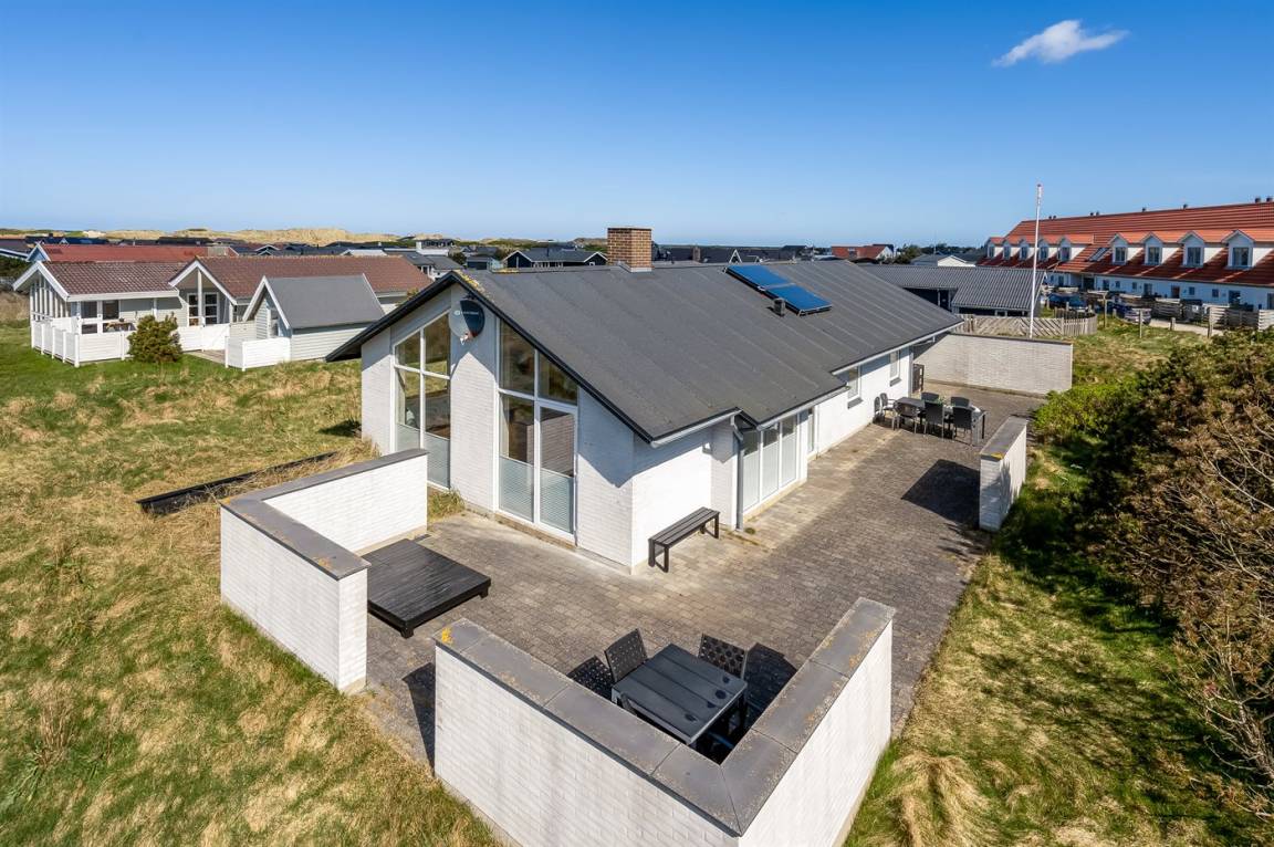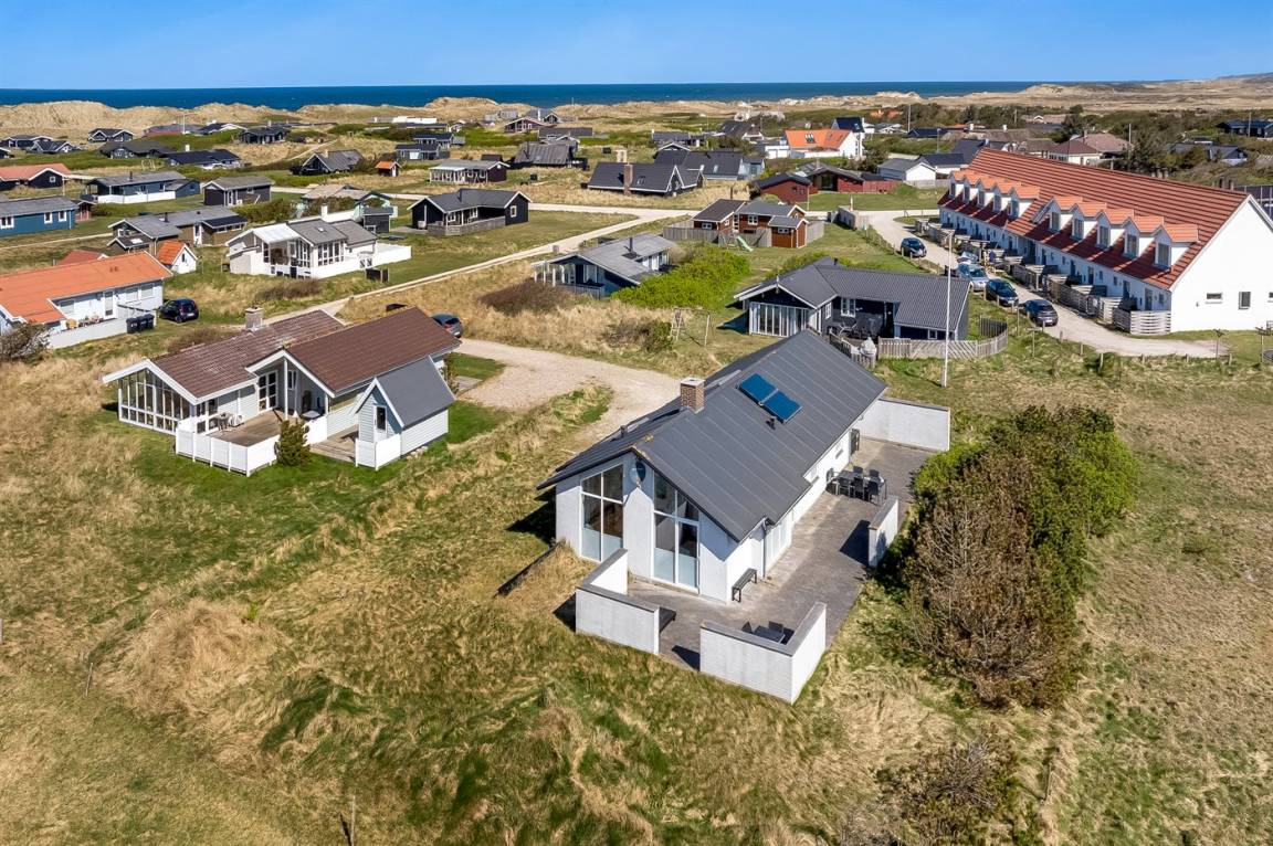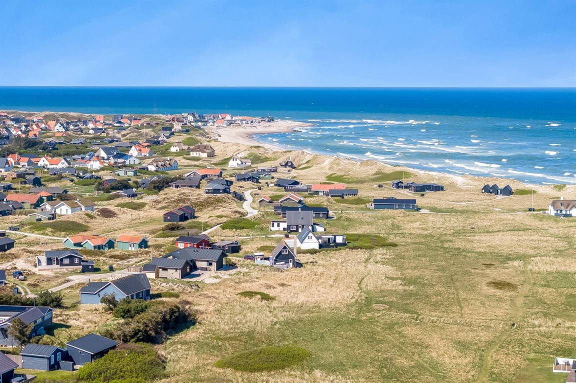 Am Ende einer der Seitenstrassen auf Kobbelsti, auf einem Grundstück das in südlicher Richtung an eine unbebaute Grünfläche angrenzt, liegt dieses schöne und geschmackvoll eingerichtete Ferienhaus aus Stein. Das Haus ist ganzjährig gedämmt und eignet sich daher auch für den Urlaub im Winterhalbjahr. Das Ferienhaus eignet sich für 6 Personen sowie 1 Kleinkind bis zu 3 Jahren. Das Ferienhaus hat eine Wohnfläche von 124 m² und wurde 2012 gebaut. Es stehen Waschmaschine und Wäschetrockner sowie ein Tiefkühlgerät mit einer Kapazität von 70 Liter zur Verfügung. Es sind Solarwärme sowie eine Luft-Luft-Wärmepumpe installiert und es ist ein Kaminofen vorhanden. Für die jüngsten Feriengäste gibt es Kinderhochstuhl, Kinderbett und Babybadewanne. Das Ferienhaus liegt auf einem 1200 m² großen Naturgrundstück. Die Entfernung zum Meer beträgt 300 m – es führt ein Pfad durch das Naturgebiet oder Sie können einen Kiesweg benutzen. Die nächste Einkaufsmöglichkeit liegt 900 m entfernt. Es steht eine 122 m² große, offene und vor dem Wind geschütze Terrasse mit Außenküche und Außendusche zur Verfügung. Außerdem gibt es eine 10 m² große, in Richtung Westen gelegene, überdachte Terrasse. Parkplatz auf dem Grundstück. Die Schlafplätze verteilen sich auf 3 Schlafzimmer; 2 mit Doppelbett und1 mit 2 Einzelbetten. Das Haus ist mit einem offenen Obergeschoss eingerichtet von dem aus Sie den Sternenhimmel betrachten können. Holzböden in 3 der Schlafzimmer. Die Küche ist mit u.a. Kühlschrank, 4 Induktionsmulden, Umluftofen, Mikrowelle sowie Geschirrspüler ausgestattet. Es gibt 2 Badezimmer, beide mit Fußbodenheizung, Dusche und Toilette. Es stehen Sauna und 2-Pers.-Whirlpool zur Verfügung – hier können Sie sich so richtig entspannen. An weiterer Ausstattung können Fernseher (mindestens 4 deutsche und 4 dänische Fernsehsender). DVD-Player, Radio, CD-Player und kabellose Internetverbindung erwähnt werden.
