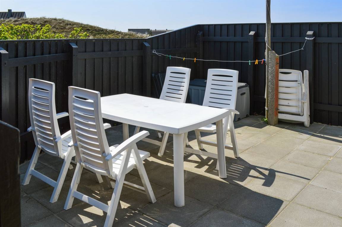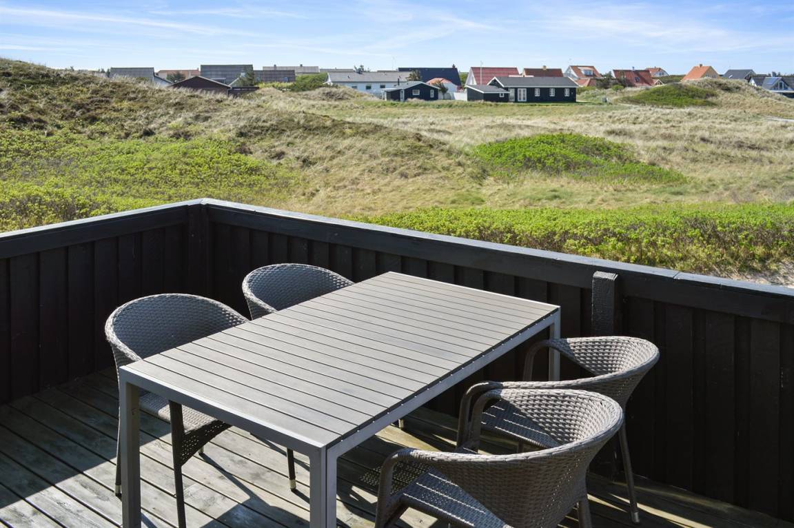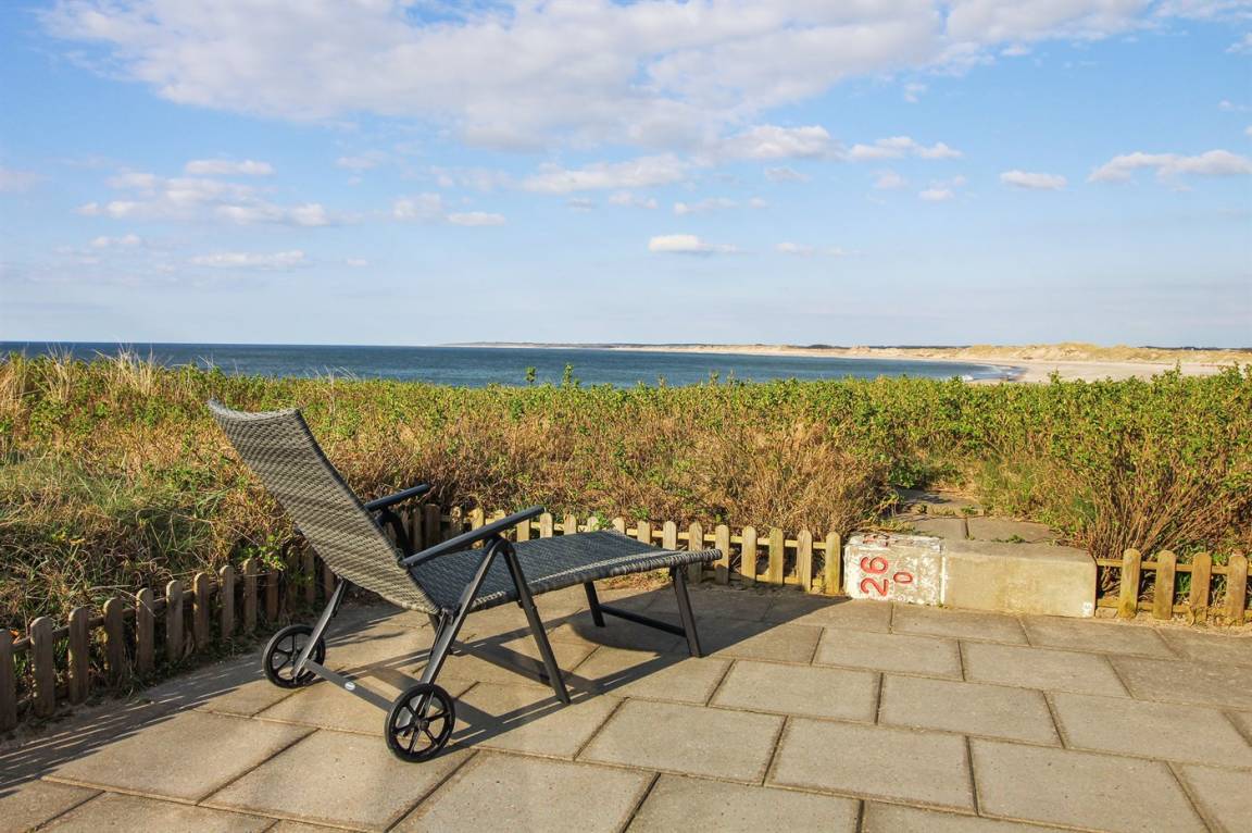 DraußenDie Ferienunterkunft liegt auf einem 1470 m² großen Dünengrundstück. Die Entfernung zum Meer beträgt 50 m. Die nächste Einkaufsmöglichkeit liegt 600 m entfernt. Es steht ein 70 m² Terrassenareal zur Verfügung. Davon insgesamt 30 m² geschlossene Terrasse. Parkplatz auf dem Grundstück.