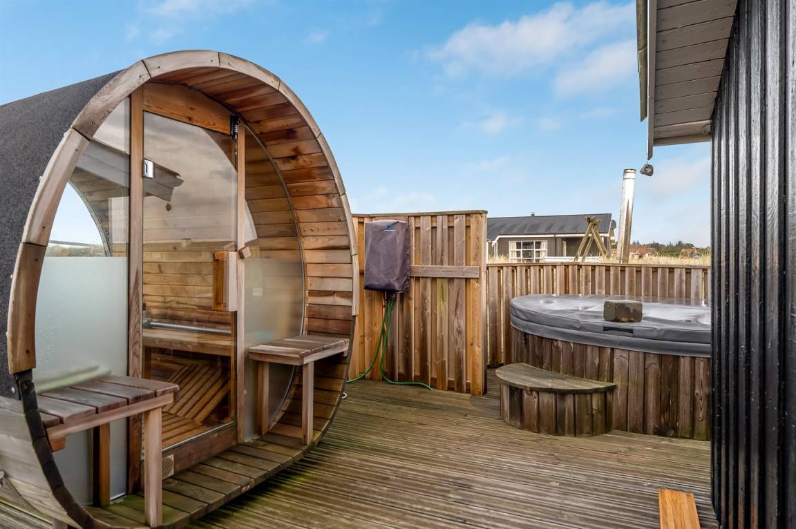DraußenDie Ferienunterkunft liegt auf einem 3000 m² großen Naturgrundstück. Das Grundstück ist eingezäunt. Die Entfernung zum Meer beträgt 500 m. Die nächste Einkaufsmöglichkeit liegt 1000 m entfernt. In einem Abstand von 5000 m gibt es einen Golfplatz. Es steht ein offenes Terrassenareal zur Verfügung. Außerdem gibt es überdachte Terrasse. Außensauna. Es steht ein Grill zur Verfügung. Parkplatz auf dem Grundstück.