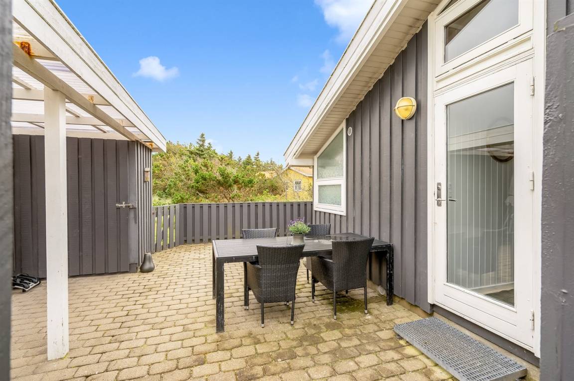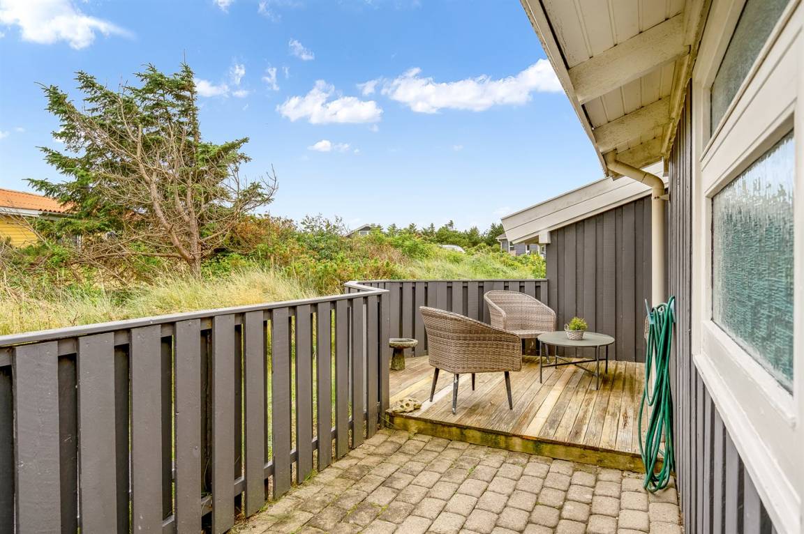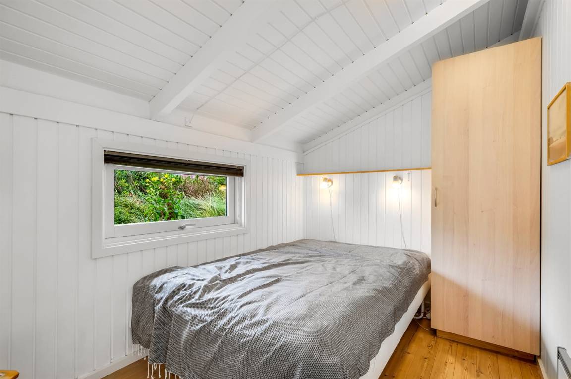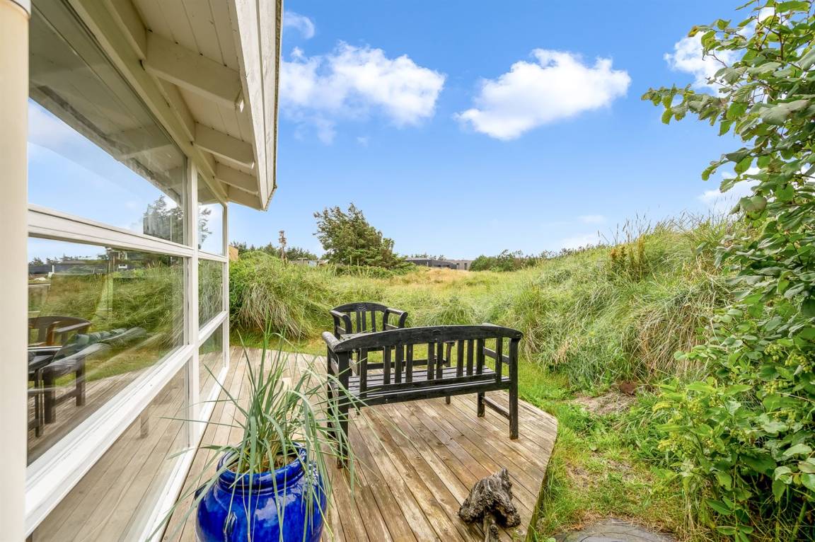 Ein gepflegtes und ruhig gelegenes Ferienhaus auf einem leicht hügeligen Naturgrundstück am Møllebakken. Zum Haus gehören eine zum Teil überdachte, südwestlich gelegene Terrasse sowie eine große Morgenterrasse (beide mit Windschutz).