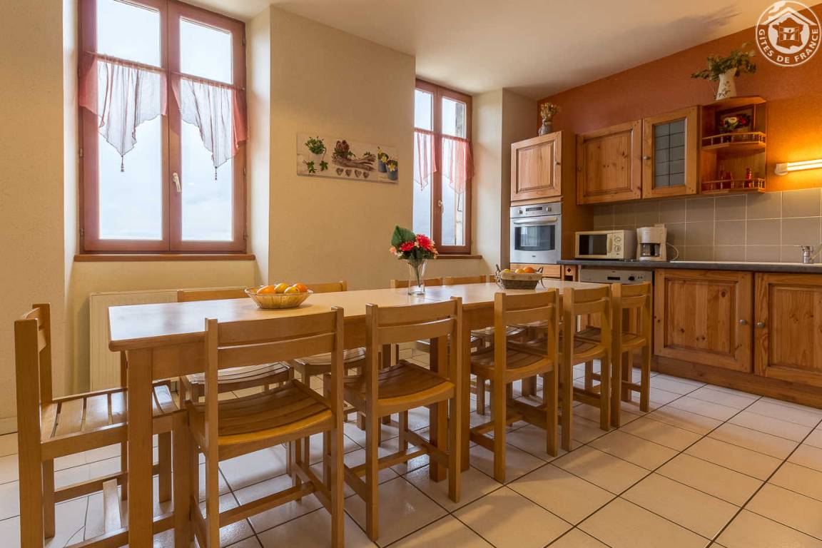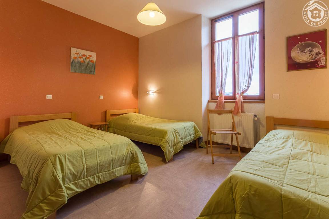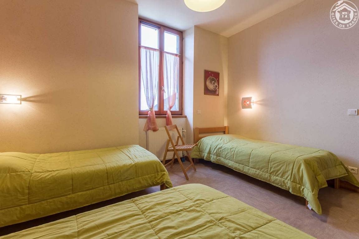 3 Gîtes und Mehrzweckraum im Gebäude. Ferienhaus im 1. Stock (Außentreppe): Wohnküche-Wohnzimmer, 4 Schlafzimmer (1 Doppelbett 140 x 190 cm / 2 Einzelbetten 9 x 190 cm / 3 Einzelbetten 9 x 190 cm / 1 Doppelbett 140 x 190). cm), Badezimmer (Badewanne), Duschbad (Dusche), separates WC. Zentralheizung, Terrasse, Gemeinschaftsgrundstück mit Kegelbahn in 100 m Entfernung, Gemeinschaftsparkplatz unterhalb des Ferienhauses.
