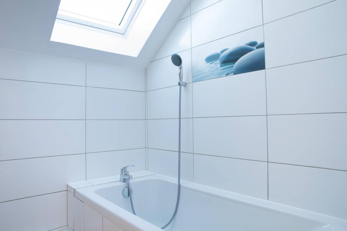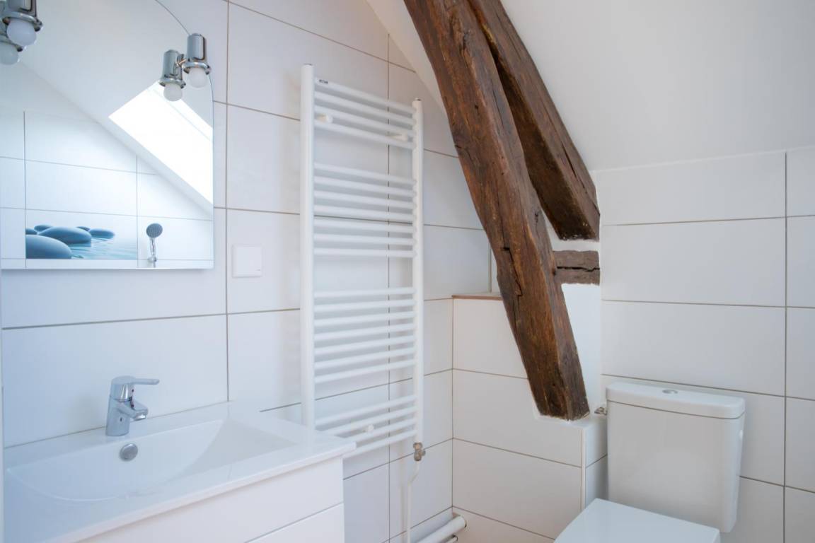 Obergeschoss: 1 Schlafzimmer mit einem Doppelbett (140 cm) und eigenem Duschbad mit WC sowie 1 Schlafzimmer mit 2 Einzelbetten (90 cm) und eigenem Bad mit WC.