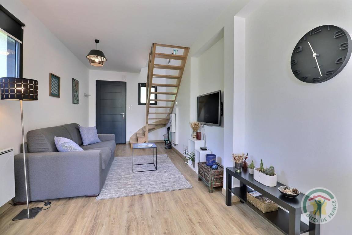 Im Erdgeschoss: Wohnzimmer mit Küche, die auf eine Terrasse und einen Loungebereich mit einem Schlafsofa 140 x 190 für zwei Betten führt. Obergeschoss: ein Schlafzimmer mit einem 160 x 200 Bett, das in zwei Einzelbetten umgewandelt werden kann, und ein Duschbad mit WC. Bettwäsche und Handtücher werden gestellt. Elektroheizung im Preis inbegriffen. Private Parkplätze auf dem Grundstück.