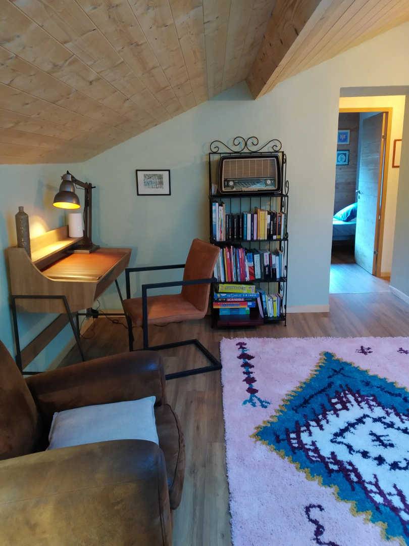 Im Obergeschoss finden Sie einen Entspannungs- und Lesebereich mit Schreibtisch, ein Schlafzimmer mit einem Queensize-Bett (160 cm) und Bergblick, ein großes Badezimmer mit Doppelwaschbecken und ein separates WC.