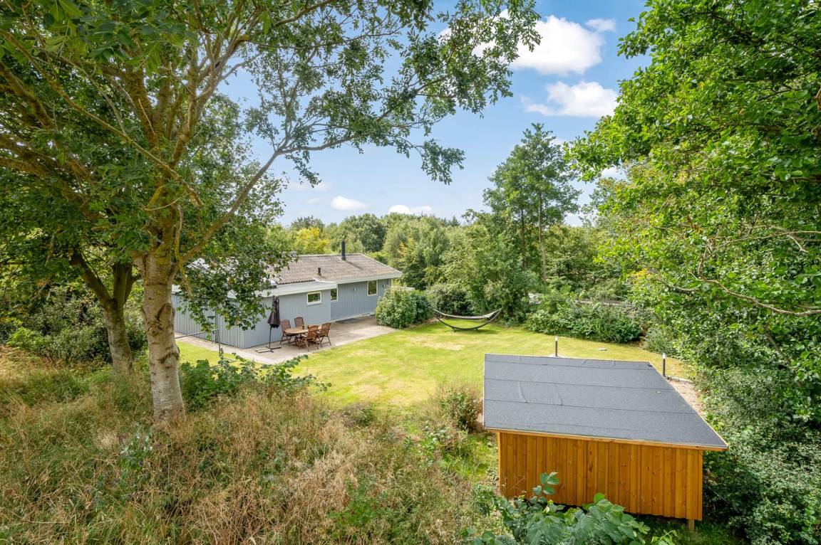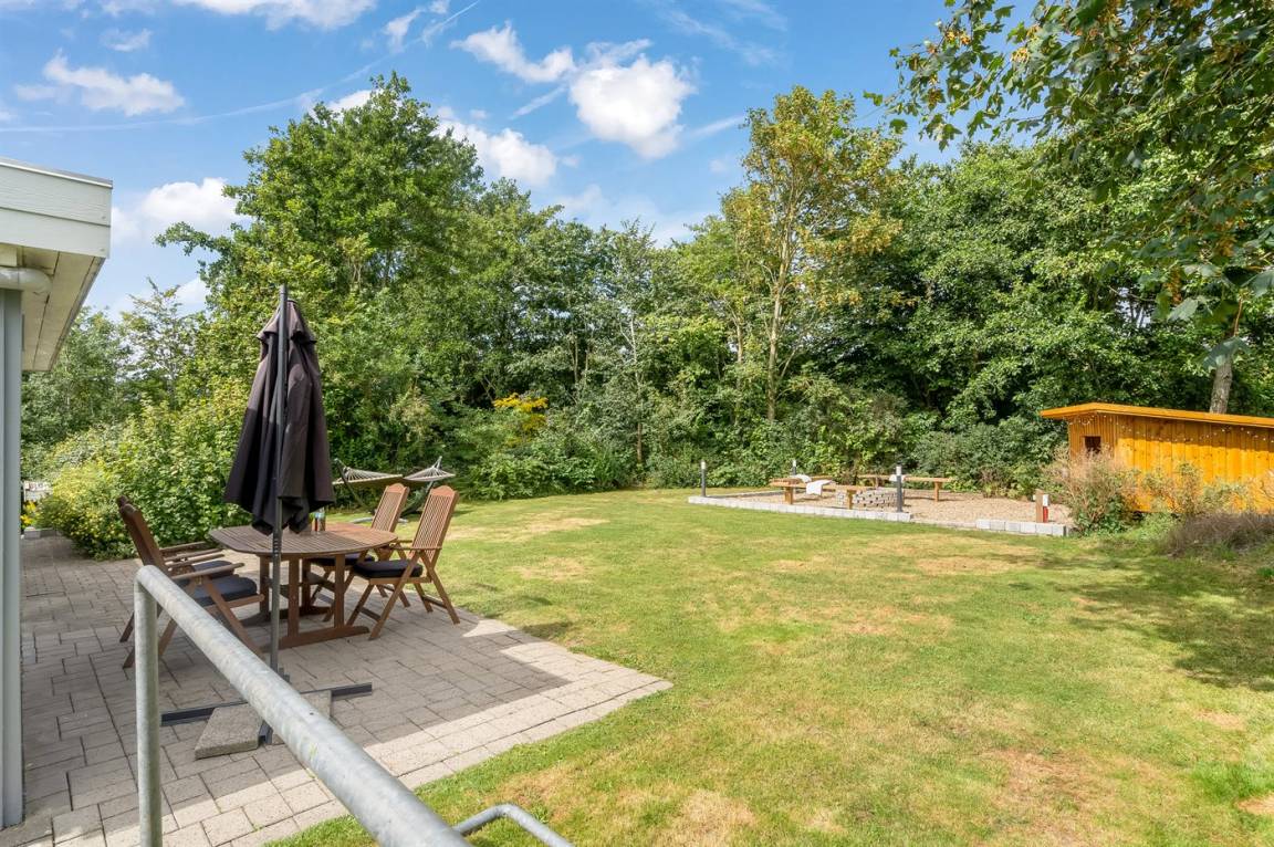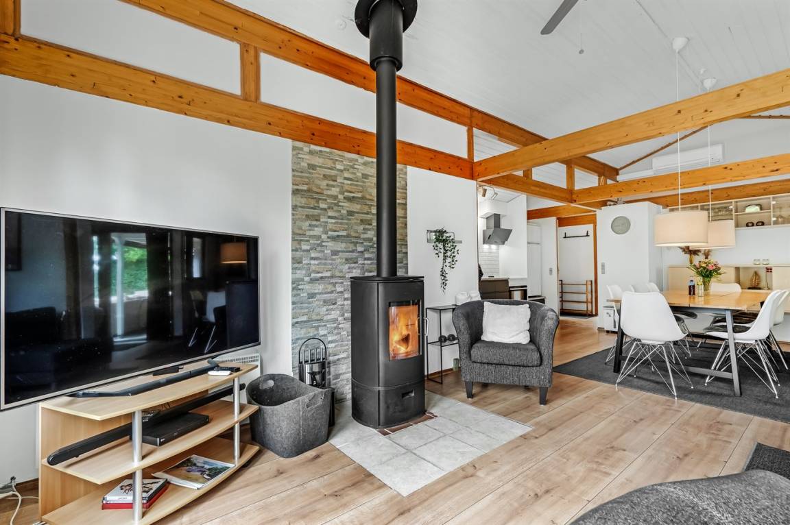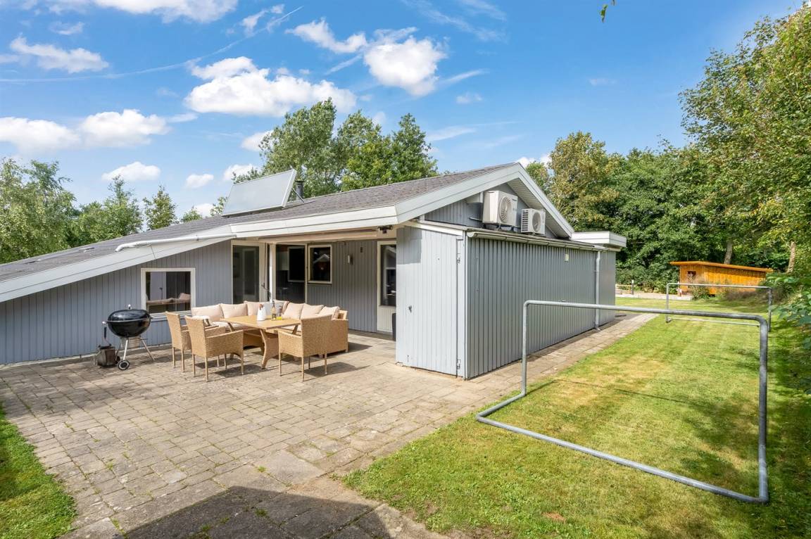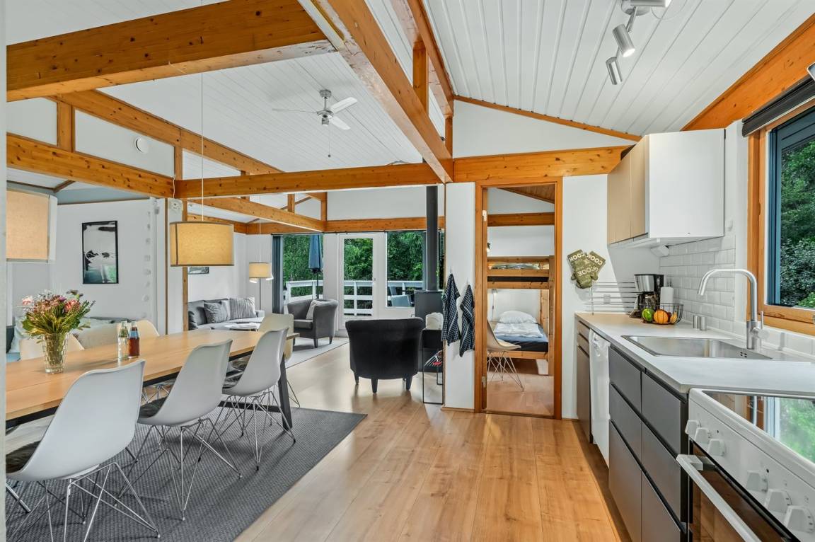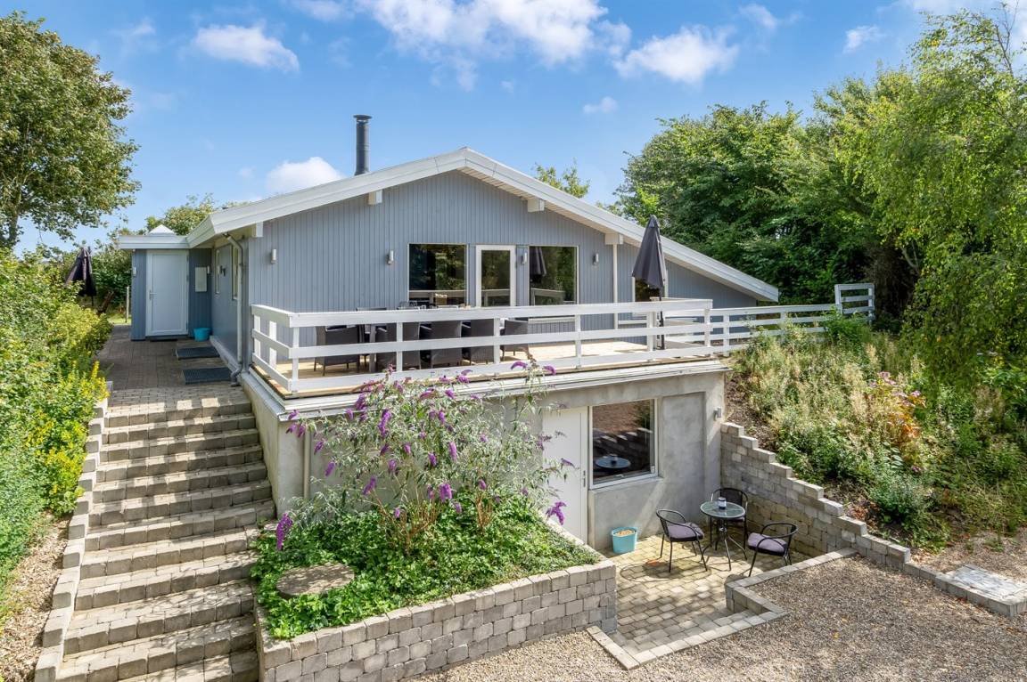 Dieses schöne, neu renovierte Ferienhaus, mit 4 Schlafzimmer und 2 Badezimmer, liegt in einem ruhigen Ferienhausgebiet. Das Haus, mit Hanglage, wurde 2020/21 völlig renoviert. Es gibt eine schöne Wohnküche mit Decken bis zum First, Wärmepumpe und Zugang zu der überdachten Terrasse. Wohnzimmer mit Kaminofen und Zugang zur Aussichtsterrasse, von wo aus Sie den Ausblick auf das Gebiet genießen können. Es gibt 2 schöne Badezimmer, beide mit großer Duschnische, beheizbare Klinkerböden und Badezimmermöbel. In dem einen Badezimmer stehen außerdem Waschmaschine und Wäschetrockner zur Verfügung. Die Schlafplätze verteilen sich auf 4 gute Zimmer; 1 mit Etagenbett, 1 mit 2 Einzelbetten, 1 mit Doppelbett und Ausgang zu der überdachten Terrasse sowie 1 extra großes Zimmer mit Doppelbett und Oberlichtfenster. Internetverbindung mit 150/150 Mbit. Schöne Diele und Flur. Das 70 m² große Kellergeschoss ist mit u. a. Billardtisch, Tischtennis, Tischfußball und Heimkino eingerichtet.