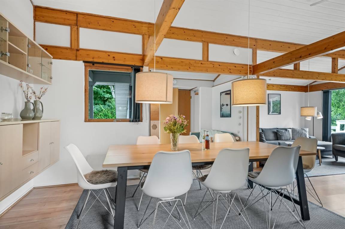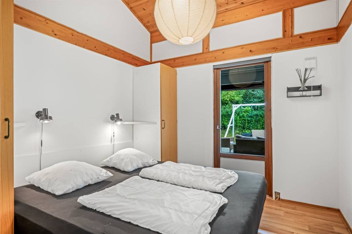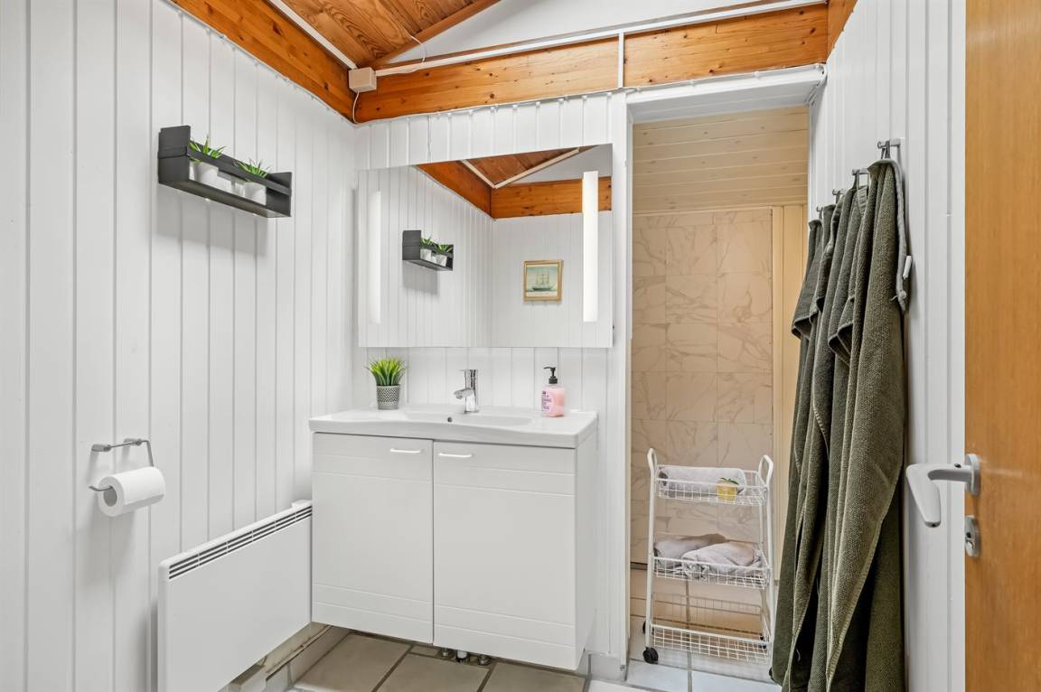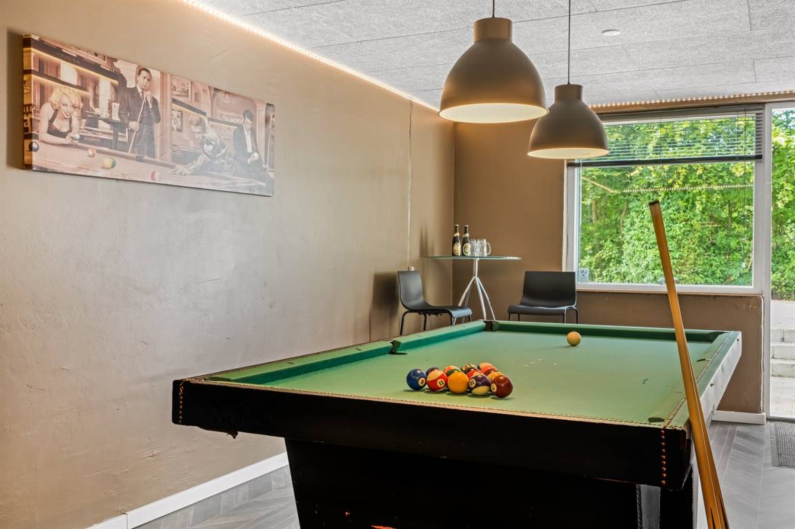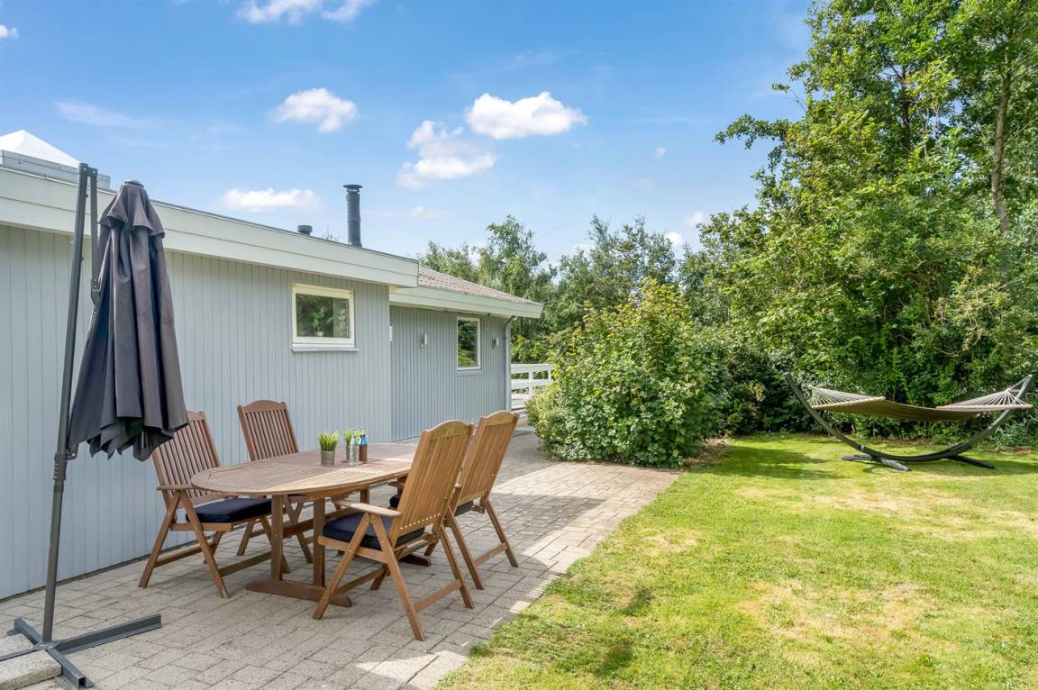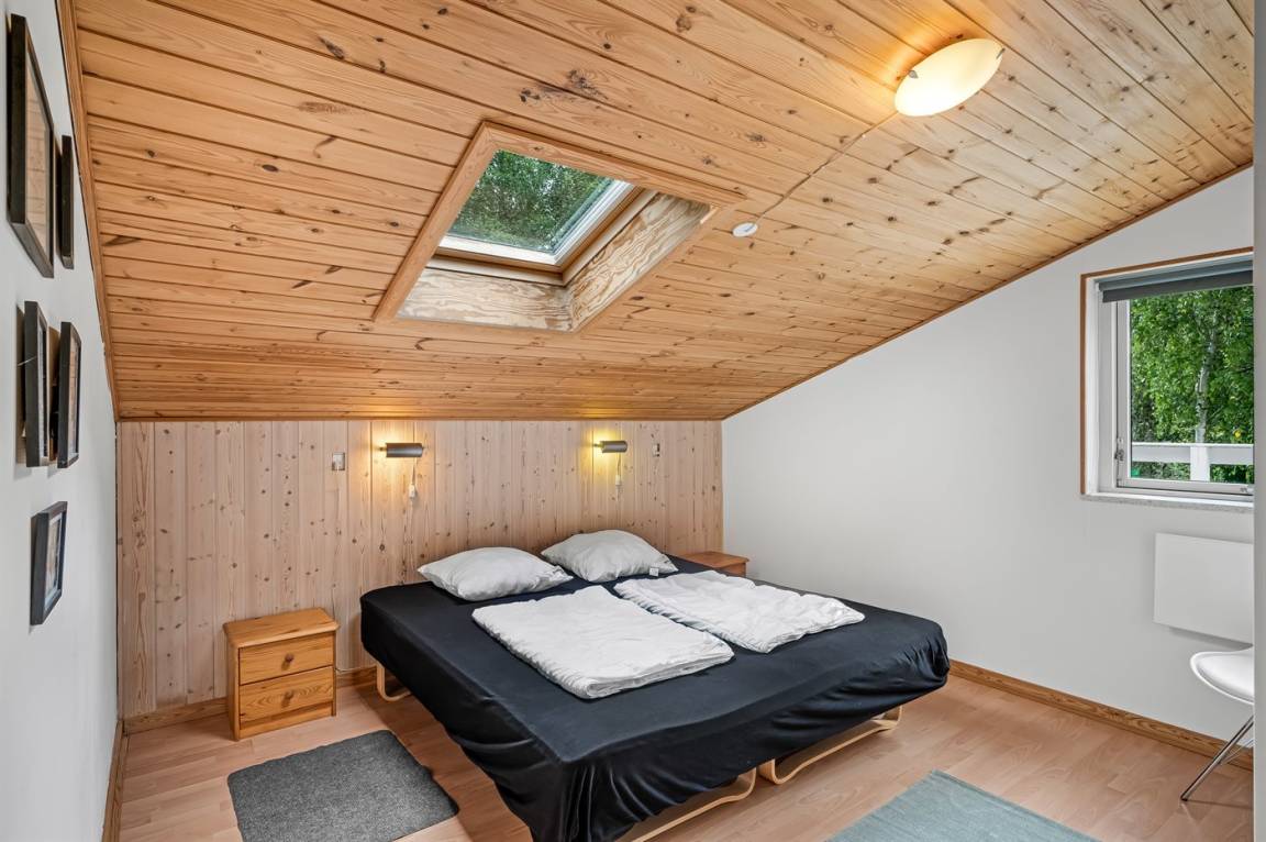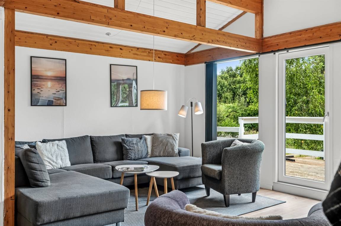 Dieses schöne, neu renovierte Ferienhaus, mit 4 Schlafzimmer und 2 Badezimmer, liegt in einem ruhigen Ferienhausgebiet. Das Haus, mit Hanglage, wurde 2020/21 völlig renoviert. Es gibt eine schöne Wohnküche mit Decken bis zum First, Wärmepumpe und Zugang zu der überdachten Terrasse. Wohnzimmer mit Kaminofen und Zugang zur Aussichtsterrasse, von wo aus Sie den Ausblick auf das Gebiet genießen können. Es gibt 2 schöne Badezimmer, beide mit großer Duschnische, beheizbare Klinkerböden und Badezimmermöbel. In dem einen Badezimmer stehen außerdem Waschmaschine und Wäschetrockner zur Verfügung. Die Schlafplätze verteilen sich auf 4 gute Zimmer; 1 mit Etagenbett, 1 mit 2 Einzelbetten, 1 mit Doppelbett und Ausgang zu der überdachten Terrasse sowie 1 extra großes Zimmer mit Doppelbett und Oberlichtfenster. Internetverbindung mit 150/150 Mbit. Schöne Diele und Flur. Das 70 m² große Kellergeschoss ist mit u. a. Billardtisch, Tischtennis, Tischfußball und Heimkino eingerichtet.