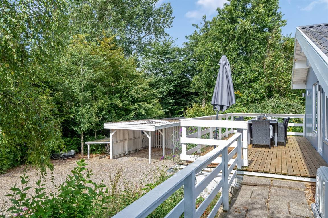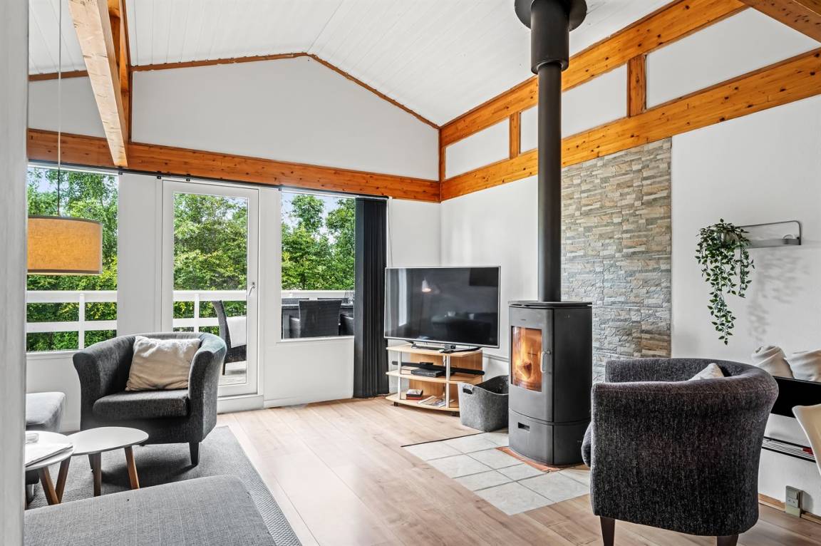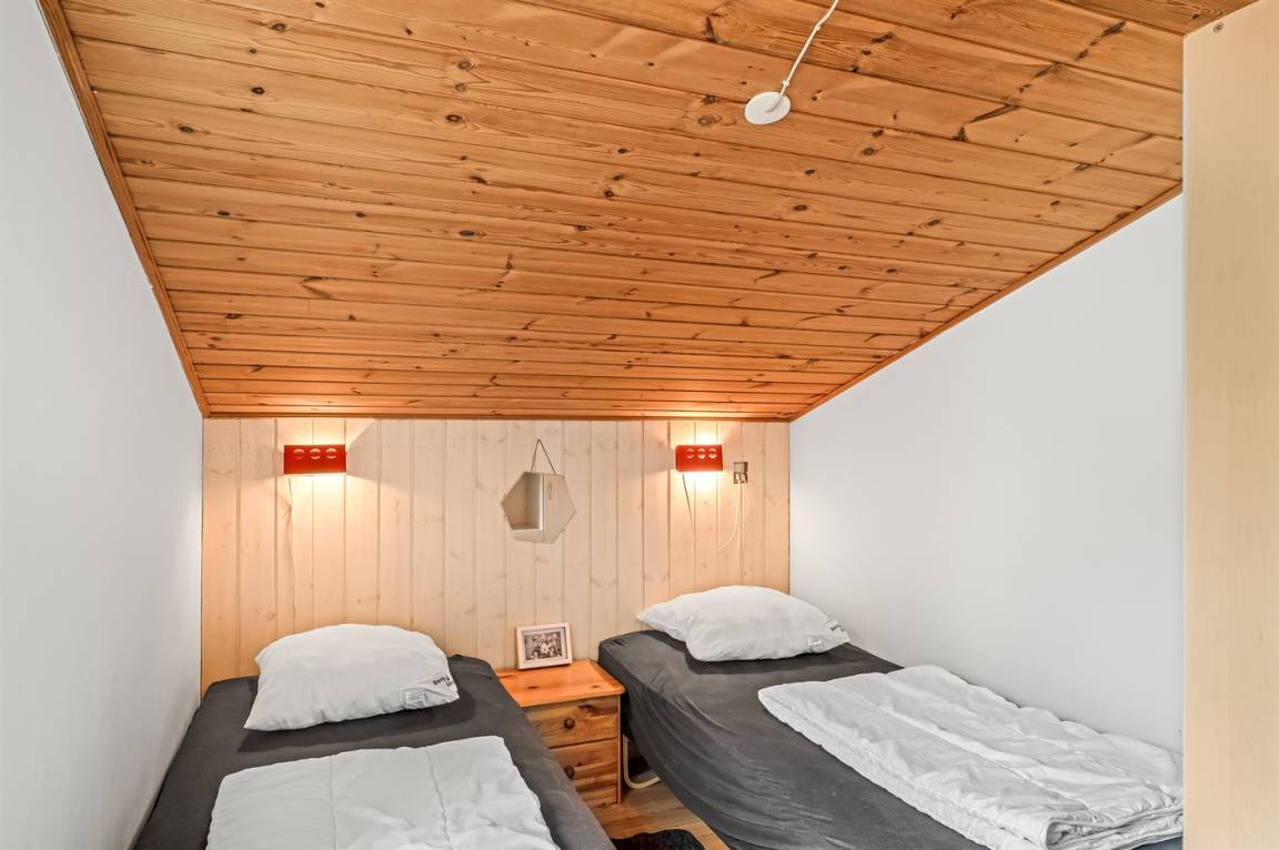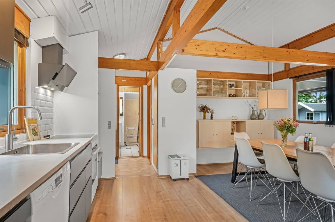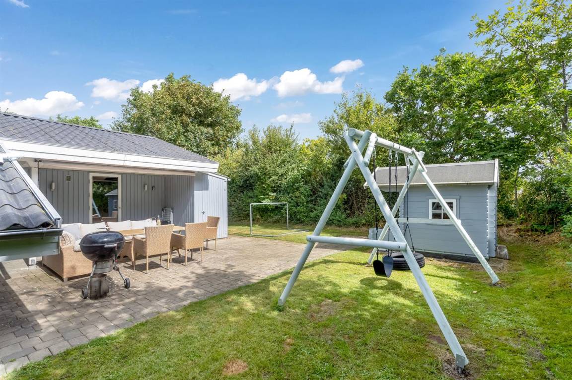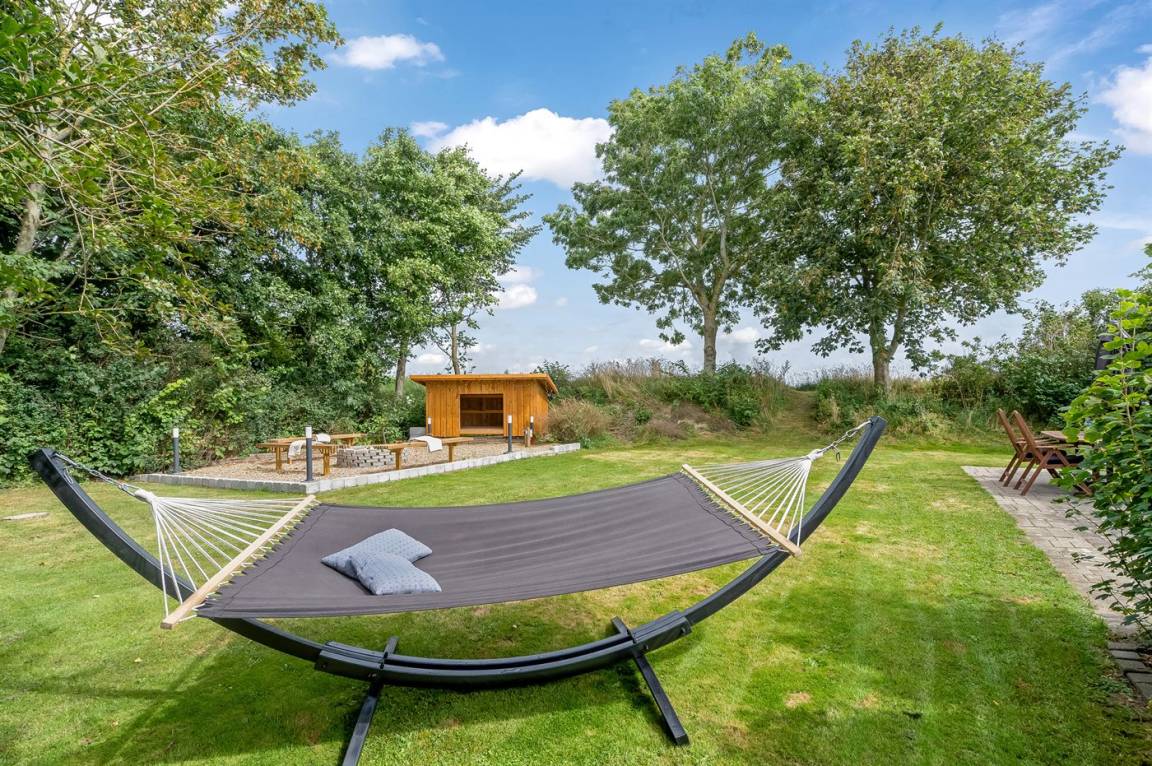 Dieses schöne, neu renovierte Ferienhaus, mit 4 Schlafzimmer und 2 Badezimmer, liegt in einem ruhigen Ferienhausgebiet. Das Haus, mit Hanglage, wurde 2020/21 völlig renoviert. Es gibt eine schöne Wohnküche mit Decken bis zum First, Wärmepumpe und Zugang zu der überdachten Terrasse. Wohnzimmer mit Kaminofen und Zugang zur Aussichtsterrasse, von wo aus Sie den Ausblick auf das Gebiet genießen können. Es gibt 2 schöne Badezimmer, beide mit großer Duschnische, beheizbare Klinkerböden und Badezimmermöbel. In dem einen Badezimmer stehen außerdem Waschmaschine und Wäschetrockner zur Verfügung. Die Schlafplätze verteilen sich auf 4 gute Zimmer; 1 mit Etagenbett, 1 mit 2 Einzelbetten, 1 mit Doppelbett und Ausgang zu der überdachten Terrasse sowie 1 extra großes Zimmer mit Doppelbett und Oberlichtfenster. Internetverbindung mit 150/150 Mbit. Schöne Diele und Flur. Das 70 m² große Kellergeschoss ist mit u. a. Billardtisch, Tischtennis, Tischfußball und Heimkino eingerichtet.