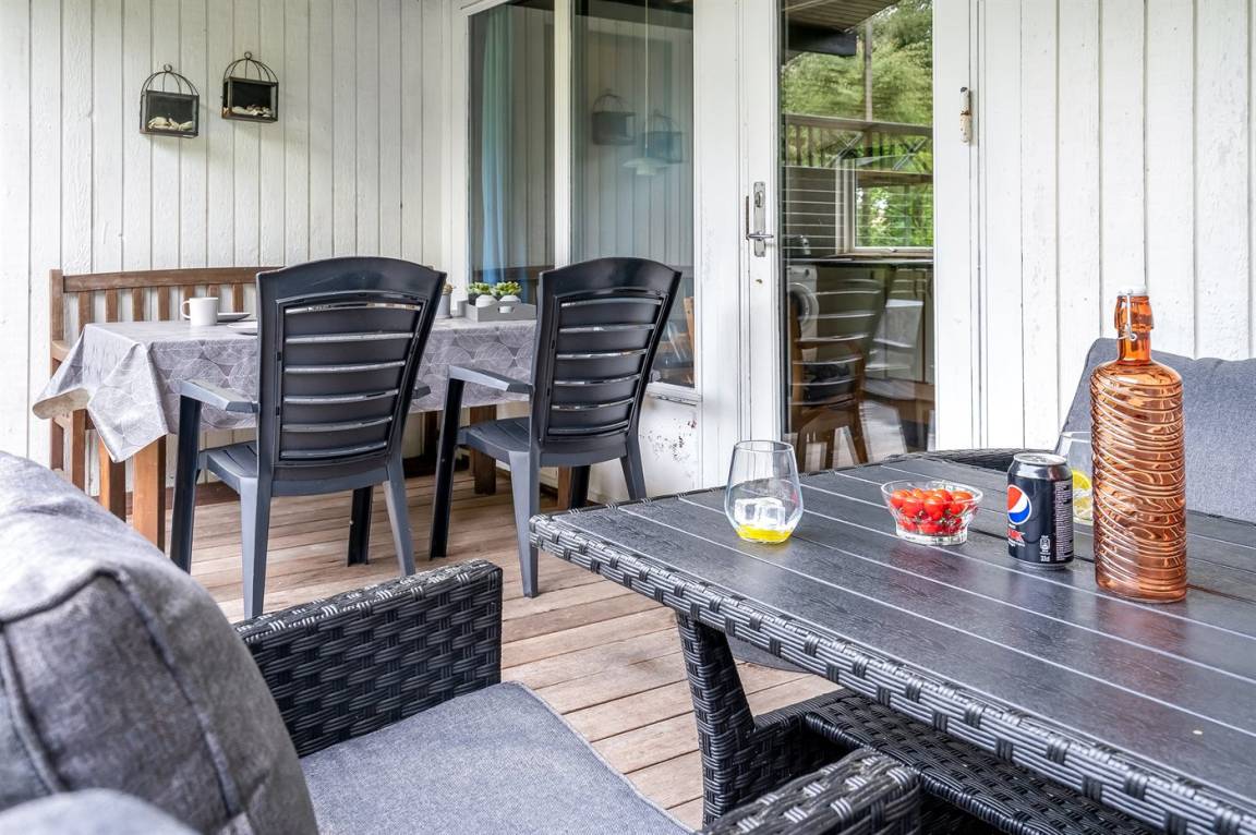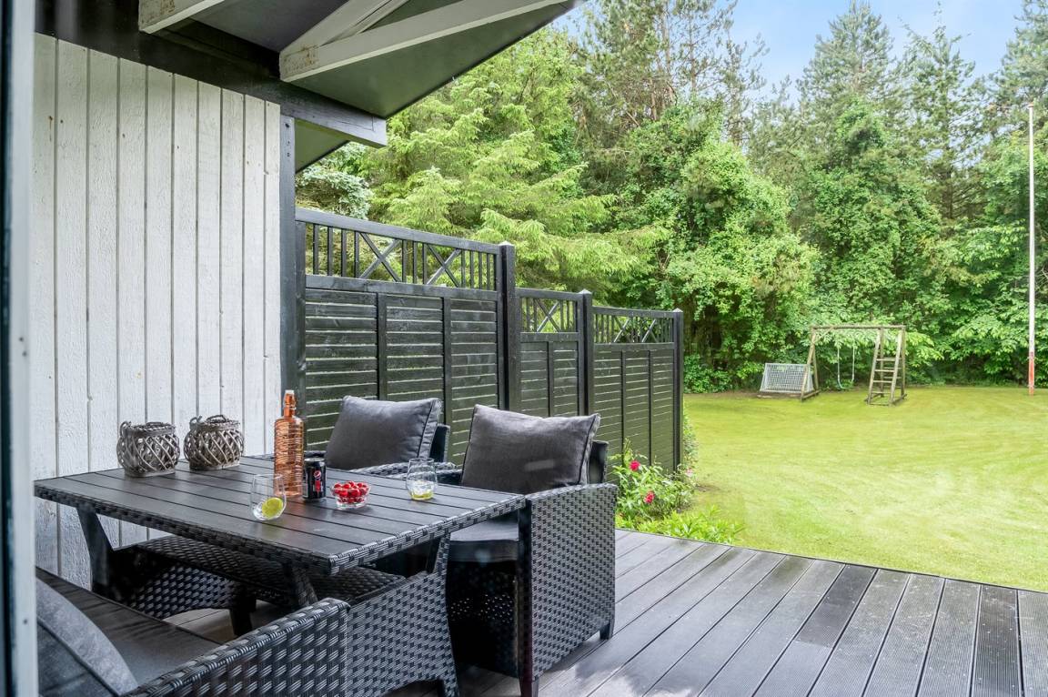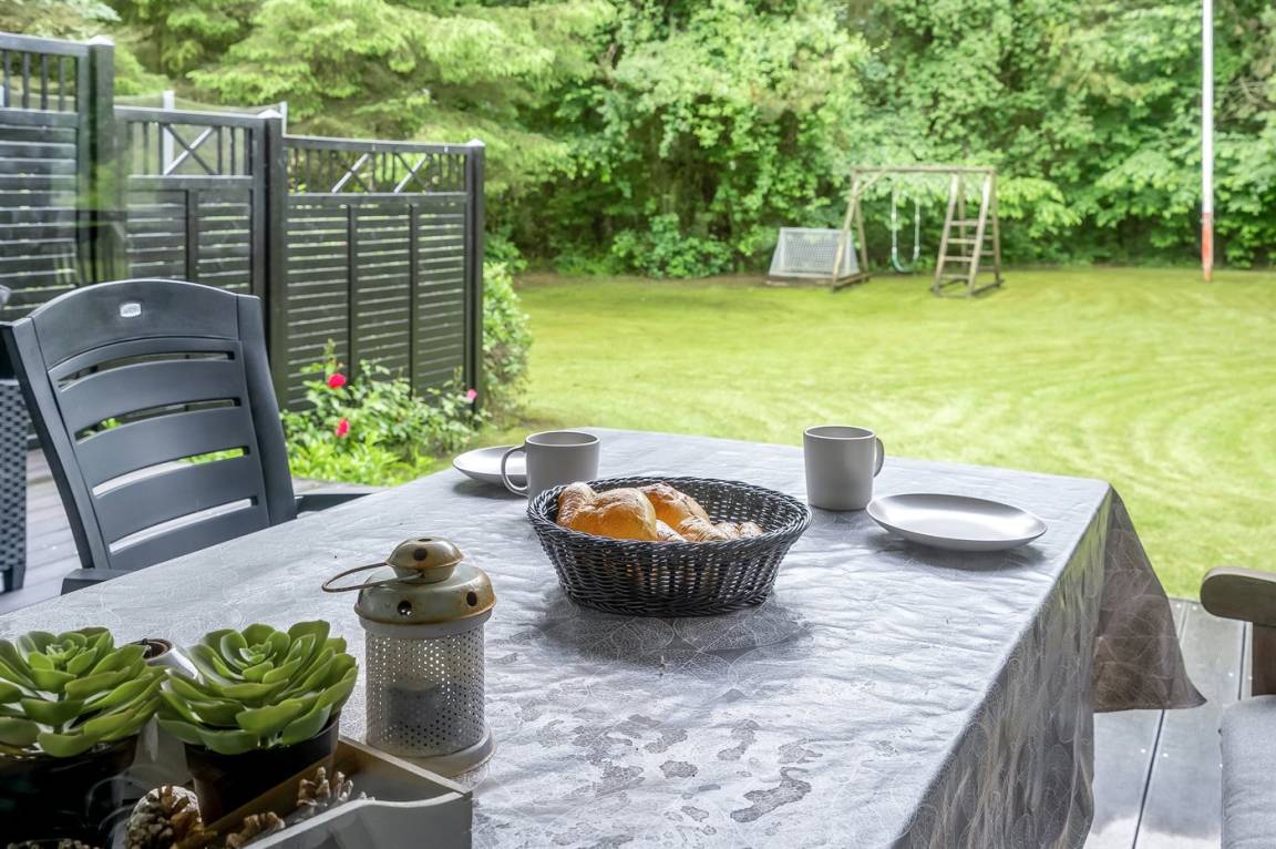 Hier gibt es besonders gute Rahmen für das gemütliche Beisammensein - sowohl drinnen als auch draußen. Genieße Stunden im Freien auf der großen, nach Südwesten ausgerichteten Terrasse, wo man sich ungestört aufhalten, die Sonne, ein gutes Buch oder eine Tasse Kaffee genießen kann.