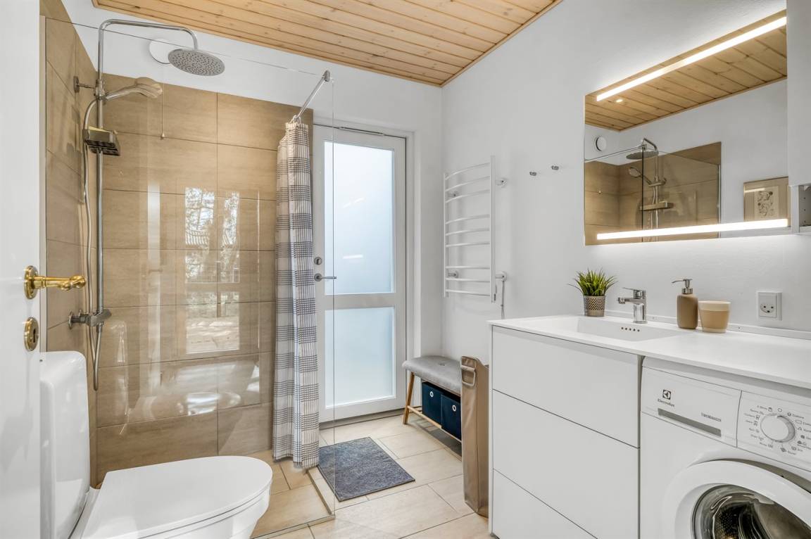 Das Haus hat ein Badezimmer mit Dusche sowie ein zusätzliches Gäste-WC. Für Wärme und Komfort sorgen ein Kaminofen und eine energiesparende Wärmepumpe. Eine Waschmaschine ist ebenfalls vorhanden.