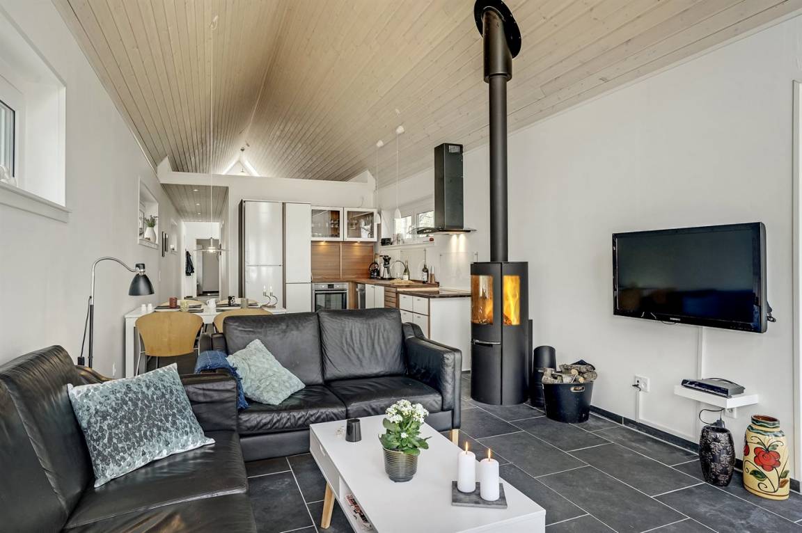 DraußenDie Ferienunterkunft liegt auf einem 2000 m² großen Naturgrundstück. Die Entfernung zum Fjord beträgt 80 m. Die nächste Einkaufsmöglichkeit liegt 4000 m entfernt. Es steht ein 25 m² Terrassenareal zur Verfügung. Die Entfernung zu einem Spielplatz beträgt 50 m.Lagerfeuerstelle. Parkplatz auf dem Grundstück.