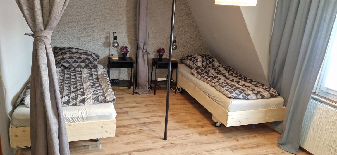 Das kleine Schlafzimmer mit zwei Einzelbetten 0,9m*2m ist ein Durchgangszimmer zum zweiten Schlafzimmer.
