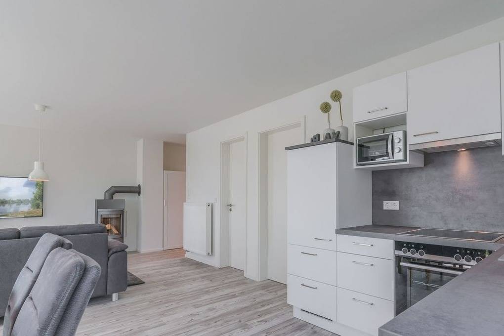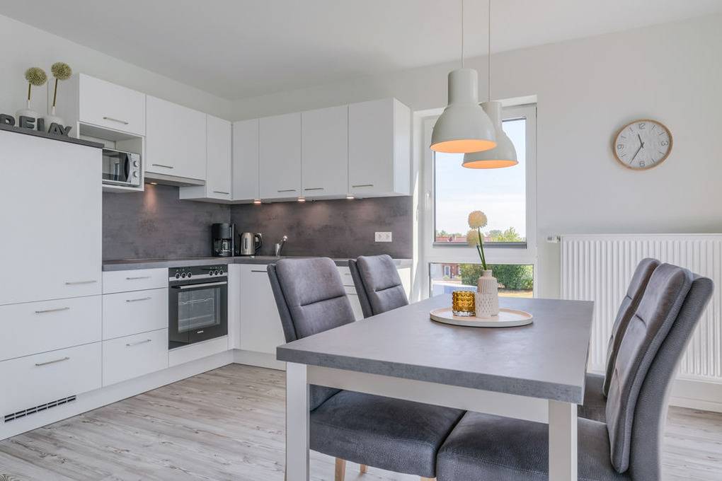 In der komfortablen Einbauküche finden Sie alles, was Sie zum Zubereiten Ihrer Lieblingsspeisen benötigen und während Sie bei einem aromatischen Kaffee Ihr Frühstückstoast genießen, begleitet Sie die aufgehende Sonne durch die ebenfalls bodentiefen Fenster nach Osten und Süden bis in den späten Nachmittag hinein.